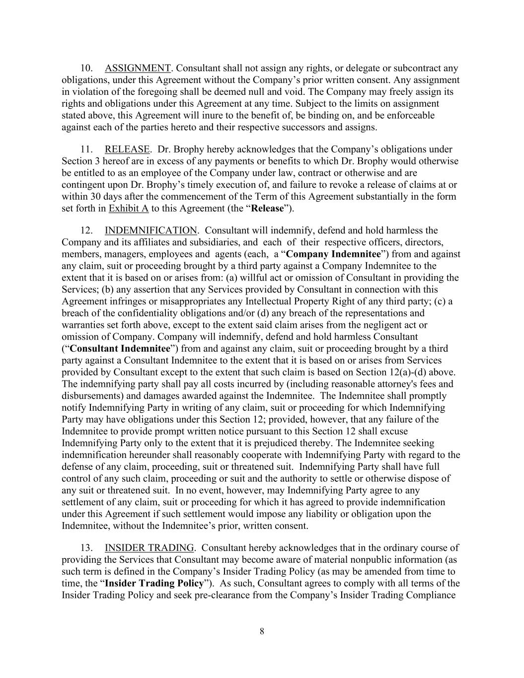 8 10. ASSIGNMENT. Consultant shall not assign any rights, or delegate or subcontract any obligations, under this Agreement without the Company’s prior written consent. Any assignment in violation of the foregoing shall be deemed null and void. The Company may freely assign its rights and obligations under this Agreement at any time. Subject to the limits on assignment stated above, this Agreement will inure to the benefit of, be binding on, and be enforceable against each of the parties hereto and their respective successors and assigns. 11. RELEASE. Dr. Brophy hereby acknowledges that the Company’s obligations under Section 3 hereof are in excess of any payments or benefits to which Dr. Brophy would otherwise be entitled to as an employee of the Company under law, contract or otherwise and are contingent upon Dr. Brophy’s timely execution of, and failure to revoke a release of claims at or within 30 days after the commencement of the Term of this Agreement substantially in the form set forth in Exhibit A to this Agreement (the “Release”). 12. INDEMNIFICATION. Consultant will indemnify, defend and hold harmless the Company and its affiliates and subsidiaries, and each of their respective officers, directors, members, managers, employees and agents (each, a “Company Indemnitee”) from and against any claim, suit or proceeding brought by a third party against a Company Indemnitee to the extent that it is based on or arises from: (a) willful act or omission of Consultant in providing the Services; (b) any assertion that any Services provided by Consultant in connection with this Agreement infringes or misappropriates any Intellectual Property Right of any third party; (c) a breach of the confidentiality obligations and/or (d) any breach of the representations and warranties set forth above, except to the extent said claim arises from the negligent act or omission of Company. Company will indemnify, defend and hold harmless Consultant (“Consultant Indemnitee”) from and against any claim, suit or proceeding brought by a third party against a Consultant Indemnitee to the extent that it is based on or arises from Services provided by Consultant except to the extent that such claim is based on Section 12(a)-(d) above. The indemnifying party shall pay all costs incurred by (including reasonable attorney's fees and disbursements) and damages awarded against the Indemnitee. The Indemnitee shall promptly notify Indemnifying Party in writing of any claim, suit or proceeding for which Indemnifying Party may have obligations under this Section 12; provided, however, that any failure of the Indemnitee to provide prompt written notice pursuant to this Section 12 shall excuse Indemnifying Party only to the extent that it is prejudiced thereby. The Indemnitee seeking indemnification hereunder shall reasonably cooperate with Indemnifying Party with regard to the defense of any claim, proceeding, suit or threatened suit. Indemnifying Party shall have full control of any such claim, proceeding or suit and the authority to settle or otherwise dispose of any suit or threatened suit. In no event, however, may Indemnifying Party agree to any settlement of any claim, suit or proceeding for which it has agreed to provide indemnification under this Agreement if such settlement would impose any liability or obligation upon the Indemnitee, without the Indemnitee’s prior, written consent. 13. INSIDER TRADING. Consultant hereby acknowledges that in the ordinary course of providing the Services that Consultant may become aware of material nonpublic information (as such term is defined in the Company’s Insider Trading Policy (as may be amended from time to time, the “Insider Trading Policy”). As such, Consultant agrees to comply with all terms of the Insider Trading Policy and seek pre-clearance from the Company’s Insider Trading Compliance