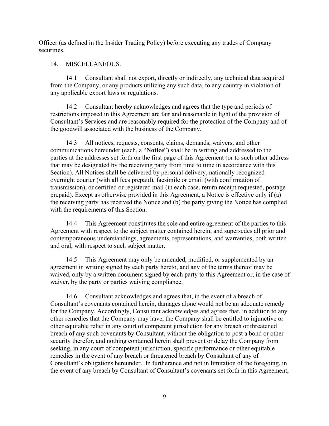 9 Officer (as defined in the Insider Trading Policy) before executing any trades of Company securities. 14. MISCELLANEOUS. 14.1 Consultant shall not export, directly or indirectly, any technical data acquired from the Company, or any products utilizing any such data, to any country in violation of any applicable export laws or regulations. 14.2 Consultant hereby acknowledges and agrees that the type and periods of restrictions imposed in this Agreement are fair and reasonable in light of the provision of Consultant’s Services and are reasonably required for the protection of the Company and of the goodwill associated with the business of the Company. 14.3 All notices, requests, consents, claims, demands, waivers, and other communications hereunder (each, a “Notice”) shall be in writing and addressed to the parties at the addresses set forth on the first page of this Agreement (or to such other address that may be designated by the receiving party from time to time in accordance with this Section). All Notices shall be delivered by personal delivery, nationally recognized overnight courier (with all fees prepaid), facsimile or email (with confirmation of transmission), or certified or registered mail (in each case, return receipt requested, postage prepaid). Except as otherwise provided in this Agreement, a Notice is effective only if (a) the receiving party has received the Notice and (b) the party giving the Notice has complied with the requirements of this Section. 14.4 This Agreement constitutes the sole and entire agreement of the parties to this Agreement with respect to the subject matter contained herein, and supersedes all prior and contemporaneous understandings, agreements, representations, and warranties, both written and oral, with respect to such subject matter. 14.5 This Agreement may only be amended, modified, or supplemented by an agreement in writing signed by each party hereto, and any of the terms thereof may be waived, only by a written document signed by each party to this Agreement or, in the case of waiver, by the party or parties waiving compliance. 14.6 Consultant acknowledges and agrees that, in the event of a breach of Consultant’s covenants contained herein, damages alone would not be an adequate remedy for the Company. Accordingly, Consultant acknowledges and agrees that, in addition to any other remedies that the Company may have, the Company shall be entitled to injunctive or other equitable relief in any court of competent jurisdiction for any breach or threatened breach of any such covenants by Consultant, without the obligation to post a bond or other security therefor, and nothing contained herein shall prevent or delay the Company from seeking, in any court of competent jurisdiction, specific performance or other equitable remedies in the event of any breach or threatened breach by Consultant of any of Consultant’s obligations hereunder. In furtherance and not in limitation of the foregoing, in the event of any breach by Consultant of Consultant’s covenants set forth in this Agreement,