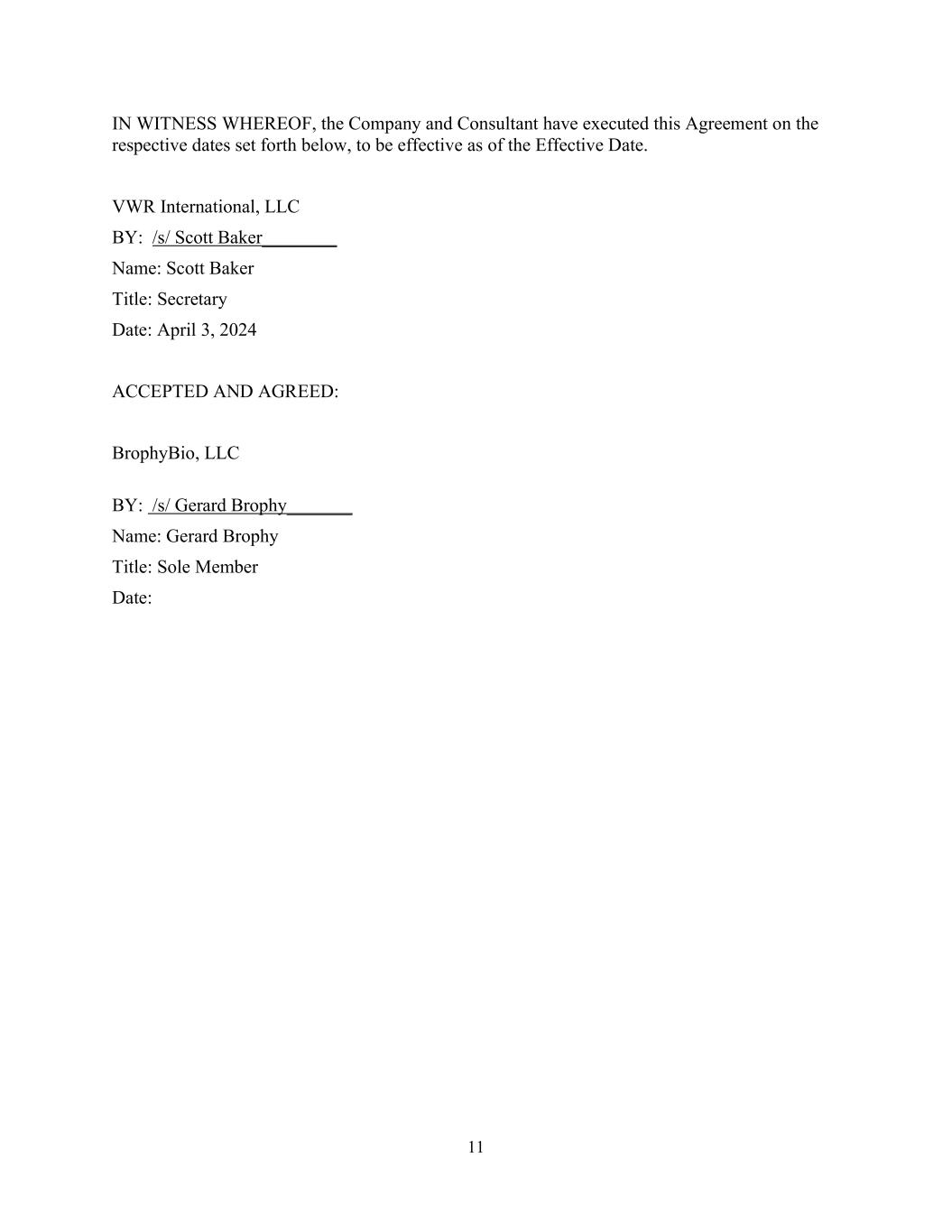 11 IN WITNESS WHEREOF, the Company and Consultant have executed this Agreement on the respective dates set forth below, to be effective as of the Effective Date. VWR International, LLC BY: /s/ Scott Baker________ Name: Scott Baker Title: Secretary Date: April 3, 2024 ACCEPTED AND AGREED: BrophyBio, LLC BY: /s/ Gerard Brophy_______ Name: Gerard Brophy Title: Sole Member Date: