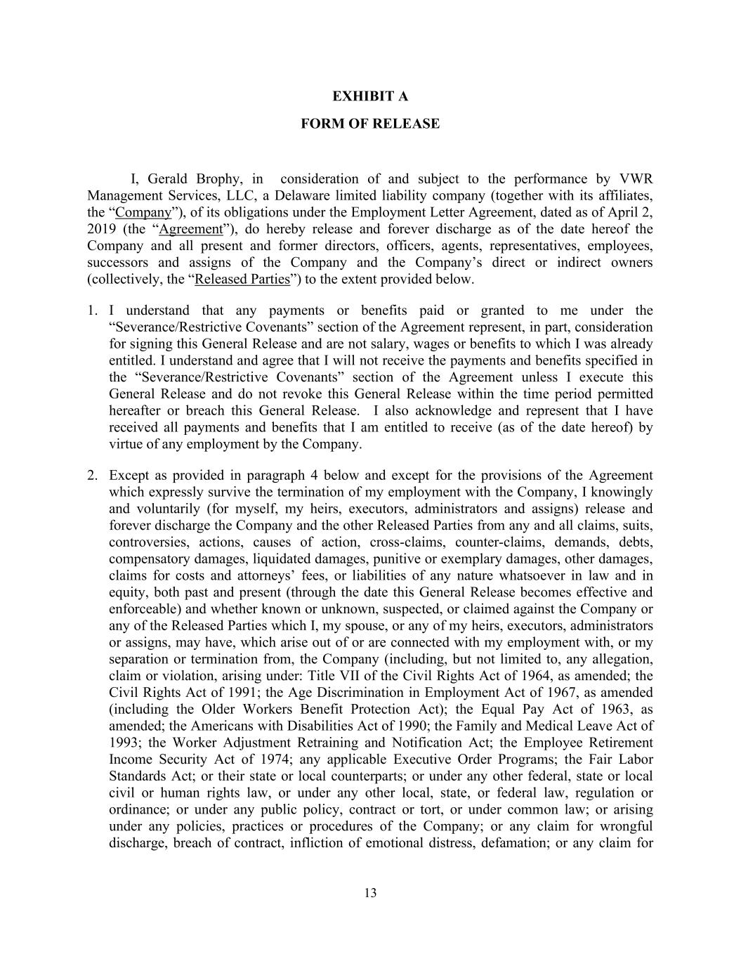 13 EXHIBIT A FORM OF RELEASE I, Gerald Brophy, in consideration of and subject to the performance by VWR Management Services, LLC, a Delaware limited liability company (together with its affiliates, the “Company”), of its obligations under the Employment Letter Agreement, dated as of April 2, 2019 (the “Agreement”), do hereby release and forever discharge as of the date hereof the Company and all present and former directors, officers, agents, representatives, employees, successors and assigns of the Company and the Company’s direct or indirect owners (collectively, the “Released Parties”) to the extent provided below. 1. I understand that any payments or benefits paid or granted to me under the “Severance/Restrictive Covenants” section of the Agreement represent, in part, consideration for signing this General Release and are not salary, wages or benefits to which I was already entitled. I understand and agree that I will not receive the payments and benefits specified in the “Severance/Restrictive Covenants” section of the Agreement unless I execute this General Release and do not revoke this General Release within the time period permitted hereafter or breach this General Release. I also acknowledge and represent that I have received all payments and benefits that I am entitled to receive (as of the date hereof) by virtue of any employment by the Company. 2. Except as provided in paragraph 4 below and except for the provisions of the Agreement which expressly survive the termination of my employment with the Company, I knowingly and voluntarily (for myself, my heirs, executors, administrators and assigns) release and forever discharge the Company and the other Released Parties from any and all claims, suits, controversies, actions, causes of action, cross-claims, counter-claims, demands, debts, compensatory damages, liquidated damages, punitive or exemplary damages, other damages, claims for costs and attorneys’ fees, or liabilities of any nature whatsoever in law and in equity, both past and present (through the date this General Release becomes effective and enforceable) and whether known or unknown, suspected, or claimed against the Company or any of the Released Parties which I, my spouse, or any of my heirs, executors, administrators or assigns, may have, which arise out of or are connected with my employment with, or my separation or termination from, the Company (including, but not limited to, any allegation, claim or violation, arising under: Title VII of the Civil Rights Act of 1964, as amended; the Civil Rights Act of 1991; the Age Discrimination in Employment Act of 1967, as amended (including the Older Workers Benefit Protection Act); the Equal Pay Act of 1963, as amended; the Americans with Disabilities Act of 1990; the Family and Medical Leave Act of 1993; the Worker Adjustment Retraining and Notification Act; the Employee Retirement Income Security Act of 1974; any applicable Executive Order Programs; the Fair Labor Standards Act; or their state or local counterparts; or under any other federal, state or local civil or human rights law, or under any other local, state, or federal law, regulation or ordinance; or under any public policy, contract or tort, or under common law; or arising under any policies, practices or procedures of the Company; or any claim for wrongful discharge, breach of contract, infliction of emotional distress, defamation; or any claim for