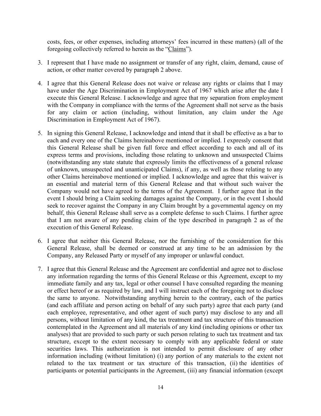 14 costs, fees, or other expenses, including attorneys’ fees incurred in these matters) (all of the foregoing collectively referred to herein as the “Claims”). 3. I represent that I have made no assignment or transfer of any right, claim, demand, cause of action, or other matter covered by paragraph 2 above. 4. I agree that this General Release does not waive or release any rights or claims that I may have under the Age Discrimination in Employment Act of 1967 which arise after the date I execute this General Release. I acknowledge and agree that my separation from employment with the Company in compliance with the terms of the Agreement shall not serve as the basis for any claim or action (including, without limitation, any claim under the Age Discrimination in Employment Act of 1967). 5. In signing this General Release, I acknowledge and intend that it shall be effective as a bar to each and every one of the Claims hereinabove mentioned or implied. I expressly consent that this General Release shall be given full force and effect according to each and all of its express terms and provisions, including those relating to unknown and unsuspected Claims (notwithstanding any state statute that expressly limits the effectiveness of a general release of unknown, unsuspected and unanticipated Claims), if any, as well as those relating to any other Claims hereinabove mentioned or implied. I acknowledge and agree that this waiver is an essential and material term of this General Release and that without such waiver the Company would not have agreed to the terms of the Agreement. I further agree that in the event I should bring a Claim seeking damages against the Company, or in the event I should seek to recover against the Company in any Claim brought by a governmental agency on my behalf, this General Release shall serve as a complete defense to such Claims. I further agree that I am not aware of any pending claim of the type described in paragraph 2 as of the execution of this General Release. 6. I agree that neither this General Release, nor the furnishing of the consideration for this General Release, shall be deemed or construed at any time to be an admission by the Company, any Released Party or myself of any improper or unlawful conduct. 7. I agree that this General Release and the Agreement are confidential and agree not to disclose any information regarding the terms of this General Release or this Agreement, except to my immediate family and any tax, legal or other counsel I have consulted regarding the meaning or effect hereof or as required by law, and I will instruct each of the foregoing not to disclose the same to anyone. Notwithstanding anything herein to the contrary, each of the parties (and each affiliate and person acting on behalf of any such party) agree that each party (and each employee, representative, and other agent of such party) may disclose to any and all persons, without limitation of any kind, the tax treatment and tax structure of this transaction contemplated in the Agreement and all materials of any kind (including opinions or other tax analyses) that are provided to such party or such person relating to such tax treatment and tax structure, except to the extent necessary to comply with any applicable federal or state securities laws. This authorization is not intended to permit disclosure of any other information including (without limitation) (i) any portion of any materials to the extent not related to the tax treatment or tax structure of this transaction, (ii) the identities of participants or potential participants in the Agreement, (iii) any financial information (except