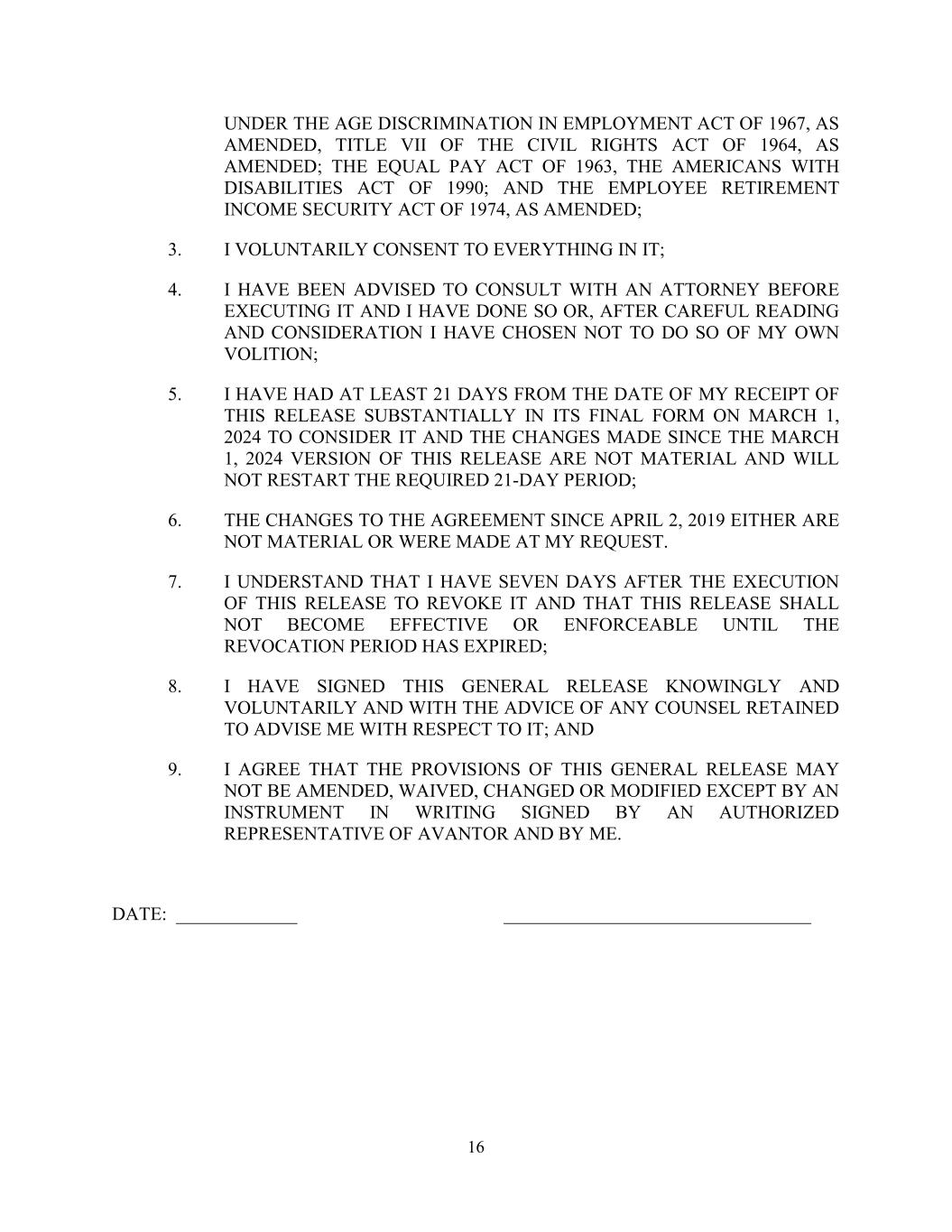 16 UNDER THE AGE DISCRIMINATION IN EMPLOYMENT ACT OF 1967, AS AMENDED, TITLE VII OF THE CIVIL RIGHTS ACT OF 1964, AS AMENDED; THE EQUAL PAY ACT OF 1963, THE AMERICANS WITH DISABILITIES ACT OF 1990; AND THE EMPLOYEE RETIREMENT INCOME SECURITY ACT OF 1974, AS AMENDED; 3. I VOLUNTARILY CONSENT TO EVERYTHING IN IT; 4. I HAVE BEEN ADVISED TO CONSULT WITH AN ATTORNEY BEFORE EXECUTING IT AND I HAVE DONE SO OR, AFTER CAREFUL READING AND CONSIDERATION I HAVE CHOSEN NOT TO DO SO OF MY OWN VOLITION; 5. I HAVE HAD AT LEAST 21 DAYS FROM THE DATE OF MY RECEIPT OF THIS RELEASE SUBSTANTIALLY IN ITS FINAL FORM ON MARCH 1, 2024 TO CONSIDER IT AND THE CHANGES MADE SINCE THE MARCH 1, 2024 VERSION OF THIS RELEASE ARE NOT MATERIAL AND WILL NOT RESTART THE REQUIRED 21-DAY PERIOD; 6. THE CHANGES TO THE AGREEMENT SINCE APRIL 2, 2019 EITHER ARE NOT MATERIAL OR WERE MADE AT MY REQUEST. 7. I UNDERSTAND THAT I HAVE SEVEN DAYS AFTER THE EXECUTION OF THIS RELEASE TO REVOKE IT AND THAT THIS RELEASE SHALL NOT BECOME EFFECTIVE OR ENFORCEABLE UNTIL THE REVOCATION PERIOD HAS EXPIRED; 8. I HAVE SIGNED THIS GENERAL RELEASE KNOWINGLY AND VOLUNTARILY AND WITH THE ADVICE OF ANY COUNSEL RETAINED TO ADVISE ME WITH RESPECT TO IT; AND 9. I AGREE THAT THE PROVISIONS OF THIS GENERAL RELEASE MAY NOT BE AMENDED, WAIVED, CHANGED OR MODIFIED EXCEPT BY AN INSTRUMENT IN WRITING SIGNED BY AN AUTHORIZED REPRESENTATIVE OF AVANTOR AND BY ME. DATE: _____________ _________________________________