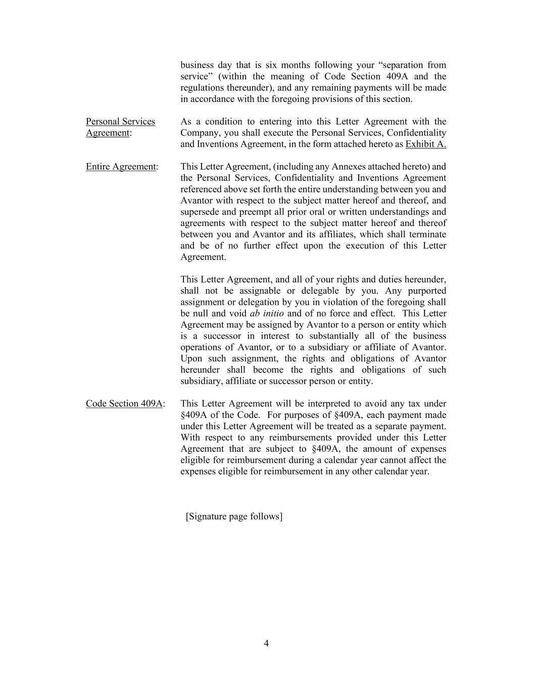 4 business day that is six months following your “separation from service” (within the meaning of Code Section 409A and the regulations thereunder), and any remaining payments will be made in accordance with the foregoing provisions of this section. Personal Services Agreement: As a condition to entering into this Letter Agreement with the Company, you shall execute the Personal Services, Confidentiality and Inventions Agreement, in the form attached hereto as Exhibit A. Entire Agreement: This Letter Agreement, (including any Annexes attached hereto) and the Personal Services, Confidentiality and Inventions Agreement referenced above set forth the entire understanding between you and Avantor with respect to the subject matter hereof and thereof, and supersede and preempt all prior oral or written understandings and agreements with respect to the subject matter hereof and thereof between you and Avantor and its affiliates, which shall terminate and be of no further effect upon the execution of this Letter Agreement. This Letter Agreement, and all of your rights and duties hereunder, shall not be assignable or delegable by you. Any purported assignment or delegation by you in violation of the foregoing shall be null and void ab initio and of no force and effect. This Letter Agreement may be assigned by Avantor to a person or entity which is a successor in interest to substantially all of the business operations of Avantor, or to a subsidiary or affiliate of Avantor. Upon such assignment, the rights and obligations of Avantor hereunder shall become the rights and obligations of such subsidiary, affiliate or successor person or entity. Code Section 409A: This Letter Agreement will be interpreted to avoid any tax under §409A of the Code. For purposes of §409A, each payment made under this Letter Agreement will be treated as a separate payment. With respect to any reimbursements provided under this Letter Agreement that are subject to §409A, the amount of expenses eligible for reimbursement during a calendar year cannot affect the expenses eligible for reimbursement in any other calendar year. [Signature page follows]