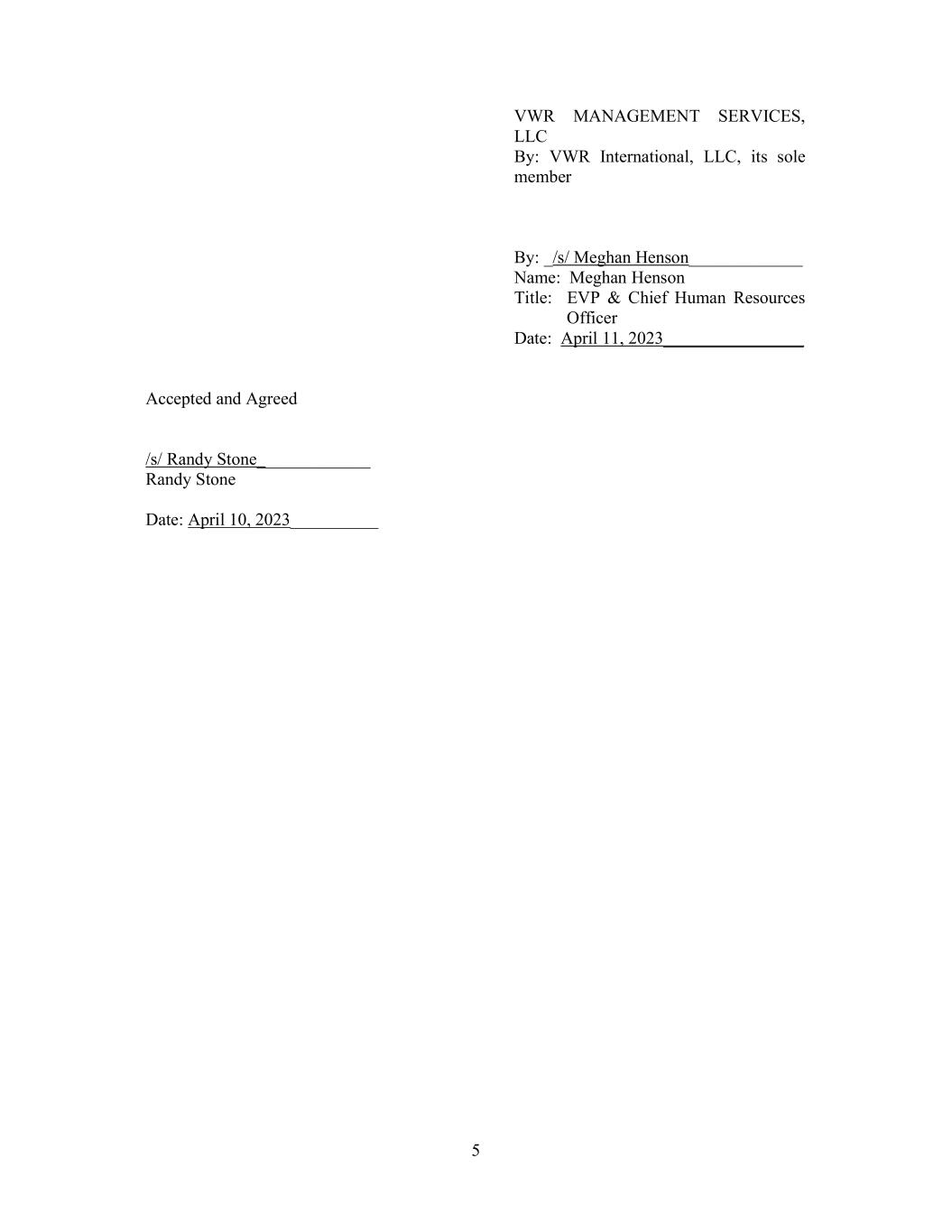 5 VWR MANAGEMENT SERVICES, LLC By: VWR International, LLC, its sole member By: _/s/ Meghan Henson_____________ Name: Meghan Henson Title: EVP & Chief Human Resources Officer Date: April 11, 2023________________ Accepted and Agreed /s/ Randy Stone_____________ Randy Stone Date: April 10, 2023__________