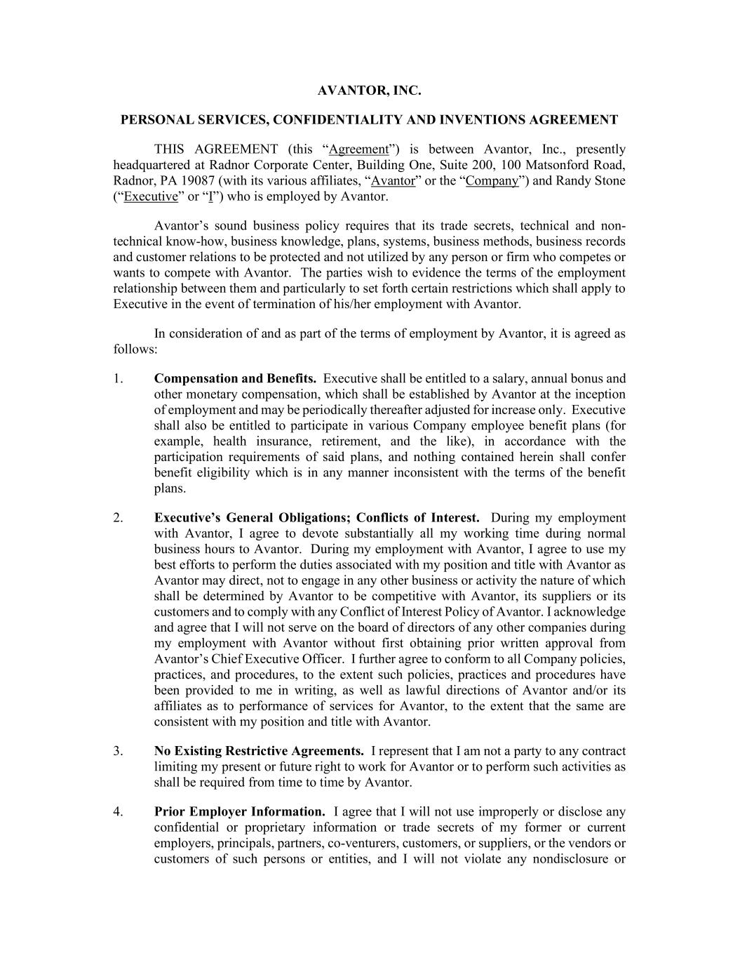 AVANTOR, INC. PERSONAL SERVICES, CONFIDENTIALITY AND INVENTIONS AGREEMENT THIS AGREEMENT (this “Agreement”) is between Avantor, Inc., presently headquartered at Radnor Corporate Center, Building One, Suite 200, 100 Matsonford Road, Radnor, PA 19087 (with its various affiliates, “Avantor” or the “Company”) and Randy Stone (“Executive” or “I”) who is employed by Avantor. Avantor’s sound business policy requires that its trade secrets, technical and non- technical know-how, business knowledge, plans, systems, business methods, business records and customer relations to be protected and not utilized by any person or firm who competes or wants to compete with Avantor. The parties wish to evidence the terms of the employment relationship between them and particularly to set forth certain restrictions which shall apply to Executive in the event of termination of his/her employment with Avantor. In consideration of and as part of the terms of employment by Avantor, it is agreed as follows: 1. Compensation and Benefits. Executive shall be entitled to a salary, annual bonus and other monetary compensation, which shall be established by Avantor at the inception of employment and may be periodically thereafter adjusted for increase only. Executive shall also be entitled to participate in various Company employee benefit plans (for example, health insurance, retirement, and the like), in accordance with the participation requirements of said plans, and nothing contained herein shall confer benefit eligibility which is in any manner inconsistent with the terms of the benefit plans. 2. Executive’s General Obligations; Conflicts of Interest. During my employment with Avantor, I agree to devote substantially all my working time during normal business hours to Avantor. During my employment with Avantor, I agree to use my best efforts to perform the duties associated with my position and title with Avantor as Avantor may direct, not to engage in any other business or activity the nature of which shall be determined by Avantor to be competitive with Avantor, its suppliers or its customers and to comply with any Conflict of Interest Policy of Avantor. I acknowledge and agree that I will not serve on the board of directors of any other companies during my employment with Avantor without first obtaining prior written approval from Avantor’s Chief Executive Officer. I further agree to conform to all Company policies, practices, and procedures, to the extent such policies, practices and procedures have been provided to me in writing, as well as lawful directions of Avantor and/or its affiliates as to performance of services for Avantor, to the extent that the same are consistent with my position and title with Avantor. 3. No Existing Restrictive Agreements. I represent that I am not a party to any contract limiting my present or future right to work for Avantor or to perform such activities as shall be required from time to time by Avantor. 4. Prior Employer Information. I agree that I will not use improperly or disclose any confidential or proprietary information or trade secrets of my former or current employers, principals, partners, co-venturers, customers, or suppliers, or the vendors or customers of such persons or entities, and I will not violate any nondisclosure or