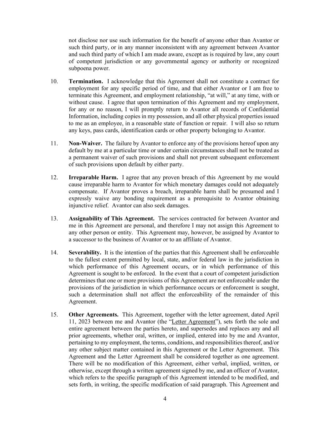 4 not disclose nor use such information for the benefit of anyone other than Avantor or such third party, or in any manner inconsistent with any agreement between Avantor and such third party of which I am made aware, except as is required by law, any court of competent jurisdiction or any governmental agency or authority or recognized subpoena power. 10. Termination. I acknowledge that this Agreement shall not constitute a contract for employment for any specific period of time, and that either Avantor or I am free to terminate this Agreement, and employment relationship, “at will,” at any time, with or without cause. I agree that upon termination of this Agreement and my employment, for any or no reason, I will promptly return to Avantor all records of Confidential Information, including copies in my possession, and all other physical properties issued to me as an employee, in a reasonable state of function or repair. I will also so return any keys, pass cards, identification cards or other property belonging to Avantor. 11. Non-Waiver. The failure by Avantor to enforce any of the provisions hereof upon any default by me at a particular time or under certain circumstances shall not be treated as a permanent waiver of such provisions and shall not prevent subsequent enforcement of such provisions upon default by either party. 12. Irreparable Harm. I agree that any proven breach of this Agreement by me would cause irreparable harm to Avantor for which monetary damages could not adequately compensate. If Avantor proves a breach, irreparable harm shall be presumed and I expressly waive any bonding requirement as a prerequisite to Avantor obtaining injunctive relief. Avantor can also seek damages. 13. Assignability of This Agreement. The services contracted for between Avantor and me in this Agreement are personal, and therefore I may not assign this Agreement to any other person or entity. This Agreement may, however, be assigned by Avantor to a successor to the business of Avantor or to an affiliate of Avantor. 14. Severability. It is the intention of the parties that this Agreement shall be enforceable to the fullest extent permitted by local, state, and/or federal law in the jurisdiction in which performance of this Agreement occurs, or in which performance of this Agreement is sought to be enforced. In the event that a court of competent jurisdiction determines that one or more provisions of this Agreement are not enforceable under the provisions of the jurisdiction in which performance occurs or enforcement is sought, such a determination shall not affect the enforceability of the remainder of this Agreement. 15. Other Agreements. This Agreement, together with the letter agreement, dated April 11, 2023 between me and Avantor (the “Letter Agreement”), sets forth the sole and entire agreement between the parties hereto, and supersedes and replaces any and all prior agreements, whether oral, written, or implied, entered into by me and Avantor, pertaining to my employment, the terms, conditions, and responsibilities thereof, and/or any other subject matter contained in this Agreement or the Letter Agreement. This Agreement and the Letter Agreement shall be considered together as one agreement. There will be no modification of this Agreement, either verbal, implied, written, or otherwise, except through a written agreement signed by me, and an officer of Avantor, which refers to the specific paragraph of this Agreement intended to be modified, and sets forth, in writing, the specific modification of said paragraph. This Agreement and