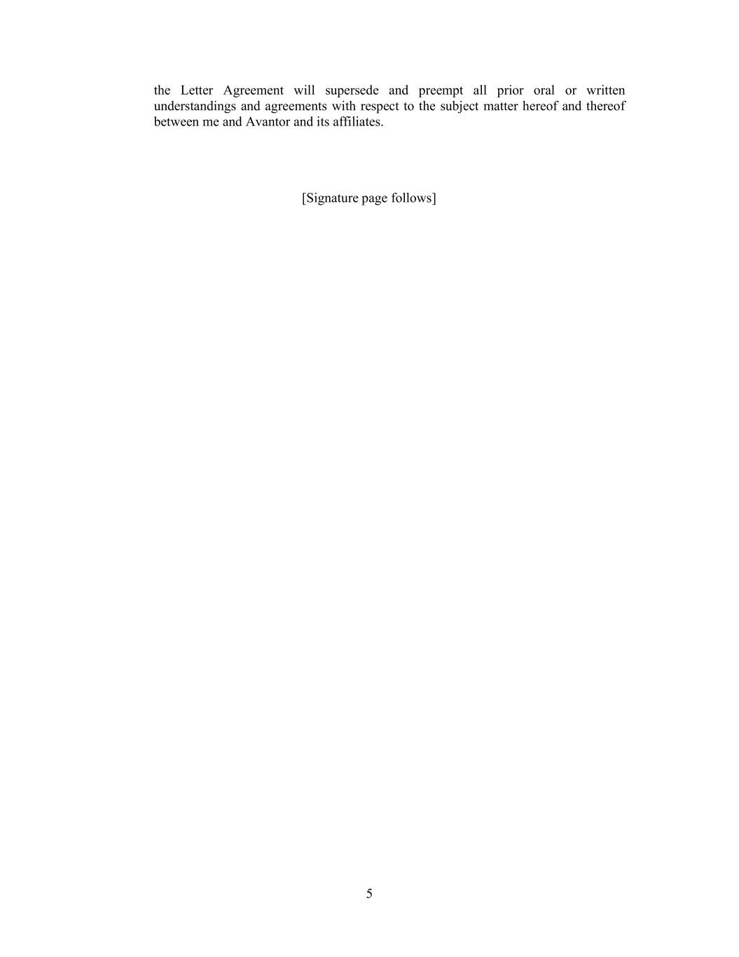 5 the Letter Agreement will supersede and preempt all prior oral or written understandings and agreements with respect to the subject matter hereof and thereof between me and Avantor and its affiliates. [Signature page follows]