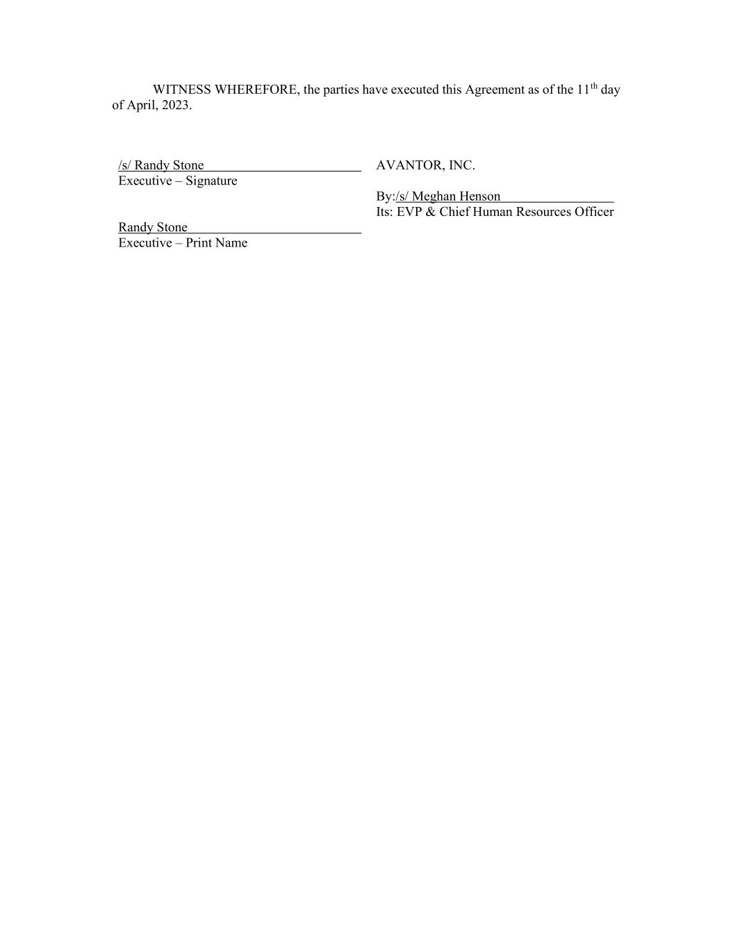 WITNESS WHEREFORE, the parties have executed this Agreement as of the 11th day of April, 2023. /s/ Randy Stone Executive – Signature AVANTOR, INC. Randy Stone Executive – Print Name By:/s/ Meghan Henson Its: EVP & Chief Human Resources Officer