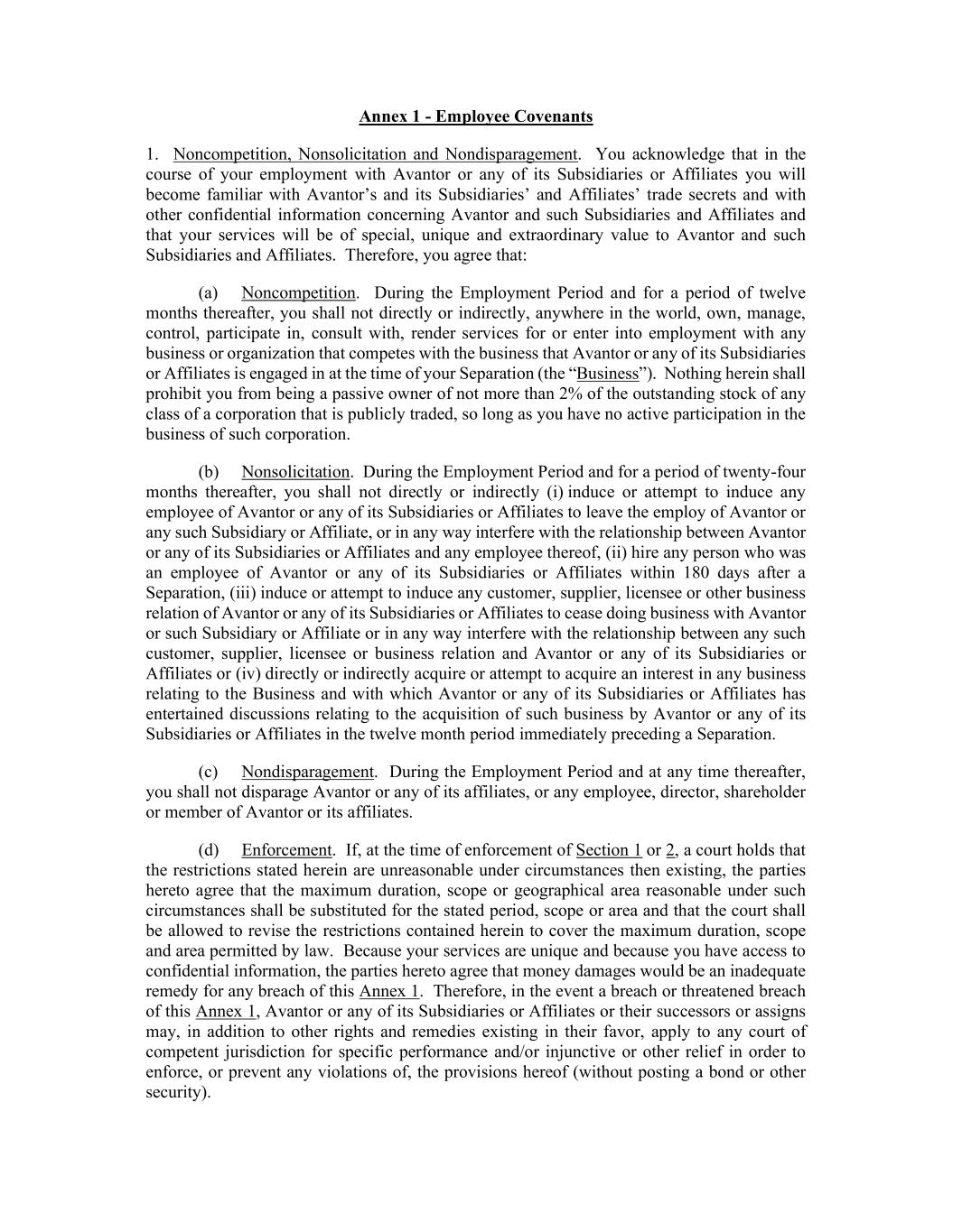 Annex 1 - Employee Covenants 1. Noncompetition, Nonsolicitation and Nondisparagement. You acknowledge that in the course of your employment with Avantor or any of its Subsidiaries or Affiliates you will become familiar with Avantor’s and its Subsidiaries’ and Affiliates’ trade secrets and with other confidential information concerning Avantor and such Subsidiaries and Affiliates and that your services will be of special, unique and extraordinary value to Avantor and such Subsidiaries and Affiliates. Therefore, you agree that: (a) Noncompetition. During the Employment Period and for a period of twelve months thereafter, you shall not directly or indirectly, anywhere in the world, own, manage, control, participate in, consult with, render services for or enter into employment with any business or organization that competes with the business that Avantor or any of its Subsidiaries or Affiliates is engaged in at the time of your Separation (the “Business”). Nothing herein shall prohibit you from being a passive owner of not more than 2% of the outstanding stock of any class of a corporation that is publicly traded, so long as you have no active participation in the business of such corporation. (b) Nonsolicitation. During the Employment Period and for a period of twenty-four months thereafter, you shall not directly or indirectly (i) induce or attempt to induce any employee of Avantor or any of its Subsidiaries or Affiliates to leave the employ of Avantor or any such Subsidiary or Affiliate, or in any way interfere with the relationship between Avantor or any of its Subsidiaries or Affiliates and any employee thereof, (ii) hire any person who was an employee of Avantor or any of its Subsidiaries or Affiliates within 180 days after a Separation, (iii) induce or attempt to induce any customer, supplier, licensee or other business relation of Avantor or any of its Subsidiaries or Affiliates to cease doing business with Avantor or such Subsidiary or Affiliate or in any way interfere with the relationship between any such customer, supplier, licensee or business relation and Avantor or any of its Subsidiaries or Affiliates or (iv) directly or indirectly acquire or attempt to acquire an interest in any business relating to the Business and with which Avantor or any of its Subsidiaries or Affiliates has entertained discussions relating to the acquisition of such business by Avantor or any of its Subsidiaries or Affiliates in the twelve month period immediately preceding a Separation. (c) Nondisparagement. During the Employment Period and at any time thereafter, you shall not disparage Avantor or any of its affiliates, or any employee, director, shareholder or member of Avantor or its affiliates. (d) Enforcement. If, at the time of enforcement of Section 1 or 2, a court holds that the restrictions stated herein are unreasonable under circumstances then existing, the parties hereto agree that the maximum duration, scope or geographical area reasonable under such circumstances shall be substituted for the stated period, scope or area and that the court shall be allowed to revise the restrictions contained herein to cover the maximum duration, scope and area permitted by law. Because your services are unique and because you have access to confidential information, the parties hereto agree that money damages would be an inadequate remedy for any breach of this Annex 1. Therefore, in the event a breach or threatened breach of this Annex 1, Avantor or any of its Subsidiaries or Affiliates or their successors or assigns may, in addition to other rights and remedies existing in their favor, apply to any court of competent jurisdiction for specific performance and/or injunctive or other relief in order to enforce, or prevent any violations of, the provisions hereof (without posting a bond or other security).