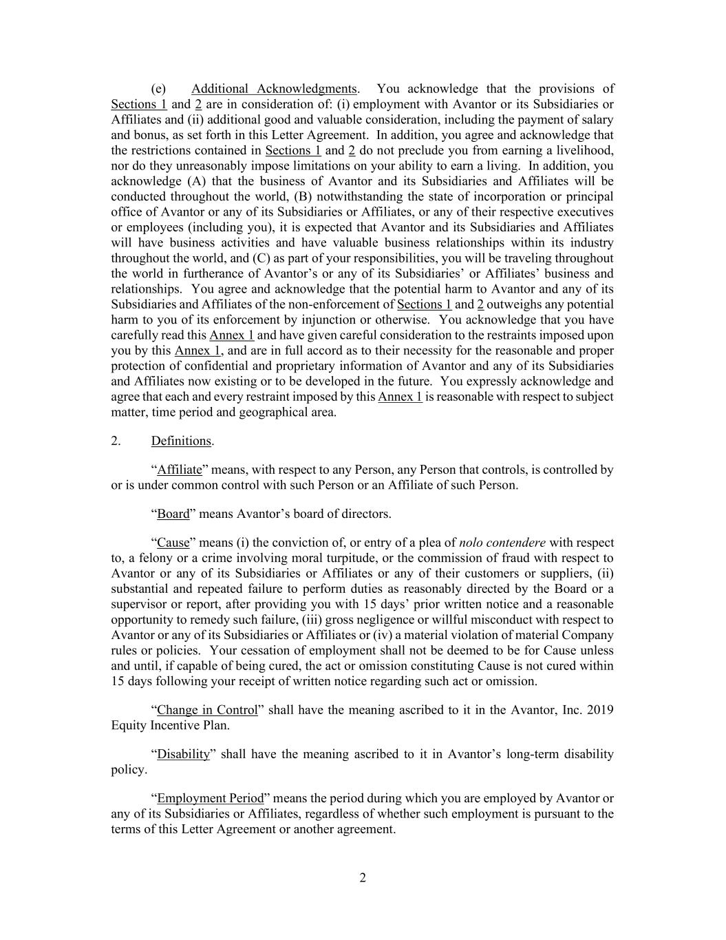 2 (e) Additional Acknowledgments. You acknowledge that the provisions of Sections 1 and 2 are in consideration of: (i) employment with Avantor or its Subsidiaries or Affiliates and (ii) additional good and valuable consideration, including the payment of salary and bonus, as set forth in this Letter Agreement. In addition, you agree and acknowledge that the restrictions contained in Sections 1 and 2 do not preclude you from earning a livelihood, nor do they unreasonably impose limitations on your ability to earn a living. In addition, you acknowledge (A) that the business of Avantor and its Subsidiaries and Affiliates will be conducted throughout the world, (B) notwithstanding the state of incorporation or principal office of Avantor or any of its Subsidiaries or Affiliates, or any of their respective executives or employees (including you), it is expected that Avantor and its Subsidiaries and Affiliates will have business activities and have valuable business relationships within its industry throughout the world, and (C) as part of your responsibilities, you will be traveling throughout the world in furtherance of Avantor’s or any of its Subsidiaries’ or Affiliates’ business and relationships. You agree and acknowledge that the potential harm to Avantor and any of its Subsidiaries and Affiliates of the non-enforcement of Sections 1 and 2 outweighs any potential harm to you of its enforcement by injunction or otherwise. You acknowledge that you have carefully read this Annex 1 and have given careful consideration to the restraints imposed upon you by this Annex 1, and are in full accord as to their necessity for the reasonable and proper protection of confidential and proprietary information of Avantor and any of its Subsidiaries and Affiliates now existing or to be developed in the future. You expressly acknowledge and agree that each and every restraint imposed by this Annex 1 is reasonable with respect to subject matter, time period and geographical area. 2. Definitions. “Affiliate” means, with respect to any Person, any Person that controls, is controlled by or is under common control with such Person or an Affiliate of such Person. “Board” means Avantor’s board of directors. “Cause” means (i) the conviction of, or entry of a plea of nolo contendere with respect to, a felony or a crime involving moral turpitude, or the commission of fraud with respect to Avantor or any of its Subsidiaries or Affiliates or any of their customers or suppliers, (ii) substantial and repeated failure to perform duties as reasonably directed by the Board or a supervisor or report, after providing you with 15 days’ prior written notice and a reasonable opportunity to remedy such failure, (iii) gross negligence or willful misconduct with respect to Avantor or any of its Subsidiaries or Affiliates or (iv) a material violation of material Company rules or policies. Your cessation of employment shall not be deemed to be for Cause unless and until, if capable of being cured, the act or omission constituting Cause is not cured within 15 days following your receipt of written notice regarding such act or omission. “Change in Control” shall have the meaning ascribed to it in the Avantor, Inc. 2019 Equity Incentive Plan. “Disability” shall have the meaning ascribed to it in Avantor’s long-term disability policy. “Employment Period” means the period during which you are employed by Avantor or any of its Subsidiaries or Affiliates, regardless of whether such employment is pursuant to the terms of this Letter Agreement or another agreement.
