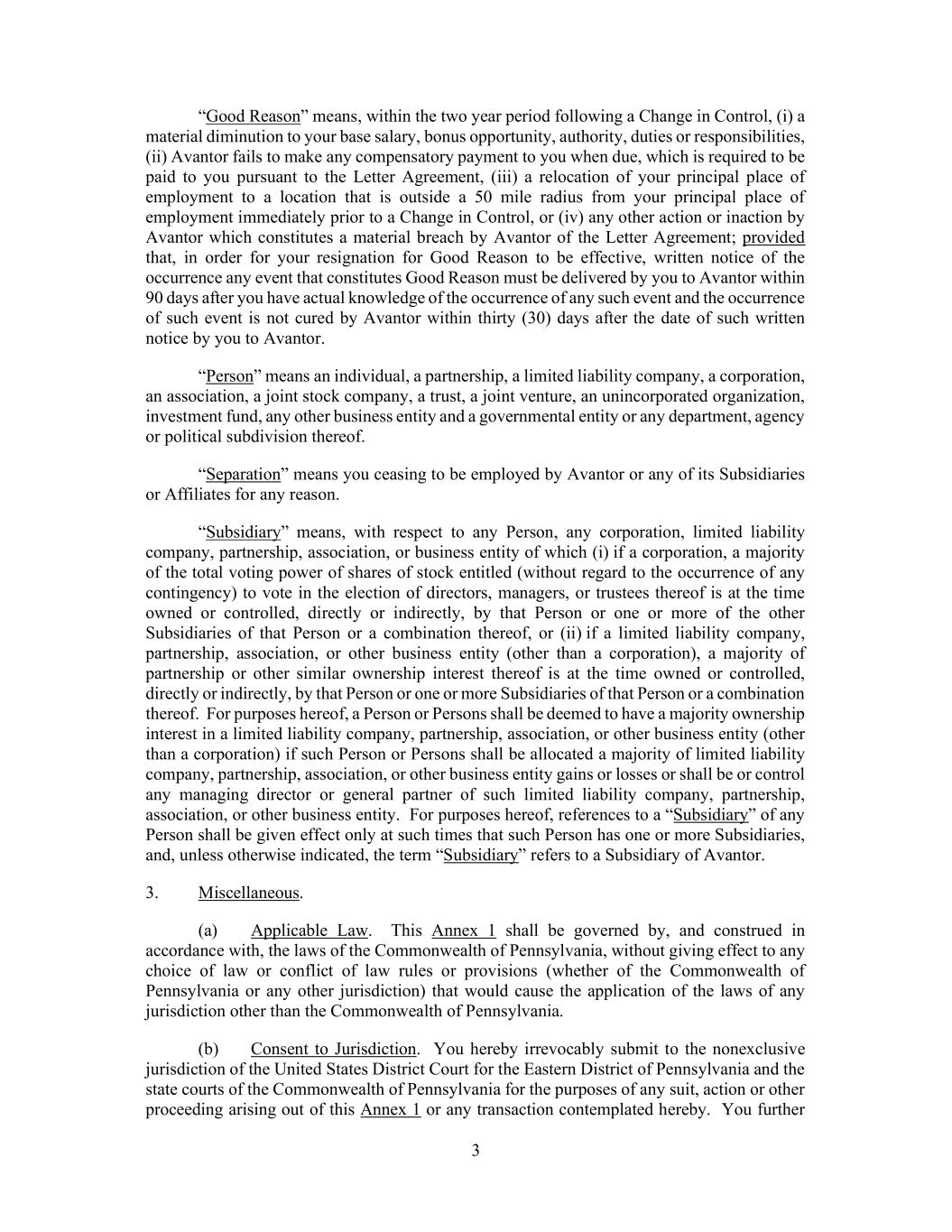 3 “Good Reason” means, within the two year period following a Change in Control, (i) a material diminution to your base salary, bonus opportunity, authority, duties or responsibilities, (ii) Avantor fails to make any compensatory payment to you when due, which is required to be paid to you pursuant to the Letter Agreement, (iii) a relocation of your principal place of employment to a location that is outside a 50 mile radius from your principal place of employment immediately prior to a Change in Control, or (iv) any other action or inaction by Avantor which constitutes a material breach by Avantor of the Letter Agreement; provided that, in order for your resignation for Good Reason to be effective, written notice of the occurrence any event that constitutes Good Reason must be delivered by you to Avantor within 90 days after you have actual knowledge of the occurrence of any such event and the occurrence of such event is not cured by Avantor within thirty (30) days after the date of such written notice by you to Avantor. “Person” means an individual, a partnership, a limited liability company, a corporation, an association, a joint stock company, a trust, a joint venture, an unincorporated organization, investment fund, any other business entity and a governmental entity or any department, agency or political subdivision thereof. “Separation” means you ceasing to be employed by Avantor or any of its Subsidiaries or Affiliates for any reason. “Subsidiary” means, with respect to any Person, any corporation, limited liability company, partnership, association, or business entity of which (i) if a corporation, a majority of the total voting power of shares of stock entitled (without regard to the occurrence of any contingency) to vote in the election of directors, managers, or trustees thereof is at the time owned or controlled, directly or indirectly, by that Person or one or more of the other Subsidiaries of that Person or a combination thereof, or (ii) if a limited liability company, partnership, association, or other business entity (other than a corporation), a majority of partnership or other similar ownership interest thereof is at the time owned or controlled, directly or indirectly, by that Person or one or more Subsidiaries of that Person or a combination thereof. For purposes hereof, a Person or Persons shall be deemed to have a majority ownership interest in a limited liability company, partnership, association, or other business entity (other than a corporation) if such Person or Persons shall be allocated a majority of limited liability company, partnership, association, or other business entity gains or losses or shall be or control any managing director or general partner of such limited liability company, partnership, association, or other business entity. For purposes hereof, references to a “Subsidiary” of any Person shall be given effect only at such times that such Person has one or more Subsidiaries, and, unless otherwise indicated, the term “Subsidiary” refers to a Subsidiary of Avantor. 3. Miscellaneous. (a) Applicable Law. This Annex 1 shall be governed by, and construed in accordance with, the laws of the Commonwealth of Pennsylvania, without giving effect to any choice of law or conflict of law rules or provisions (whether of the Commonwealth of Pennsylvania or any other jurisdiction) that would cause the application of the laws of any jurisdiction other than the Commonwealth of Pennsylvania. (b) Consent to Jurisdiction. You hereby irrevocably submit to the nonexclusive jurisdiction of the United States District Court for the Eastern District of Pennsylvania and the state courts of the Commonwealth of Pennsylvania for the purposes of any suit, action or other proceeding arising out of this Annex 1 or any transaction contemplated hereby. You further