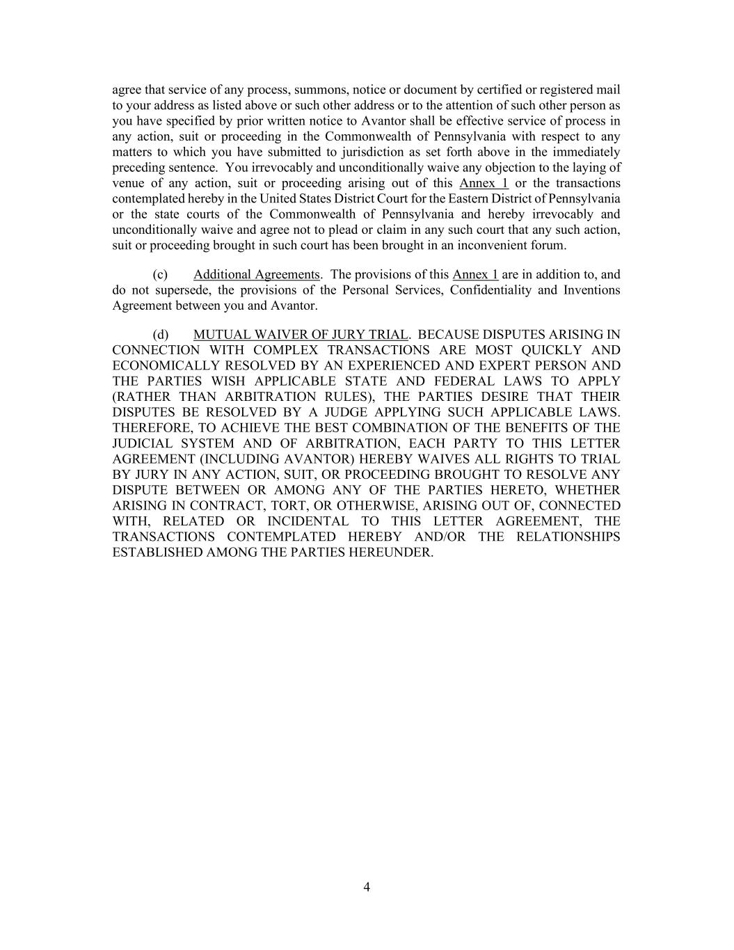4 agree that service of any process, summons, notice or document by certified or registered mail to your address as listed above or such other address or to the attention of such other person as you have specified by prior written notice to Avantor shall be effective service of process in any action, suit or proceeding in the Commonwealth of Pennsylvania with respect to any matters to which you have submitted to jurisdiction as set forth above in the immediately preceding sentence. You irrevocably and unconditionally waive any objection to the laying of venue of any action, suit or proceeding arising out of this Annex 1 or the transactions contemplated hereby in the United States District Court for the Eastern District of Pennsylvania or the state courts of the Commonwealth of Pennsylvania and hereby irrevocably and unconditionally waive and agree not to plead or claim in any such court that any such action, suit or proceeding brought in such court has been brought in an inconvenient forum. (c) Additional Agreements. The provisions of this Annex 1 are in addition to, and do not supersede, the provisions of the Personal Services, Confidentiality and Inventions Agreement between you and Avantor. (d) MUTUAL WAIVER OF JURY TRIAL. BECAUSE DISPUTES ARISING IN CONNECTION WITH COMPLEX TRANSACTIONS ARE MOST QUICKLY AND ECONOMICALLY RESOLVED BY AN EXPERIENCED AND EXPERT PERSON AND THE PARTIES WISH APPLICABLE STATE AND FEDERAL LAWS TO APPLY (RATHER THAN ARBITRATION RULES), THE PARTIES DESIRE THAT THEIR DISPUTES BE RESOLVED BY A JUDGE APPLYING SUCH APPLICABLE LAWS. THEREFORE, TO ACHIEVE THE BEST COMBINATION OF THE BENEFITS OF THE JUDICIAL SYSTEM AND OF ARBITRATION, EACH PARTY TO THIS LETTER AGREEMENT (INCLUDING AVANTOR) HEREBY WAIVES ALL RIGHTS TO TRIAL BY JURY IN ANY ACTION, SUIT, OR PROCEEDING BROUGHT TO RESOLVE ANY DISPUTE BETWEEN OR AMONG ANY OF THE PARTIES HERETO, WHETHER ARISING IN CONTRACT, TORT, OR OTHERWISE, ARISING OUT OF, CONNECTED WITH, RELATED OR INCIDENTAL TO THIS LETTER AGREEMENT, THE TRANSACTIONS CONTEMPLATED HEREBY AND/OR THE RELATIONSHIPS ESTABLISHED AMONG THE PARTIES HEREUNDER.