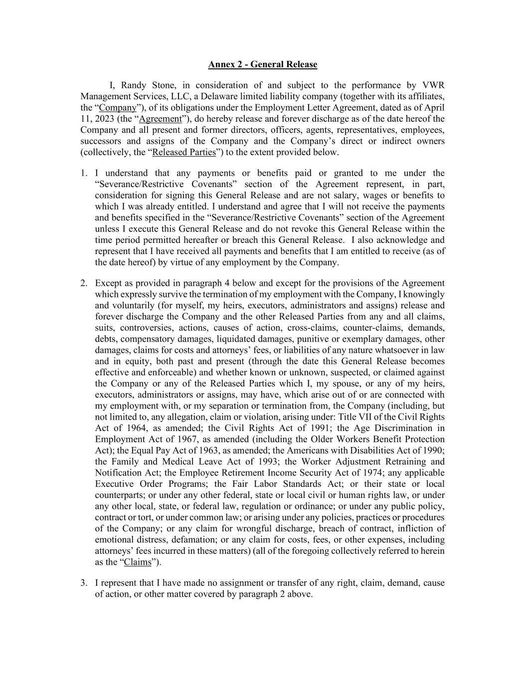 Annex 2 - General Release I, Randy Stone, in consideration of and subject to the performance by VWR Management Services, LLC, a Delaware limited liability company (together with its affiliates, the “Company”), of its obligations under the Employment Letter Agreement, dated as of April 11, 2023 (the “Agreement”), do hereby release and forever discharge as of the date hereof the Company and all present and former directors, officers, agents, representatives, employees, successors and assigns of the Company and the Company’s direct or indirect owners (collectively, the “Released Parties”) to the extent provided below. 1. I understand that any payments or benefits paid or granted to me under the “Severance/Restrictive Covenants” section of the Agreement represent, in part, consideration for signing this General Release and are not salary, wages or benefits to which I was already entitled. I understand and agree that I will not receive the payments and benefits specified in the “Severance/Restrictive Covenants” section of the Agreement unless I execute this General Release and do not revoke this General Release within the time period permitted hereafter or breach this General Release. I also acknowledge and represent that I have received all payments and benefits that I am entitled to receive (as of the date hereof) by virtue of any employment by the Company. 2. Except as provided in paragraph 4 below and except for the provisions of the Agreement which expressly survive the termination of my employment with the Company, I knowingly and voluntarily (for myself, my heirs, executors, administrators and assigns) release and forever discharge the Company and the other Released Parties from any and all claims, suits, controversies, actions, causes of action, cross-claims, counter-claims, demands, debts, compensatory damages, liquidated damages, punitive or exemplary damages, other damages, claims for costs and attorneys’ fees, or liabilities of any nature whatsoever in law and in equity, both past and present (through the date this General Release becomes effective and enforceable) and whether known or unknown, suspected, or claimed against the Company or any of the Released Parties which I, my spouse, or any of my heirs, executors, administrators or assigns, may have, which arise out of or are connected with my employment with, or my separation or termination from, the Company (including, but not limited to, any allegation, claim or violation, arising under: Title VII of the Civil Rights Act of 1964, as amended; the Civil Rights Act of 1991; the Age Discrimination in Employment Act of 1967, as amended (including the Older Workers Benefit Protection Act); the Equal Pay Act of 1963, as amended; the Americans with Disabilities Act of 1990; the Family and Medical Leave Act of 1993; the Worker Adjustment Retraining and Notification Act; the Employee Retirement Income Security Act of 1974; any applicable Executive Order Programs; the Fair Labor Standards Act; or their state or local counterparts; or under any other federal, state or local civil or human rights law, or under any other local, state, or federal law, regulation or ordinance; or under any public policy, contract or tort, or under common law; or arising under any policies, practices or procedures of the Company; or any claim for wrongful discharge, breach of contract, infliction of emotional distress, defamation; or any claim for costs, fees, or other expenses, including attorneys’ fees incurred in these matters) (all of the foregoing collectively referred to herein as the “Claims”). 3. I represent that I have made no assignment or transfer of any right, claim, demand, cause of action, or other matter covered by paragraph 2 above.