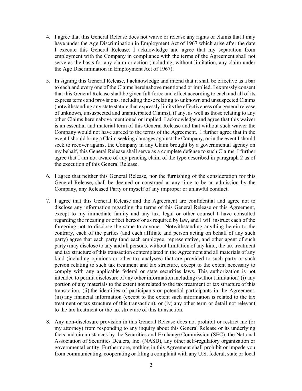 2 4. I agree that this General Release does not waive or release any rights or claims that I may have under the Age Discrimination in Employment Act of 1967 which arise after the date I execute this General Release. I acknowledge and agree that my separation from employment with the Company in compliance with the terms of the Agreement shall not serve as the basis for any claim or action (including, without limitation, any claim under the Age Discrimination in Employment Act of 1967). 5. In signing this General Release, I acknowledge and intend that it shall be effective as a bar to each and every one of the Claims hereinabove mentioned or implied. I expressly consent that this General Release shall be given full force and effect according to each and all of its express terms and provisions, including those relating to unknown and unsuspected Claims (notwithstanding any state statute that expressly limits the effectiveness of a general release of unknown, unsuspected and unanticipated Claims), if any, as well as those relating to any other Claims hereinabove mentioned or implied. I acknowledge and agree that this waiver is an essential and material term of this General Release and that without such waiver the Company would not have agreed to the terms of the Agreement. I further agree that in the event I should bring a Claim seeking damages against the Company, or in the event I should seek to recover against the Company in any Claim brought by a governmental agency on my behalf, this General Release shall serve as a complete defense to such Claims. I further agree that I am not aware of any pending claim of the type described in paragraph 2 as of the execution of this General Release. 6. I agree that neither this General Release, nor the furnishing of the consideration for this General Release, shall be deemed or construed at any time to be an admission by the Company, any Released Party or myself of any improper or unlawful conduct. 7. I agree that this General Release and the Agreement are confidential and agree not to disclose any information regarding the terms of this General Release or this Agreement, except to my immediate family and any tax, legal or other counsel I have consulted regarding the meaning or effect hereof or as required by law, and I will instruct each of the foregoing not to disclose the same to anyone. Notwithstanding anything herein to the contrary, each of the parties (and each affiliate and person acting on behalf of any such party) agree that each party (and each employee, representative, and other agent of such party) may disclose to any and all persons, without limitation of any kind, the tax treatment and tax structure of this transaction contemplated in the Agreement and all materials of any kind (including opinions or other tax analyses) that are provided to such party or such person relating to such tax treatment and tax structure, except to the extent necessary to comply with any applicable federal or state securities laws. This authorization is not intended to permit disclosure of any other information including (without limitation) (i) any portion of any materials to the extent not related to the tax treatment or tax structure of this transaction, (ii) the identities of participants or potential participants in the Agreement, (iii) any financial information (except to the extent such information is related to the tax treatment or tax structure of this transaction), or (iv) any other term or detail not relevant to the tax treatment or the tax structure of this transaction. 8. Any non-disclosure provision in this General Release does not prohibit or restrict me (or my attorney) from responding to any inquiry about this General Release or its underlying facts and circumstances by the Securities and Exchange Commission (SEC), the National Association of Securities Dealers, Inc. (NASD), any other self-regulatory organization or governmental entity. Furthermore, nothing in this Agreement shall prohibit or impede you from communicating, cooperating or filing a complaint with any U.S. federal, state or local
