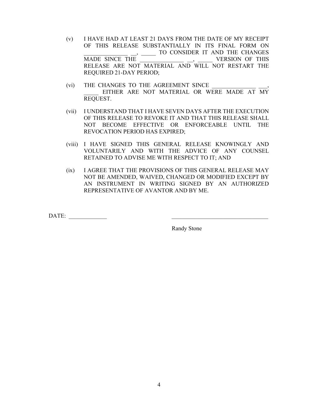 4 (v) I HAVE HAD AT LEAST 21 DAYS FROM THE DATE OF MY RECEIPT OF THIS RELEASE SUBSTANTIALLY IN ITS FINAL FORM ON _______________ __, _____ TO CONSIDER IT AND THE CHANGES MADE SINCE THE _______________ __, _____ VERSION OF THIS RELEASE ARE NOT MATERIAL AND WILL NOT RESTART THE REQUIRED 21-DAY PERIOD; (vi) THE CHANGES TO THE AGREEMENT SINCE _______________ ___, _____ EITHER ARE NOT MATERIAL OR WERE MADE AT MY REQUEST. (vii) I UNDERSTAND THAT I HAVE SEVEN DAYS AFTER THE EXECUTION OF THIS RELEASE TO REVOKE IT AND THAT THIS RELEASE SHALL NOT BECOME EFFECTIVE OR ENFORCEABLE UNTIL THE REVOCATION PERIOD HAS EXPIRED; (viii) I HAVE SIGNED THIS GENERAL RELEASE KNOWINGLY AND VOLUNTARILY AND WITH THE ADVICE OF ANY COUNSEL RETAINED TO ADVISE ME WITH RESPECT TO IT; AND (ix) I AGREE THAT THE PROVISIONS OF THIS GENERAL RELEASE MAY NOT BE AMENDED, WAIVED, CHANGED OR MODIFIED EXCEPT BY AN INSTRUMENT IN WRITING SIGNED BY AN AUTHORIZED REPRESENTATIVE OF AVANTOR AND BY ME. DATE: _____________ _________________________________ Randy Stone