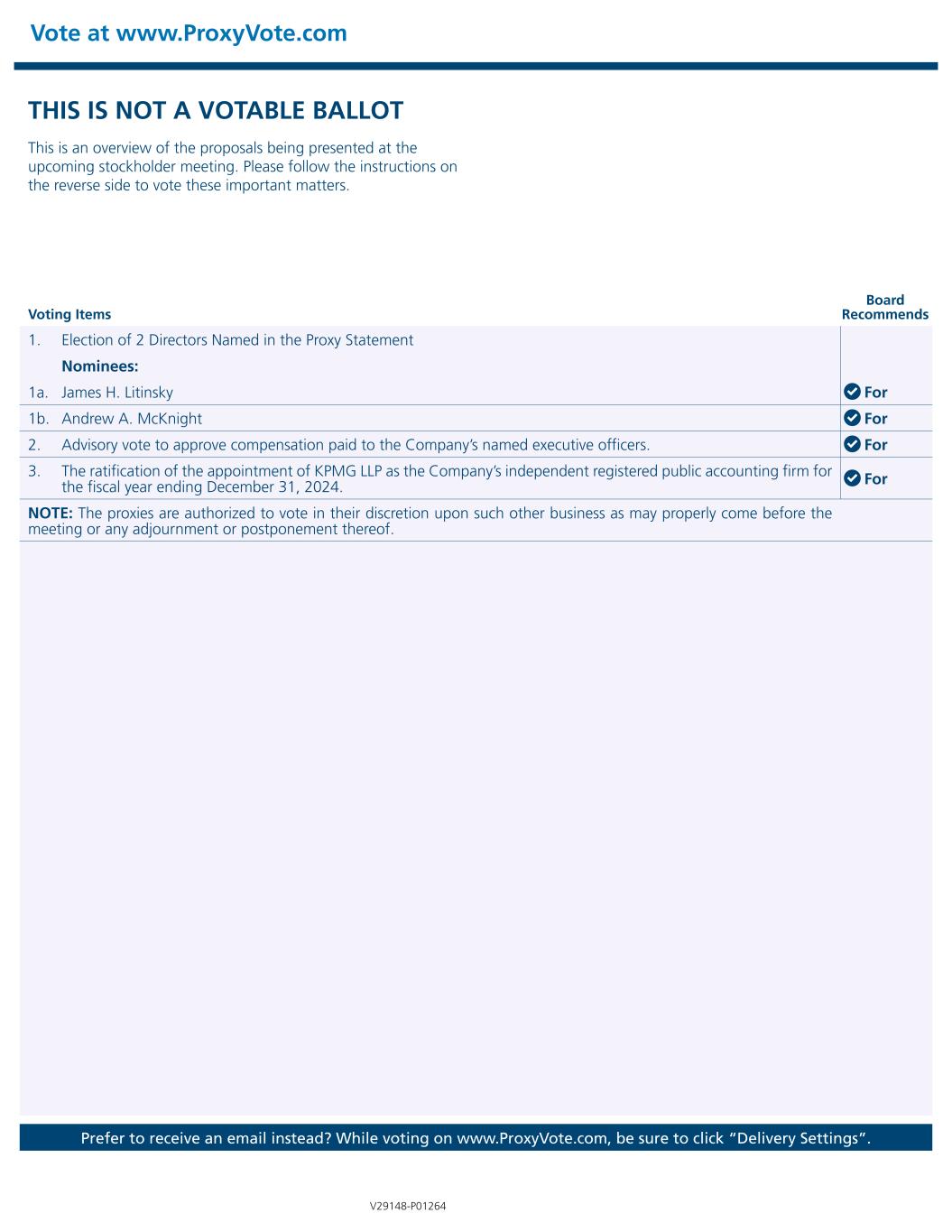 Vote at www.ProxyVote.com Prefer to receive an email instead? While voting on www.ProxyVote.com, be sure to click “Delivery Settings”. Voting Items Board Recommends V29148-P01264 THIS IS NOT A VOTABLE BALLOT This is an overview of the proposals being presented at the upcoming stockholder meeting. Please follow the instructions on the reverse side to vote these important matters. 1. Election of 2 Directors Named in the Proxy Statement Nominees: 1a. James H. Litinsky For 1b. Andrew A. McKnight For 2. Advisory vote to approve compensation paid to the Company’s named executive officers. For 3. The ratification of the appointment of KPMG LLP as the Company’s independent registered public accounting firm for the fiscal year ending December 31, 2024. For NOTE: The proxies are authorized to vote in their discretion upon such other business as may properly come before the meeting or any adjournment or postponement thereof.
