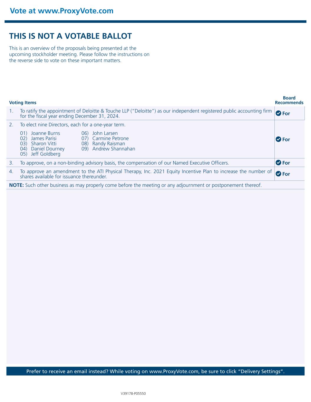Vote at www.ProxyVote.com Prefer to receive an email instead? While voting on www.ProxyVote.com, be sure to click “Delivery Settings”. Voting Items Board Recommends V39178-P05550 THIS IS NOT A VOTABLE BALLOT This is an overview of the proposals being presented at the upcoming stockholder meeting. Please follow the instructions on the reverse side to vote on these important matters. 1. To ratify the appointment of Deloitte & Touche LLP (“Deloitte”) as our independent registered public accounting firm for the fiscal year ending December 31, 2024. For 2. To elect nine Directors, each for a one-year term. For 01) Joanne Burns 02) James Parisi 03) Sharon Vitti 04) Daniel Dourney 05) Jeff Goldberg 06) John Larsen 07) Carmine Petrone 08) Randy Raisman 09) Andrew Shannahan 3. To approve, on a non-binding advisory basis, the compensation of our Named Executive Officers. For 4. To approve an amendment to the ATI Physical Therapy, Inc. 2021 Equity Incentive Plan to increase the number of shares available for issuance thereunder. For NOTE: Such other business as may properly come before the meeting or any adjournment or postponement thereof.