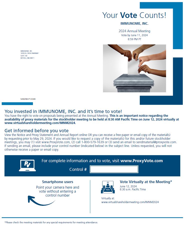 by June 11, 2024 8:59 PM PT IMMUNOME, INC. 18702 N. CREEK PARKWAY SUITE 100 BOTHELL, WA 98011You invested in IMMUNOME, INC. and it’s time to vote! You
