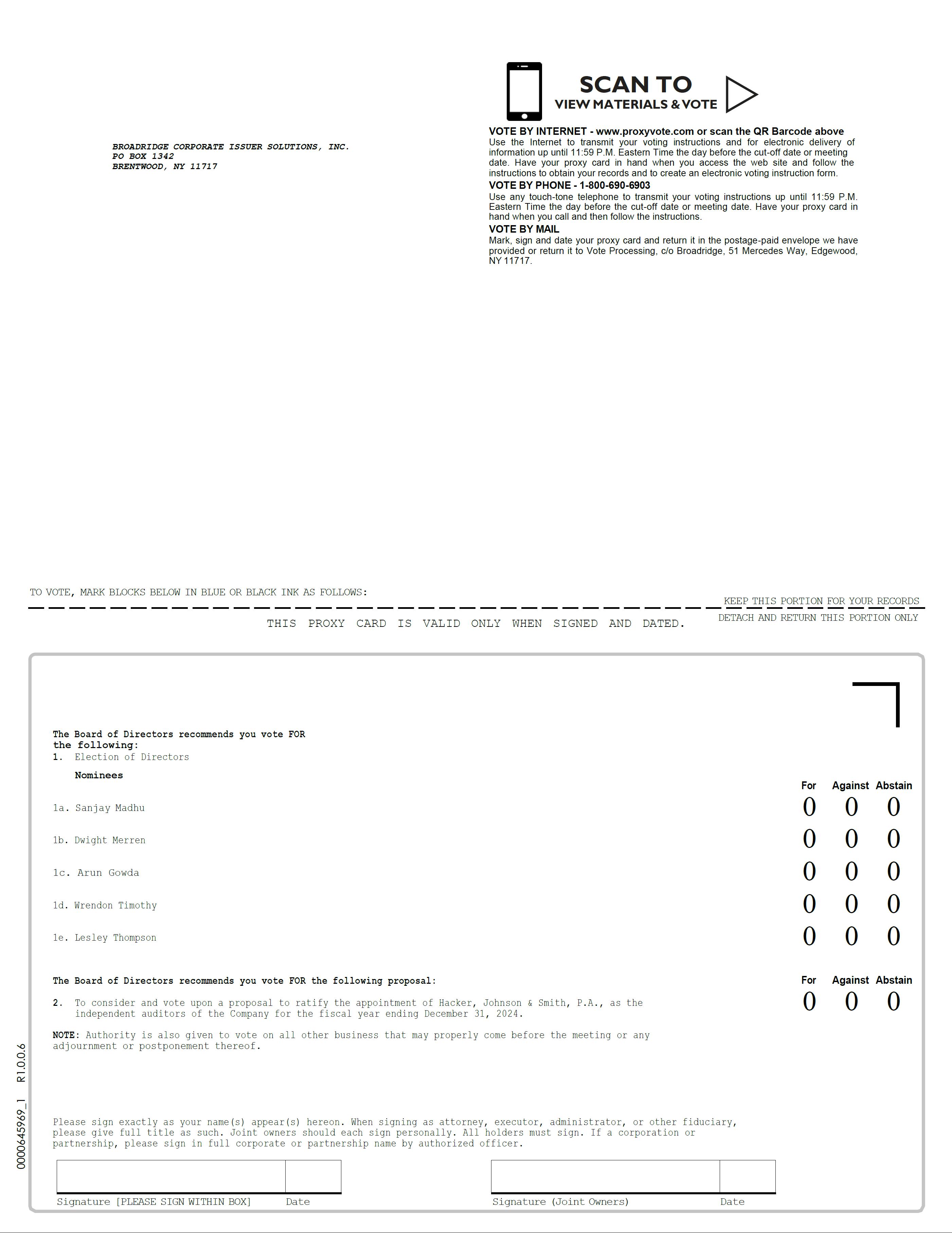| 2. | Proposal Two: to vote FOR the ratification of the appointment of Hacker, Johnson & Smith, P.A., as the independent auditors of the Company for the fiscal year ending December 31, 2024. |