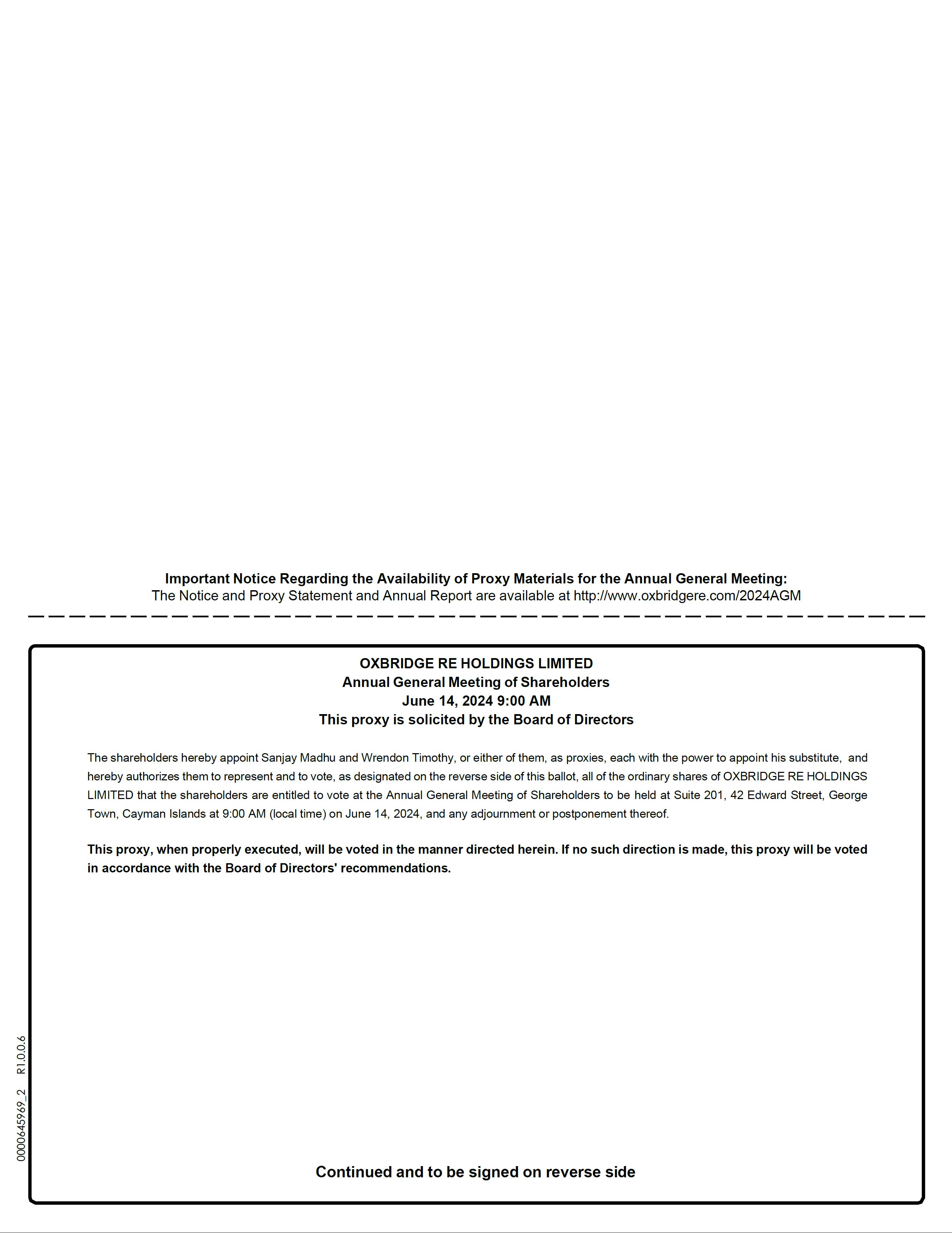 Notice is hereby given that the Annual General Meeting of Shareholders (the “Meeting”) of Oxbridge Re Holdings Limited (the “Company”) will be held at the Company’s office, Suite 201, 42 Edward Street, George Town, Cayman Islands on Friday, June 14, 2024, at 9:00 a.m. (local time), for the following purposes: