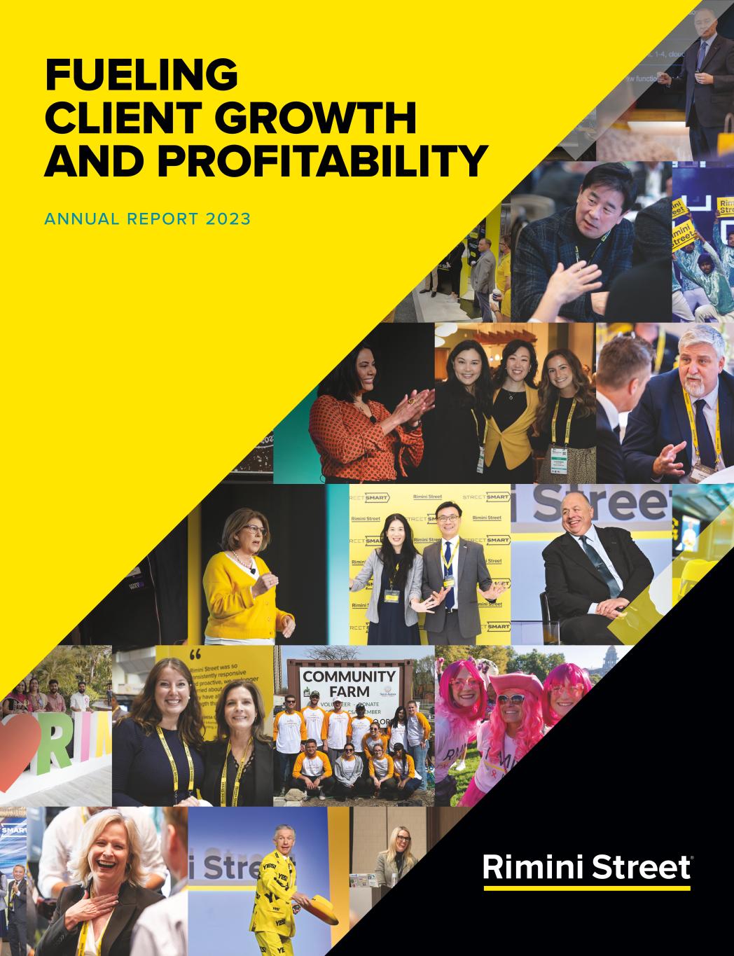 ANNUAL REPORT 2023 FUELING CLIENT GROWTH AND PROFITABILITY COMPANY Dream big, innovate boldly, and operate at the highest ethical, professional, and quality standards COLLEAGUES Build a great company that attracts, develops, inspires, and retains extraordinary people CLIENTS Improve client performance significantly COMMUNITIES Leave the world better than we found it Seth A. Ravin President, Chairman of the Board and Chief Executive Officer Jack L. Acosta Lead Independent Director Chair of Audit Committee Steve Capelli Independent Director Chair of Nominating & Corporate Governance Committee Katrinka B. McCallum Independent Director Chair of Compensation Committee Jay Snyder Independent Director Robin Murray Independent Director BOARD OF DIRECTORS CORPORATE INFORMATION OUR 4C’s Worldwide Headquarters 1700 S. Pavilion Center Drive, Suite 330 Las Vegas, NV 89135 Operations Center 6601 Koll Center Parkway, Suite 300, Pleasanton, CA 94566 Stock Listing The company’s common stock is listed on the Nasdaq Global Market under the symbol RMNI Independent Auditor KPMG LLP serves as the company’s independent registered public accounting firm Investor Inquiries Dean Pohl VP, Treasurer & Investor Relations IR@riministreet.com +1 925-523-7636 Andrew J. Terry GVP and Deputy General Counsel and Corporate Secretary aterry@riministreet.com +1 847-423-8688 Media Relations Janet Ravin VP, Global Brand, Content and Communications Committee Chair, Rimini Street Foundation pr@riministreet.com +1 702-285-3532 Transfer Agent and Registrar Continental Stock Transfer & Trust Co. cstmail@continentalstock.com +1 212-509-4000 Additional Global Offices Amsterdam Auckland Bengaluru Brisbane Chicago Dubai (UAE) Frankfurt Herzliya Pituach Hong Kong Hyderabad Kuala Lumpur London Melbourne Mexico City New York Osaka Paris Perth São Paulo Seoul Singapore Stockholm Sydney Taipei Toronto Tokyo Warsaw ©2024 Rimini Street, Inc. All rights reserved. “Rimini Street” is a registered trademark of Rimini Street, Inc. in the United States and other countries, and Rimini Street, the Rimini Street logo, and combinations thereof, and other marks marked by TM are trademarks of Rimini Street, Inc. All other trademarks remain the property of their respective owners, and unless otherwise specified, Rimini Street claims no affiliation, endorsement, or association with any such trademark holder or other companies referenced herein.