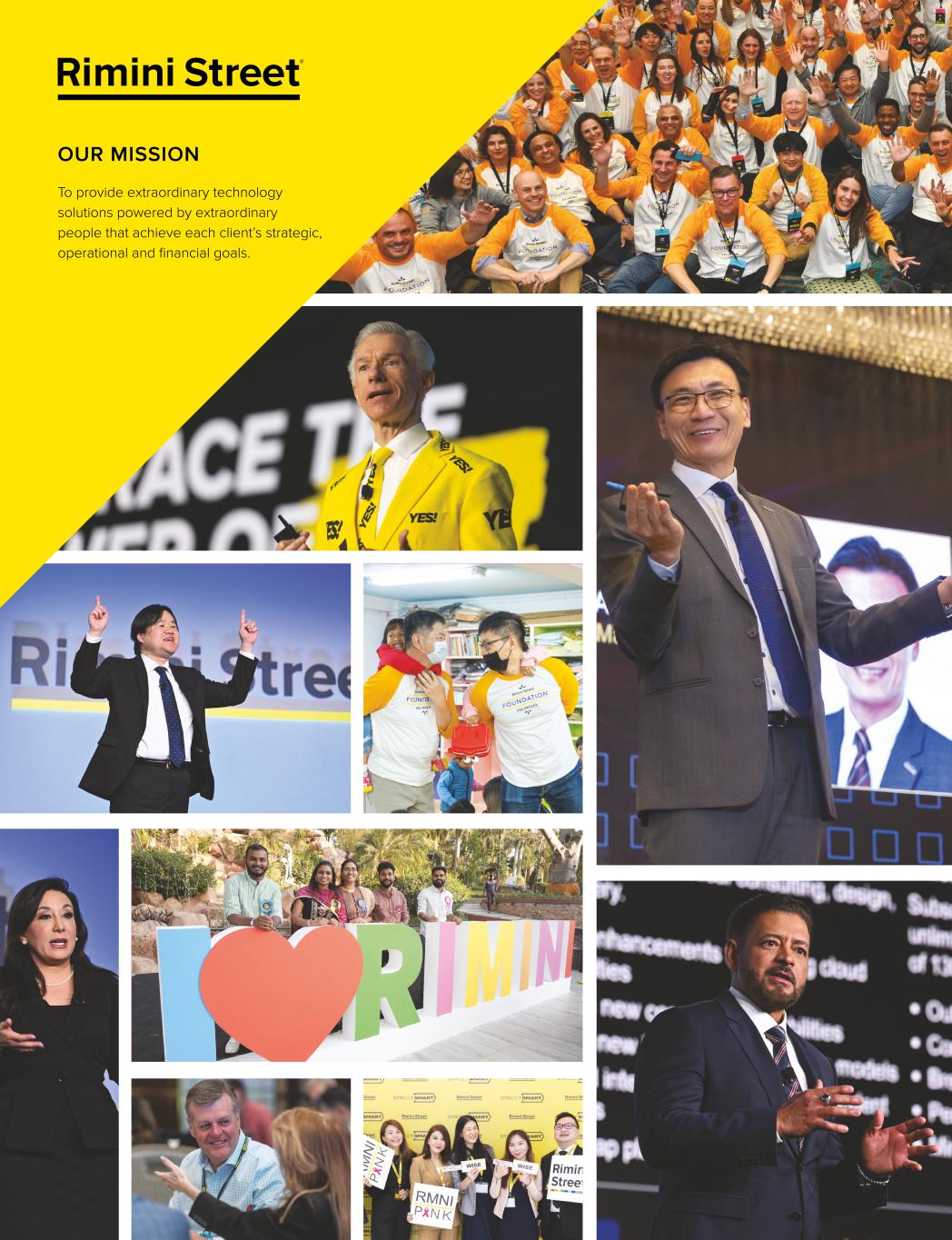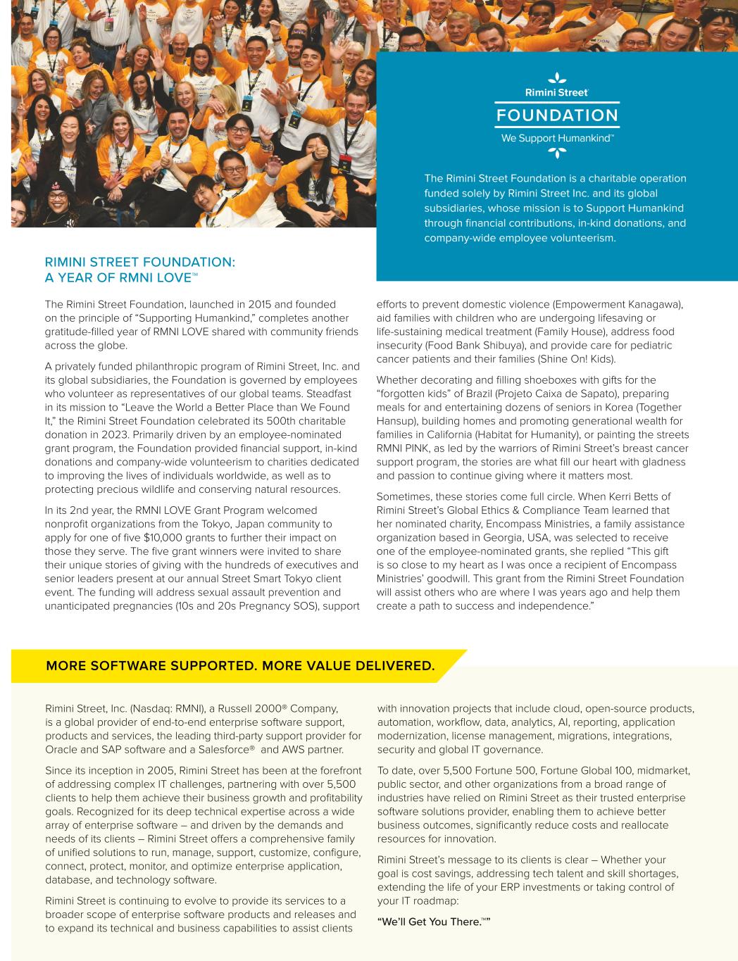 To provide extraordinary technology solutions powered by extraordinary people that achieve each client’s strategic, operational and financial goals. OUR MISSION The Rimini Street Foundation, launched in 2015 and founded on the principle of “Supporting Humankind,” completes another gratitude-filled year of RMNI LOVE shared with community friends across the globe. A privately funded philanthropic program of Rimini Street, Inc. and its global subsidiaries, the Foundation is governed by employees who volunteer as representatives of our global teams. Steadfast in its mission to “Leave the World a Better Place than We Found It,” the Rimini Street Foundation celebrated its 500th charitable donation in 2023. Primarily driven by an employee-nominated grant program, the Foundation provided financial support, in-kind donations and company-wide volunteerism to charities dedicated to improving the lives of individuals worldwide, as well as to protecting precious wildlife and conserving natural resources. In its 2nd year, the RMNI LOVE Grant Program welcomed nonprofit organizations from the Tokyo, Japan community to apply for one of five $10,000 grants to further their impact on those they serve. The five grant winners were invited to share their unique stories of giving with the hundreds of executives and senior leaders present at our annual Street Smart Tokyo client event. The funding will address sexual assault prevention and unanticipated pregnancies (10s and 20s Pregnancy SOS), support efforts to prevent domestic violence (Empowerment Kanagawa), aid families with children who are undergoing lifesaving or life-sustaining medical treatment (Family House), address food insecurity (Food Bank Shibuya), and provide care for pediatric cancer patients and their families (Shine On! Kids). Whether decorating and filling shoeboxes with gifts for the “forgotten kids” of Brazil (Projeto Caixa de Sapato), preparing meals for and entertaining dozens of seniors in Korea (Together Hansup), building homes and promoting generational wealth for families in California (Habitat for Humanity), or painting the streets RMNI PINK, as led by the warriors of Rimini Street’s breast cancer support program, the stories are what fill our heart with gladness and passion to continue giving where it matters most. Sometimes, these stories come full circle. When Kerri Betts of Rimini Street’s Global Ethics & Compliance Team learned that her nominated charity, Encompass Ministries, a family assistance organization based in Georgia, USA, was selected to receive one of the employee-nominated grants, she replied “This gift is so close to my heart as I was once a recipient of Encompass Ministries’ goodwill. This grant from the Rimini Street Foundation will assist others who are where I was years ago and help them create a path to success and independence.” The Rimini Street Foundation is a charitable operation funded solely by Rimini Street Inc. and its global subsidiaries, whose mission is to Support Humankind through financial contributions, in-kind donations, and company-wide employee volunteerism. RIMINI STREET FOUNDATION: A YEAR OF RMNI LOVE™ Rimini Street, Inc. (Nasdaq: RMNI), a Russell 2000® Company, is a global provider of end-to-end enterprise software support, products and services, the leading third-party support provider for Oracle and SAP software and a Salesforce® and AWS partner. Since its inception in 2005, Rimini Street has been at the forefront of addressing complex IT challenges, partnering with over 5,500 clients to help them achieve their business growth and profitability goals. Recognized for its deep technical expertise across a wide array of enterprise software – and driven by the demands and needs of its clients – Rimini Street offers a comprehensive family of unified solutions to run, manage, support, customize, configure, connect, protect, monitor, and optimize enterprise application, database, and technology software. Rimini Street is continuing to evolve to provide its services to a broader scope of enterprise software products and releases and to expand its technical and business capabilities to assist clients with innovation projects that include cloud, open-source products, automation, workflow, data, analytics, AI, reporting, application modernization, license management, migrations, integrations, security and global IT governance. To date, over 5,500 Fortune 500, Fortune Global 100, midmarket, public sector, and other organizations from a broad range of industries have relied on Rimini Street as their trusted enterprise software solutions provider, enabling them to achieve better business outcomes, significantly reduce costs and reallocate resources for innovation. Rimini Street’s message to its clients is clear – Whether your goal is cost savings, addressing tech talent and skill shortages, extending the life of your ERP investments or taking control of your IT roadmap: “We’ll Get You There.™” MORE SOFTWARE SUPPORTED. MORE VALUE DELIVERED.