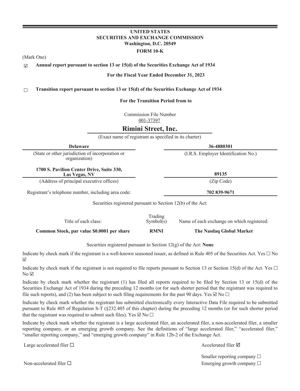 UNITED STATES SECURITIES AND EXCHANGE COMMISSION Washington, D.C. 20549 FORM 10-K (Mark One) ☑ Annual report pursuant to section 13 or 15(d) of the Securities Exchange Act of 1934 For the Fiscal Year Ended December 31, 2023 ☐ Transition report pursuant to section 13 or 15(d) of the Securities Exchange Act of 1934 For the Transition Period from to Commission File Number 001-37397 Rimini Street, Inc. (Exact name of registrant as specified in its charter) Delaware 36-4880301 (State or other jurisdiction of incorporation or organization) (I.R.S. Employer Identification No.) 1700 S. Pavilion Center Drive, Suite 330, Las Vegas, NV 89135 (Address of principal executive offices) (Zip Code) Registrant’s telephone number, including area code: 702 839-9671 Securities registered pursuant to Section 12(b) of the Act: Title of each class: Trading Symbol(s) Name of each exchange on which registered: Common Stock, par value $0.0001 per share RMNI The Nasdaq Global Market Securities registered pursuant to Section 12(g) of the Act: None Indicate by check mark if the registrant is a well-known seasoned issuer, as defined in Rule 405 of the Securities Act. Yes ☐ No ☑ Indicate by check mark if the registrant is not required to file reports pursuant to Section 13 or Section 15(d) of the Act. Yes ☐ No ☑ Indicate by check mark whether the registrant (1) has filed all reports required to be filed by Section 13 or 15(d) of the Securities Exchange Act of 1934 during the preceding 12 months (or for such shorter period that the registrant was required to file such reports), and (2) has been subject to such filing requirements for the past 90 days. Yes ☑ No ☐ Indicate by check mark whether the registrant has submitted electronically every Interactive Data File required to be submitted pursuant to Rule 405 of Regulation S-T (§232.405 of this chapter) during the preceding 12 months (or for such shorter period that the registrant was required to submit such files). Yes ☑ No ☐ Indicate by check mark whether the registrant is a large accelerated filer, an accelerated filer, a non-accelerated filer, a smaller reporting company, or an emerging growth company. See the definitions of “large accelerated filer,” “accelerated filer,” “smaller reporting company,” and “emerging growth company” in Rule 12b-2 of the Exchange Act. Large accelerated filer ¨ Accelerated filer þ Smaller reporting company ☐ Non-accelerated filer ¨ Emerging growth company ☐