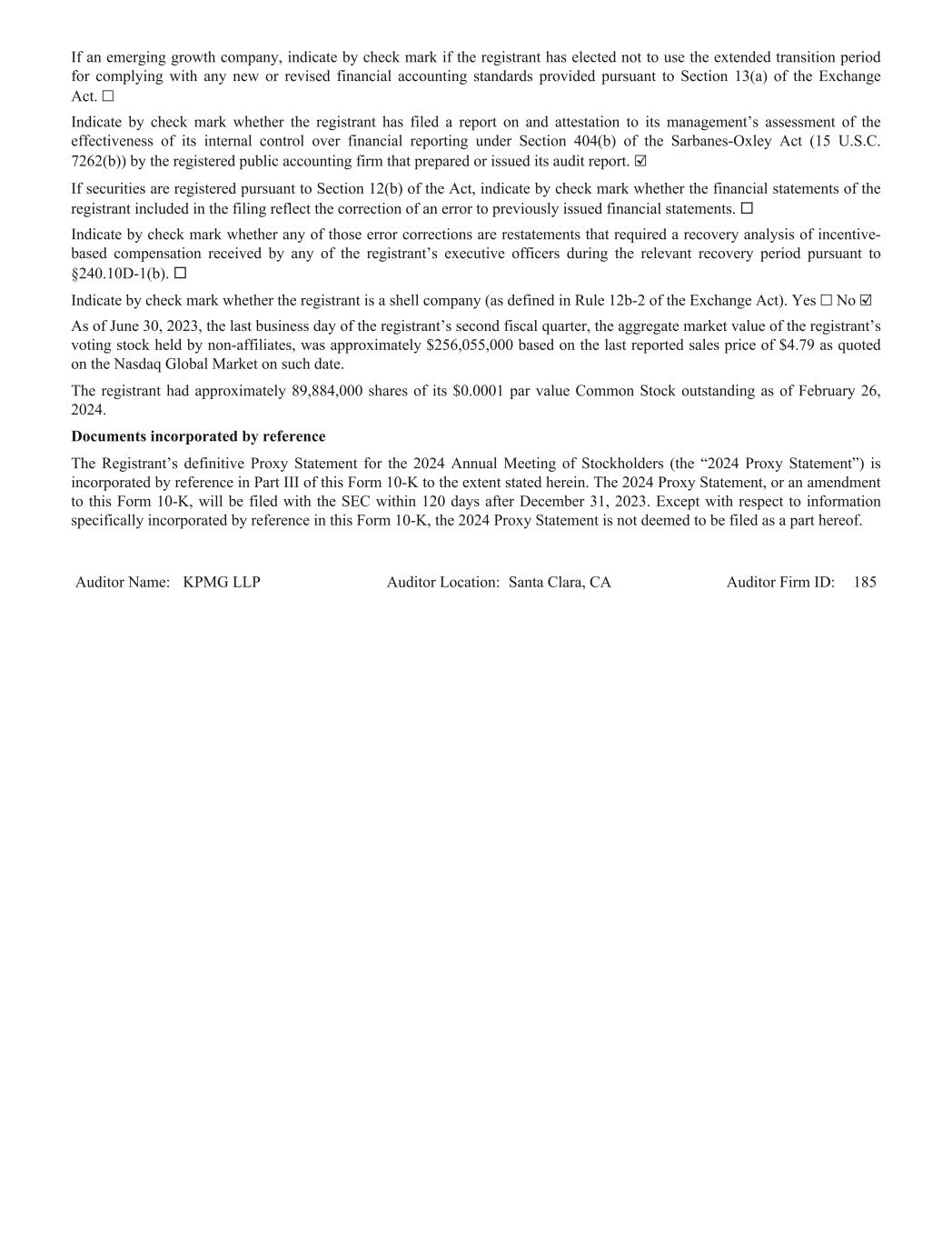 If an emerging growth company, indicate by check mark if the registrant has elected not to use the extended transition period for complying with any new or revised financial accounting standards provided pursuant to Section 13(a) of the Exchange Act. ☐ Indicate by check mark whether the registrant has filed a report on and attestation to its management’s assessment of the effectiveness of its internal control over financial reporting under Section 404(b) of the Sarbanes-Oxley Act (15 U.S.C. 7262(b)) by the registered public accounting firm that prepared or issued its audit report. ☑ If securities are registered pursuant to Section 12(b) of the Act, indicate by check mark whether the financial statements of the registrant included in the filing reflect the correction of an error to previously issued financial statements. ¨ Indicate by check mark whether any of those error corrections are restatements that required a recovery analysis of incentive- based compensation received by any of the registrant’s executive officers during the relevant recovery period pursuant to §240.10D-1(b). ¨ Indicate by check mark whether the registrant is a shell company (as defined in Rule 12b-2 of the Exchange Act). Yes ☐ No ☑ As of June 30, 2023, the last business day of the registrant’s second fiscal quarter, the aggregate market value of the registrant’s voting stock held by non-affiliates, was approximately $256,055,000 based on the last reported sales price of $4.79 as quoted on the Nasdaq Global Market on such date. The registrant had approximately 89,884,000 shares of its $0.0001 par value Common Stock outstanding as of February 26, 2024. Documents incorporated by reference The Registrant’s definitive Proxy Statement for the 2024 Annual Meeting of Stockholders (the “2024 Proxy Statement”) is incorporated by reference in Part III of this Form 10-K to the extent stated herein. The 2024 Proxy Statement, or an amendment to this Form 10-K, will be filed with the SEC within 120 days after December 31, 2023. Except with respect to information specifically incorporated by reference in this Form 10-K, the 2024 Proxy Statement is not deemed to be filed as a part hereof. Auditor Name: KPMG LLP Auditor Location: Santa Clara, CA Auditor Firm ID: 185