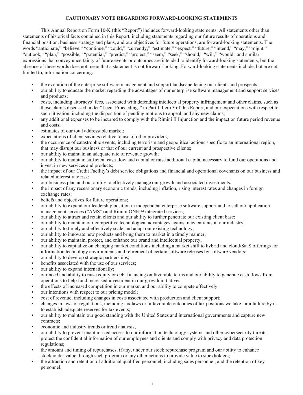 CAUTIONARY NOTE REGARDING FORWARD-LOOKING STATEMENTS This Annual Report on Form 10-K (this “Report”) includes forward-looking statements. All statements other than statements of historical facts contained in this Report, including statements regarding our future results of operations and financial position, business strategy and plans, and our objectives for future operations, are forward-looking statements. The words “anticipate,” “believe,” “continue,” “could,” “currently,” “estimate,” “expect,” “future,” “intend,” “may,” “might,” “outlook,” “plan,” “possible,” “potential,” “predict,” “project,” “seem,” “seek,” “should,” “will,” “would” and similar expressions that convey uncertainty of future events or outcomes are intended to identify forward-looking statements, but the absence of these words does not mean that a statement is not forward-looking. Forward-looking statements include, but are not limited to, information concerning: • the evolution of the enterprise software management and support landscape facing our clients and prospects; • our ability to educate the market regarding the advantages of our enterprise software management and support services and products; • costs, including attorneys’ fees, associated with defending intellectual property infringement and other claims, such as those claims discussed under “Legal Proceedings” in Part I, Item 3 of this Report, and our expectations with respect to such litigation, including the disposition of pending motions to appeal, and any new claims; • any additional expenses to be incurred to comply with the Rimini II Injunction and the impact on future period revenue and costs; • estimates of our total addressable market; • expectations of client savings relative to use of other providers; • the occurrence of catastrophic events, including terrorism and geopolitical actions specific to an international region, that may disrupt our business or that of our current and prospective clients; • our ability to maintain an adequate rate of revenue growth; • our ability to maintain sufficient cash flow and capital or raise additional capital necessary to fund our operations and invest in new services and products; • the impact of our Credit Facility’s debt service obligations and financial and operational covenants on our business and related interest rate risk; • our business plan and our ability to effectively manage our growth and associated investments; • the impact of any recessionary economic trends, including inflation, rising interest rates and changes in foreign exchange rates; • beliefs and objectives for future operations; • our ability to expand our leadership position in independent enterprise software support and to sell our application management services (“AMS”) and Rimini ONE™ integrated services; • our ability to attract and retain clients and our ability to further penetrate our existing client base; • our ability to maintain our competitive technological advantages against new entrants in our industry; • our ability to timely and effectively scale and adapt our existing technology; • our ability to innovate new products and bring them to market in a timely manner; • our ability to maintain, protect, and enhance our brand and intellectual property; • our ability to capitalize on changing market conditions including a market shift to hybrid and cloud/SaaS offerings for information technology environments and retirement of certain software releases by software vendors; • our ability to develop strategic partnerships; • benefits associated with the use of our services; • our ability to expand internationally; • our need and ability to raise equity or debt financing on favorable terms and our ability to generate cash flows from operations to help fund increased investment in our growth initiatives; • the effects of increased competition in our market and our ability to compete effectively; • our intentions with respect to our pricing model; • cost of revenue, including changes in costs associated with production and client support; • changes in laws or regulations, including tax laws or unfavorable outcomes of tax positions we take, or a failure by us to establish adequate reserves for tax events; • our ability to maintain our good standing with the United States and international governments and capture new contracts; • economic and industry trends or trend analysis; • our ability to prevent unauthorized access to our information technology systems and other cybersecurity threats, protect the confidential information of our employees and clients and comply with privacy and data protection regulations; • the amount and timing of repurchases, if any, under our stock repurchase program and our ability to enhance stockholder value through such program or any other actions to provide value to stockholders; • the attraction and retention of additional qualified personnel, including sales personnel, and the retention of key personnel; -ii-
