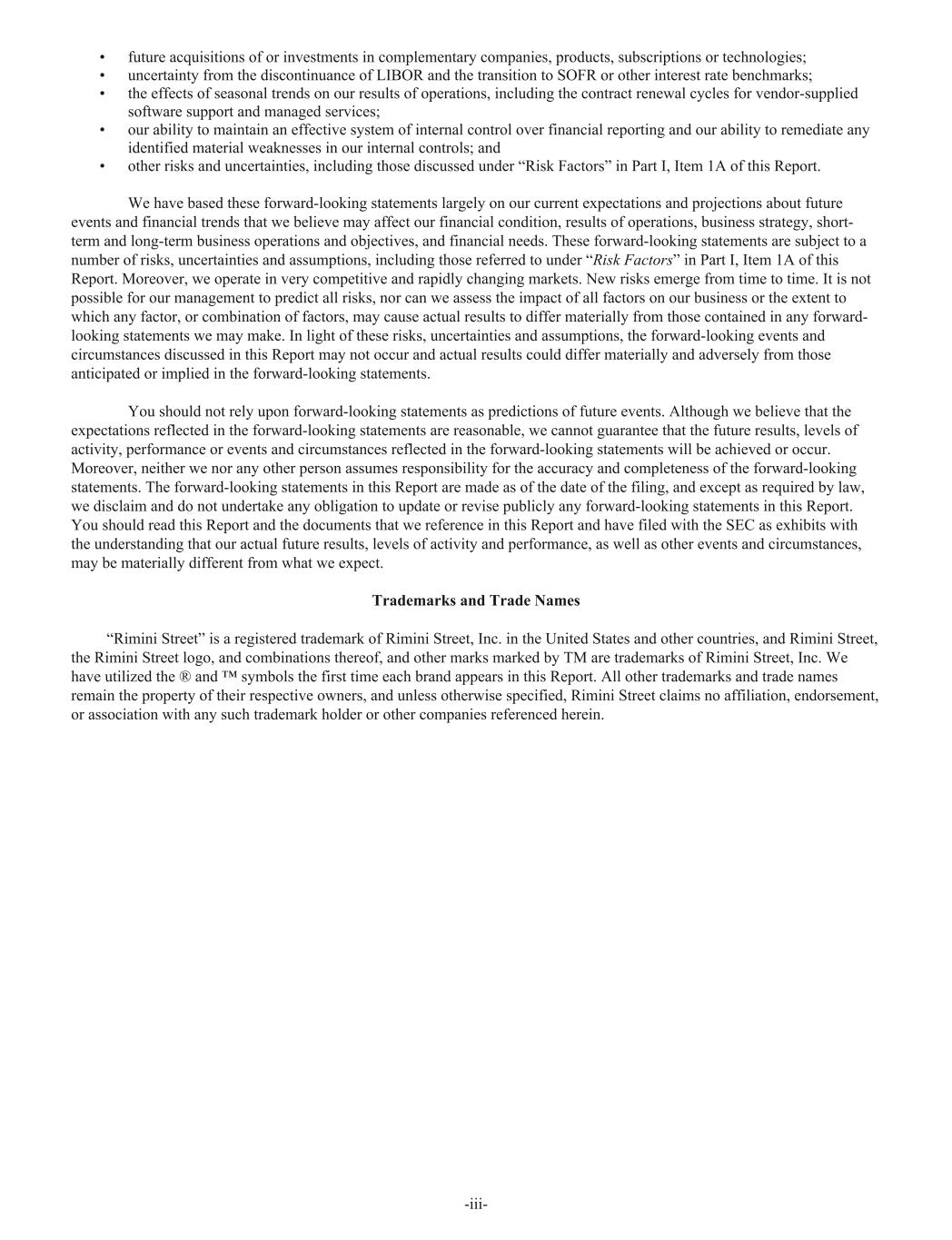 • future acquisitions of or investments in complementary companies, products, subscriptions or technologies; • uncertainty from the discontinuance of LIBOR and the transition to SOFR or other interest rate benchmarks; • the effects of seasonal trends on our results of operations, including the contract renewal cycles for vendor-supplied software support and managed services; • our ability to maintain an effective system of internal control over financial reporting and our ability to remediate any identified material weaknesses in our internal controls; and • other risks and uncertainties, including those discussed under “Risk Factors” in Part I, Item 1A of this Report. We have based these forward-looking statements largely on our current expectations and projections about future events and financial trends that we believe may affect our financial condition, results of operations, business strategy, short- term and long-term business operations and objectives, and financial needs. These forward-looking statements are subject to a number of risks, uncertainties and assumptions, including those referred to under “Risk Factors” in Part I, Item 1A of this Report. Moreover, we operate in very competitive and rapidly changing markets. New risks emerge from time to time. It is not possible for our management to predict all risks, nor can we assess the impact of all factors on our business or the extent to which any factor, or combination of factors, may cause actual results to differ materially from those contained in any forward- looking statements we may make. In light of these risks, uncertainties and assumptions, the forward-looking events and circumstances discussed in this Report may not occur and actual results could differ materially and adversely from those anticipated or implied in the forward-looking statements. You should not rely upon forward-looking statements as predictions of future events. Although we believe that the expectations reflected in the forward-looking statements are reasonable, we cannot guarantee that the future results, levels of activity, performance or events and circumstances reflected in the forward-looking statements will be achieved or occur. Moreover, neither we nor any other person assumes responsibility for the accuracy and completeness of the forward-looking statements. The forward-looking statements in this Report are made as of the date of the filing, and except as required by law, we disclaim and do not undertake any obligation to update or revise publicly any forward-looking statements in this Report. You should read this Report and the documents that we reference in this Report and have filed with the SEC as exhibits with the understanding that our actual future results, levels of activity and performance, as well as other events and circumstances, may be materially different from what we expect. Trademarks and Trade Names “Rimini Street” is a registered trademark of Rimini Street, Inc. in the United States and other countries, and Rimini Street, the Rimini Street logo, and combinations thereof, and other marks marked by TM are trademarks of Rimini Street, Inc. We have utilized the ® and ™ symbols the first time each brand appears in this Report. All other trademarks and trade names remain the property of their respective owners, and unless otherwise specified, Rimini Street claims no affiliation, endorsement, or association with any such trademark holder or other companies referenced herein. -iii-