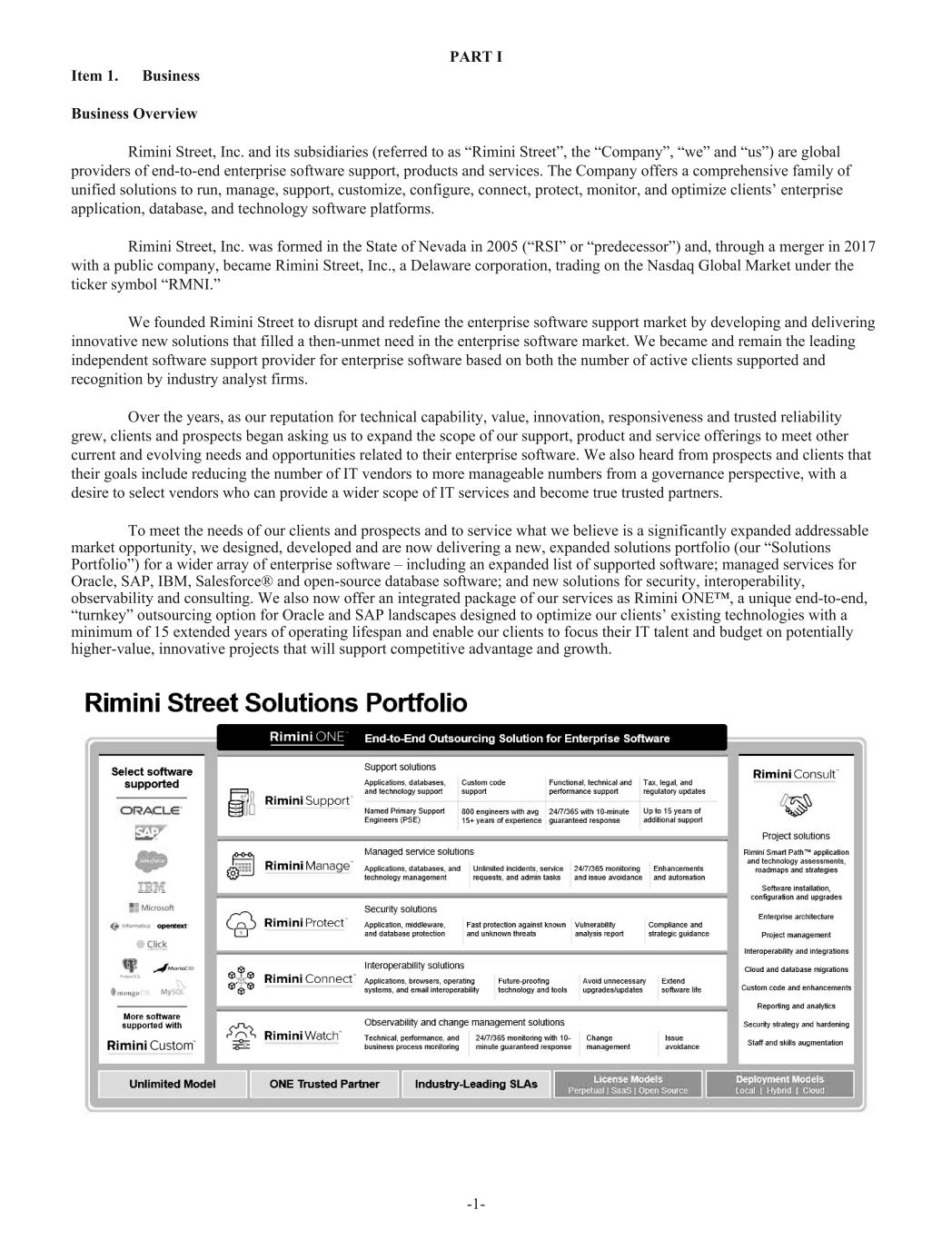 PART I Item 1. Business Business Overview Rimini Street, Inc. and its subsidiaries (referred to as “Rimini Street”, the “Company”, “we” and “us”) are global providers of end-to-end enterprise software support, products and services. The Company offers a comprehensive family of unified solutions to run, manage, support, customize, configure, connect, protect, monitor, and optimize clients’ enterprise application, database, and technology software platforms. Rimini Street, Inc. was formed in the State of Nevada in 2005 (“RSI” or “predecessor”) and, through a merger in 2017 with a public company, became Rimini Street, Inc., a Delaware corporation, trading on the Nasdaq Global Market under the ticker symbol “RMNI.” We founded Rimini Street to disrupt and redefine the enterprise software support market by developing and delivering innovative new solutions that filled a then-unmet need in the enterprise software market. We became and remain the leading independent software support provider for enterprise software based on both the number of active clients supported and recognition by industry analyst firms. Over the years, as our reputation for technical capability, value, innovation, responsiveness and trusted reliability grew, clients and prospects began asking us to expand the scope of our support, product and service offerings to meet other current and evolving needs and opportunities related to their enterprise software. We also heard from prospects and clients that their goals include reducing the number of IT vendors to more manageable numbers from a governance perspective, with a desire to select vendors who can provide a wider scope of IT services and become true trusted partners. To meet the needs of our clients and prospects and to service what we believe is a significantly expanded addressable market opportunity, we designed, developed and are now delivering a new, expanded solutions portfolio (our “Solutions Portfolio”) for a wider array of enterprise software – including an expanded list of supported software; managed services for Oracle, SAP, IBM, Salesforce® and open-source database software; and new solutions for security, interoperability, observability and consulting. We also now offer an integrated package of our services as Rimini ONE™, a unique end-to-end, “turnkey” outsourcing option for Oracle and SAP landscapes designed to optimize our clients’ existing technologies with a minimum of 15 extended years of operating lifespan and enable our clients to focus their IT talent and budget on potentially higher-value, innovative projects that will support competitive advantage and growth. -1-