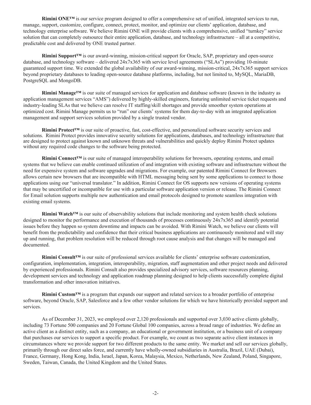 Rimini ONE™ is our service program designed to offer a comprehensive set of unified, integrated services to run, manage, support, customize, configure, connect, protect, monitor, and optimize our clients’ application, database, and technology enterprise software. We believe Rimini ONE will provide clients with a comprehensive, unified “turnkey” service solution that can completely outsource their entire application, database, and technology infrastructure – all at a competitive, predictable cost and delivered by ONE trusted partner. Rimini Support™ is our award-winning, mission-critical support for Oracle, SAP, proprietary and open-source database, and technology software – delivered 24x7x365 with service level agreements (“SLAs”) providing 10-minute guaranteed support time. We extended the global availability of our award-winning, mission-critical, 24x7x365 support services beyond proprietary databases to leading open-source database platforms, including, but not limited to, MySQL, MariaDB, PostgreSQL and MongoDB. Rimini Manage™ is our suite of managed services for application and database software (known in the industry as application management services “AMS”) delivered by highly-skilled engineers, featuring unlimited service ticket requests and industry-leading SLAs that we believe can resolve IT staffing/skill shortages and provide smoother system operations at optimized cost. Rimini Manage permits us to “run” our clients’ systems for them day-to-day with an integrated application management and support services solution provided by a single trusted vendor. Rimini Protect™ is our suite of proactive, fast, cost-effective, and personalized software security services and solutions. Rimini Protect provides innovative security solutions for applications, databases, and technology infrastructure that are designed to protect against known and unknown threats and vulnerabilities and quickly deploy Rimini Protect updates without any required code changes to the software being protected. Rimini Connect™ is our suite of managed interoperability solutions for browsers, operating systems, and email systems that we believe can enable continued utilization of and integration with existing software and infrastructure without the need for expensive system and software upgrades and migrations. For example, our patented Rimini Connect for Browsers allows certain new browsers that are incompatible with HTML messaging being sent by some applications to connect to those applications using our “universal translator.” In addition, Rimini Connect for OS supports new versions of operating systems that may be uncertified or incompatible for use with a particular software application version or release. The Rimini Connect for Email solution supports multiple new authentication and email protocols designed to promote seamless integration with existing email systems. Rimini Watch™ is our suite of observability solutions that include monitoring and system health check solutions designed to monitor the performance and execution of thousands of processes continuously 24x7x365 and identify potential issues before they happen so system downtime and impacts can be avoided. With Rimini Watch, we believe our clients will benefit from the predictability and confidence that their critical business applications are continuously monitored and will stay up and running, that problem resolution will be reduced through root cause analysis and that changes will be managed and documented. Rimini Consult™ is our suite of professional services available for clients’ enterprise software customization, configuration, implementation, integration, interoperability, migration, staff augmentation and other project needs and delivered by experienced professionals. Rimini Consult also provides specialized advisory services, software resources planning, development services and technology and application roadmap planning designed to help clients successfully complete digital transformation and other innovation initiatives. Rimini Custom™ is a program that expands our support and related services to a broader portfolio of enterprise software, beyond Oracle, SAP, Salesforce and a few other vendor solutions for which we have historically provided support and services. As of December 31, 2023, we employed over 2,120 professionals and supported over 3,030 active clients globally, including 73 Fortune 500 companies and 20 Fortune Global 100 companies, across a broad range of industries. We define an active client as a distinct entity, such as a company, an educational or government institution, or a business unit of a company that purchases our services to support a specific product. For example, we count as two separate active client instances in circumstances where we provide support for two different products to the same entity. We market and sell our services globally, primarily through our direct sales force, and currently have wholly-owned subsidiaries in Australia, Brazil, UAE (Dubai), France, Germany, Hong Kong, India, Israel, Japan, Korea, Malaysia, Mexico, Netherlands, New Zealand, Poland, Singapore, Sweden, Taiwan, Canada, the United Kingdom and the United States. -2-