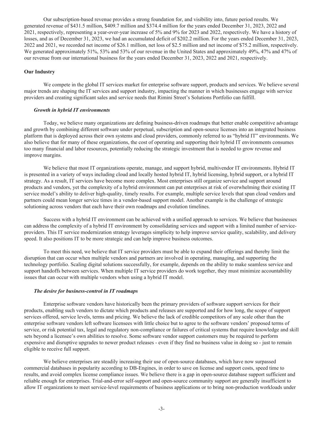 Our subscription-based revenue provides a strong foundation for, and visibility into, future period results. We generated revenue of $431.5 million, $409.7 million and $374.4 million for the years ended December 31, 2023, 2022 and 2021, respectively, representing a year-over-year increase of 5% and 9% for 2023 and 2022, respectively. We have a history of losses, and as of December 31, 2023, we had an accumulated deficit of $202.2 million. For the years ended December 31, 2023, 2022 and 2021, we recorded net income of $26.1 million, net loss of $2.5 million and net income of $75.2 million, respectively. We generated approximately 51%, 53% and 53% of our revenue in the United States and approximately 49%, 47% and 47% of our revenue from our international business for the years ended December 31, 2023, 2022 and 2021, respectively. Our Industry We compete in the global IT services market for enterprise software support, products and services. We believe several major trends are shaping the IT services and support industry, impacting the manner in which businesses engage with service providers and creating significant sales and service needs that Rimini Street’s Solutions Portfolio can fulfill. Growth in hybrid IT environments Today, we believe many organizations are defining business-driven roadmaps that better enable competitive advantage and growth by combining different software under perpetual, subscription and open-source licenses into an integrated business platform that is deployed across their own systems and cloud providers, commonly referred to as “hybrid IT” environments. We also believe that for many of these organizations, the cost of operating and supporting their hybrid IT environments consumes too many financial and labor resources, potentially reducing the strategic investment that is needed to grow revenue and improve margins. We believe that most IT organizations operate, manage, and support hybrid, multivendor IT environments. Hybrid IT is presented in a variety of ways including cloud and locally hosted hybrid IT, hybrid licensing, hybrid support, or a hybrid IT strategy. As a result, IT services have become more complex. Most enterprises still organize service and support around products and vendors, yet the complexity of a hybrid environment can put enterprises at risk of overwhelming their existing IT service model’s ability to deliver high-quality, timely results. For example, multiple service levels that span cloud vendors and partners could mean longer service times in a vendor-based support model. Another example is the challenge of strategic solutioning across vendors that each have their own roadmaps and evolution timelines. Success with a hybrid IT environment can be achieved with a unified approach to services. We believe that businesses can address the complexity of a hybrid IT environment by consolidating services and support with a limited number of service- providers. This IT service modernization strategy leverages simplicity to help improve service quality, scalability, and delivery speed. It also positions IT to be more strategic and can help improve business outcomes. To meet this need, we believe that IT service providers must be able to expand their offerings and thereby limit the disruption that can occur when multiple vendors and partners are involved in operating, managing, and supporting the technology portfolio. Scaling digital solutions successfully, for example, depends on the ability to make seamless service and support handoffs between services. When multiple IT service providers do work together, they must minimize accountability issues that can occur with multiple vendors when using a hybrid IT model. The desire for business-control in IT roadmaps Enterprise software vendors have historically been the primary providers of software support services for their products, enabling such vendors to dictate which products and releases are supported and for how long, the scope of support services offered, service levels, terms and pricing. We believe the lack of credible competitors of any scale other than the enterprise software vendors left software licensees with little choice but to agree to the software vendors’ proposed terms of service, or risk potential tax, legal and regulatory non-compliance or failures of critical systems that require knowledge and skill sets beyond a licensee’s own abilities to resolve. Some software vendor support customers may be required to perform expensive and disruptive upgrades to newer product releases - even if they find no business value in doing so - just to remain eligible to receive full support. We believe enterprises are steadily increasing their use of open-source databases, which have now surpassed commercial databases in popularity according to DB-Engines, in order to save on license and support costs, speed time to results, and avoid complex license compliance issues. We believe there is a gap in open-source database support sufficient and reliable enough for enterprises. Trial-and-error self-support and open-source community support are generally insufficient to allow IT organizations to meet service-level requirements of business applications or to bring non-production workloads under -3-