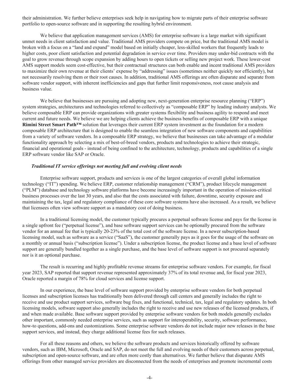 their administration. We further believe enterprises seek help in navigating how to migrate parts of their enterprise software portfolio to open-source software and in supporting the resulting hybrid environment. We believe that application management services (AMS) for enterprise software is a large market with significant unmet needs in client satisfaction and value. Traditional AMS providers compete on price, but the traditional AMS model is broken with a focus on a “land and expand” model based on initially cheaper, less-skilled workers that frequently leads to higher costs, poor client satisfaction and potential degradation in service over time. Providers may under-bid contracts with the goal to grow revenue through scope expansion by adding hours to open tickets or selling new project work. These lower-cost AMS support models seem cost-effective, but their contractual structures can both enable and incent traditional AMS providers to maximize their own revenue at their clients’ expense by “addressing” issues (sometimes neither quickly nor efficiently), but not necessarily resolving them or their root causes. In addition, traditional AMS offerings are often disparate and separate from software vendor support, with inherent inefficiencies and gaps that further limit responsiveness, root cause analysis and business value. We believe that businesses are pursuing and adopting new, next-generation enterprise resource planning (“ERP”) system strategies, architectures and technologies referred to collectively as “composable ERP” by leading industry analysts. We believe composable ERP can provide organizations with greater systems flexibility and business agility to respond and meet current and future needs. We believe we are helping clients achieve the business benefits of composable ERP with a unique Rimini Street Smart Path™ solution that leverages their current ERP system investment as the foundation for a modern composable ERP architecture that is designed to enable the seamless integration of new software components and capabilities from a variety of software vendors. In a composable ERP strategy, we believe that businesses can take advantage of a modular functionality approach by selecting a mix of best-of-breed vendors, products and technologies to achieve their strategic, financial and operational goals - instead of being confined to the architecture, technology, products and capabilities of a single ERP software vendor like SAP or Oracle. Traditional IT service offerings not meeting full and evolving client needs Enterprise software support, products and services is one of the largest categories of overall global information technology (“IT”) spending. We believe ERP, customer relationship management (“CRM”), product lifecycle management (“PLM”) database and technology software platforms have become increasingly important in the operation of mission-critical business processes over the last 30 years, and also that the costs associated with failure, downtime, security exposure and maintaining the tax, legal and regulatory compliance of these core software systems have also increased. As a result, we believe that licensees often view software support as a mandatory cost of doing business. In a traditional licensing model, the customer typically procures a perpetual software license and pays for the license in a single upfront fee (“perpetual license”), and base software support services can be optionally procured from the software vendor for an annual fee that is typically 20-23% of the total cost of the software license. In a newer subscription-based licensing model, such as software as a service (“SaaS”), the customer generally pays as it goes for the usage of the software on a monthly or annual basis (“subscription license”). Under a subscription license, the product license and a base level of software support are generally bundled together as a single purchase, and the base level of software support is not procured separately nor is it an optional purchase. The result is recurring and highly profitable revenue streams for enterprise software vendors. For example, for fiscal year 2023, SAP reported that support revenue represented approximately 37% of its total revenue and, for fiscal year 2023, Oracle reported a margin of 78% for cloud services and license support. In our experience, the base level of software support provided by enterprise software vendors for both perpetual licenses and subscription licenses has traditionally been delivered through call centers and generally includes the right to receive and use product support services, software bug fixes, and functional, technical, tax, legal and regulatory updates. In both licensing models, software support also generally includes the right to receive and use new releases of the licensed products, if and when made available. Base software support provided by enterprise software vendors for both models generally excludes other important, commonly needed enterprise services, such as support for interoperability, security, software performance, how-to questions, add-ons and customizations. Some enterprise software vendors do not include major new releases in the base support services, and instead, they charge additional license fees for such releases. For all these reasons and others, we believe the software products and services historically offered by software vendors, such as IBM, Microsoft, Oracle and SAP, do not meet the full and evolving needs of their customers across perpetual, subscription and open-source software, and are often more costly than alternatives. We further believe that disparate AMS offerings from other managed service providers are disconnected from the needs of enterprises and promote incremental costs -4-