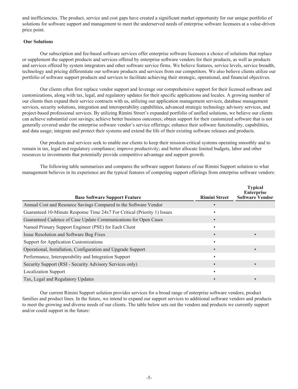 and inefficiencies. The product, service and cost gaps have created a significant market opportunity for our unique portfolio of solutions for software support and management to meet the underserved needs of enterprise software licensees at a value-driven price point. Our Solutions Our subscription and fee-based software services offer enterprise software licensees a choice of solutions that replace or supplement the support products and services offered by enterprise software vendors for their products, as well as products and services offered by system integrators and other software service firms. We believe features, service levels, service breadth, technology and pricing differentiate our software products and services from our competitors. We also believe clients utilize our portfolio of software support products and services to facilitate achieving their strategic, operational, and financial objectives. Our clients often first replace vendor support and leverage our comprehensive support for their licensed software and customizations, along with tax, legal, and regulatory updates for their specific applications and locales. A growing number of our clients then expand their service contracts with us, utilizing our application management services, database management services, security solutions, integration and interoperability capabilities, advanced strategic technology advisory services, and project-based professional services. By utilizing Rimini Street’s expanded portfolio of unified solutions, we believe our clients can achieve substantial cost savings; achieve better business outcomes; obtain support for their customized software that is not generally covered under the enterprise software vendor’s service offerings; enhance their software functionality, capabilities, and data usage; integrate and protect their systems and extend the life of their existing software releases and products. Our products and services seek to enable our clients to keep their mission-critical systems operating smoothly and to remain in tax, legal and regulatory compliance; improve productivity; and better allocate limited budgets, labor and other resources to investments that potentially provide competitive advantage and support growth. The following table summarizes and compares the software support features of our Rimini Support solution to what management believes in its experience are the typical features of competing support offerings from enterprise software vendors: Base Software Support Feature Rimini Street Typical Enterprise Software Vendor Annual Cost and Resource Savings Compared to the Software Vendor • Guaranteed 10-Minute Response Time 24x7 For Critical (Priority 1) Issues • Guaranteed Cadence of Case Update Communications for Open Cases • Named Primary Support Engineer (PSE) for Each Client • Issue Resolution and Software Bug Fixes • • Support for Application Customizations • Operational, Installation, Configuration and Upgrade Support • • Performance, Interoperability and Integration Support • Security Support (RSI - Security Advisory Services only) • • Localization Support • Tax, Legal and Regulatory Updates • • Our current Rimini Support solution provides services for a broad range of enterprise software vendors, product families and product lines. In the future, we intend to expand our support services to additional software vendors and products to meet the growing and diverse needs of our clients. The table below sets out the vendors and products we currently support and/or could support in the future: -5-