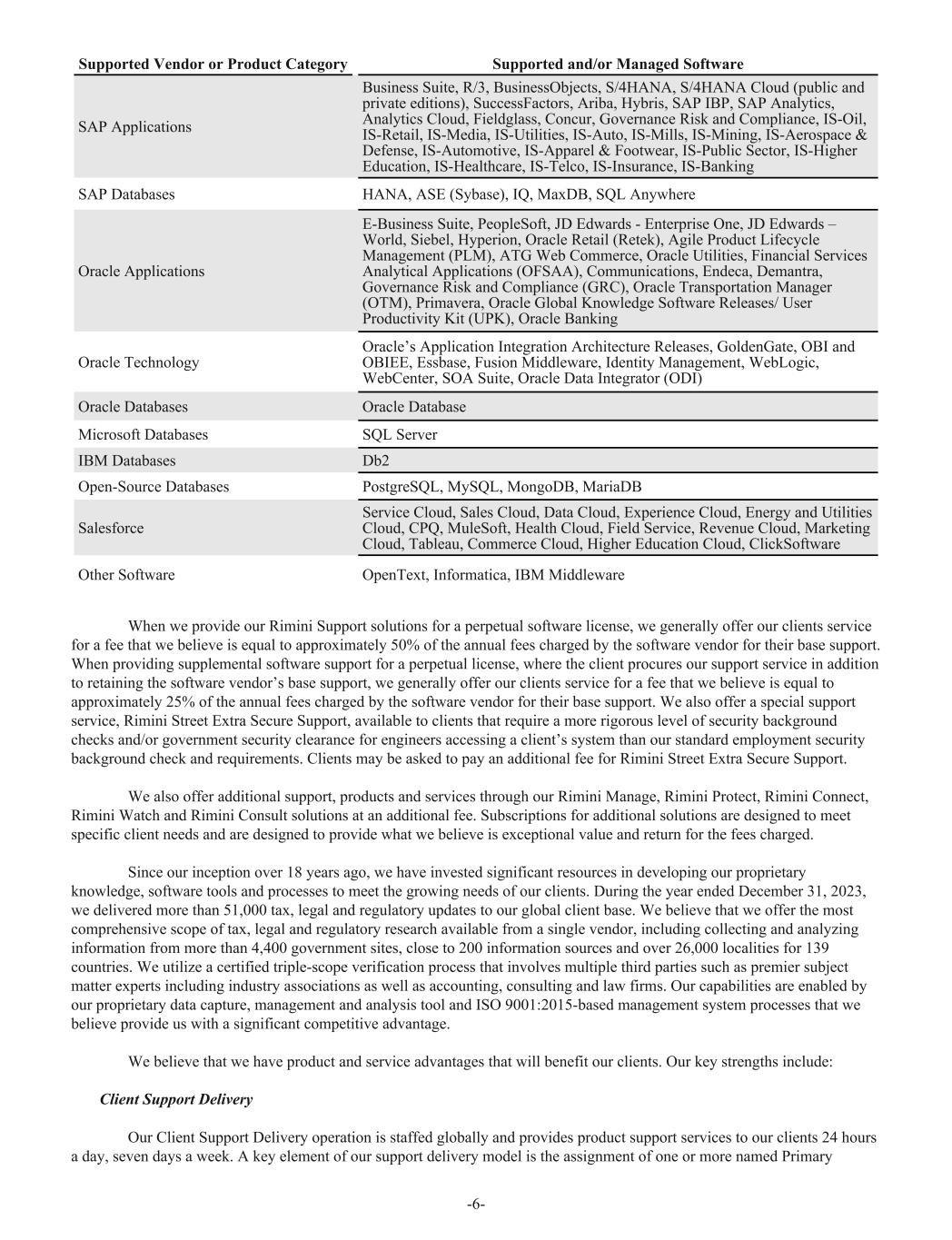 Supported Vendor or Product Category Supported and/or Managed Software SAP Applications Business Suite, R/3, BusinessObjects, S/4HANA, S/4HANA Cloud (public and private editions), SuccessFactors, Ariba, Hybris, SAP IBP, SAP Analytics, Analytics Cloud, Fieldglass, Concur, Governance Risk and Compliance, IS-Oil, IS-Retail, IS-Media, IS-Utilities, IS-Auto, IS-Mills, IS-Mining, IS-Aerospace & Defense, IS-Automotive, IS-Apparel & Footwear, IS-Public Sector, IS-Higher Education, IS-Healthcare, IS-Telco, IS-Insurance, IS-Banking SAP Databases HANA, ASE (Sybase), IQ, MaxDB, SQL Anywhere Oracle Applications E-Business Suite, PeopleSoft, JD Edwards - Enterprise One, JD Edwards – World, Siebel, Hyperion, Oracle Retail (Retek), Agile Product Lifecycle Management (PLM), ATG Web Commerce, Oracle Utilities, Financial Services Analytical Applications (OFSAA), Communications, Endeca, Demantra, Governance Risk and Compliance (GRC), Oracle Transportation Manager (OTM), Primavera, Oracle Global Knowledge Software Releases/ User Productivity Kit (UPK), Oracle Banking Oracle Technology Oracle’s Application Integration Architecture Releases, GoldenGate, OBI and OBIEE, Essbase, Fusion Middleware, Identity Management, WebLogic, WebCenter, SOA Suite, Oracle Data Integrator (ODI) Oracle Databases Oracle Database Microsoft Databases SQL Server IBM Databases Db2 Open-Source Databases PostgreSQL, MySQL, MongoDB, MariaDB Salesforce Service Cloud, Sales Cloud, Data Cloud, Experience Cloud, Energy and Utilities Cloud, CPQ, MuleSoft, Health Cloud, Field Service, Revenue Cloud, Marketing Cloud, Tableau, Commerce Cloud, Higher Education Cloud, ClickSoftware Other Software OpenText, Informatica, IBM Middleware When we provide our Rimini Support solutions for a perpetual software license, we generally offer our clients service for a fee that we believe is equal to approximately 50% of the annual fees charged by the software vendor for their base support. When providing supplemental software support for a perpetual license, where the client procures our support service in addition to retaining the software vendor’s base support, we generally offer our clients service for a fee that we believe is equal to approximately 25% of the annual fees charged by the software vendor for their base support. We also offer a special support service, Rimini Street Extra Secure Support, available to clients that require a more rigorous level of security background checks and/or government security clearance for engineers accessing a client’s system than our standard employment security background check and requirements. Clients may be asked to pay an additional fee for Rimini Street Extra Secure Support. We also offer additional support, products and services through our Rimini Manage, Rimini Protect, Rimini Connect, Rimini Watch and Rimini Consult solutions at an additional fee. Subscriptions for additional solutions are designed to meet specific client needs and are designed to provide what we believe is exceptional value and return for the fees charged. Since our inception over 18 years ago, we have invested significant resources in developing our proprietary knowledge, software tools and processes to meet the growing needs of our clients. During the year ended December 31, 2023, we delivered more than 51,000 tax, legal and regulatory updates to our global client base. We believe that we offer the most comprehensive scope of tax, legal and regulatory research available from a single vendor, including collecting and analyzing information from more than 4,400 government sites, close to 200 information sources and over 26,000 localities for 139 countries. We utilize a certified triple-scope verification process that involves multiple third parties such as premier subject matter experts including industry associations as well as accounting, consulting and law firms. Our capabilities are enabled by our proprietary data capture, management and analysis tool and ISO 9001:2015-based management system processes that we believe provide us with a significant competitive advantage. We believe that we have product and service advantages that will benefit our clients. Our key strengths include: Client Support Delivery Our Client Support Delivery operation is staffed globally and provides product support services to our clients 24 hours a day, seven days a week. A key element of our support delivery model is the assignment of one or more named Primary -6-
