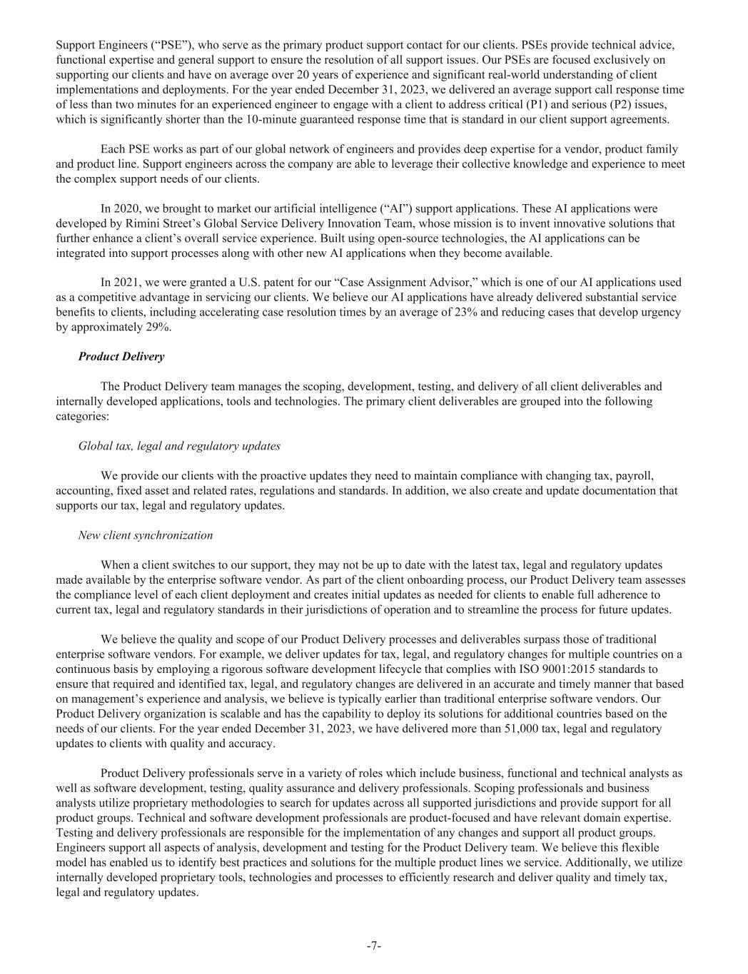 Support Engineers (“PSE”), who serve as the primary product support contact for our clients. PSEs provide technical advice, functional expertise and general support to ensure the resolution of all support issues. Our PSEs are focused exclusively on supporting our clients and have on average over 20 years of experience and significant real-world understanding of client implementations and deployments. For the year ended December 31, 2023, we delivered an average support call response time of less than two minutes for an experienced engineer to engage with a client to address critical (P1) and serious (P2) issues, which is significantly shorter than the 10-minute guaranteed response time that is standard in our client support agreements. Each PSE works as part of our global network of engineers and provides deep expertise for a vendor, product family and product line. Support engineers across the company are able to leverage their collective knowledge and experience to meet the complex support needs of our clients. In 2020, we brought to market our artificial intelligence (“AI”) support applications. These AI applications were developed by Rimini Street’s Global Service Delivery Innovation Team, whose mission is to invent innovative solutions that further enhance a client’s overall service experience. Built using open-source technologies, the AI applications can be integrated into support processes along with other new AI applications when they become available. In 2021, we were granted a U.S. patent for our “Case Assignment Advisor,” which is one of our AI applications used as a competitive advantage in servicing our clients. We believe our AI applications have already delivered substantial service benefits to clients, including accelerating case resolution times by an average of 23% and reducing cases that develop urgency by approximately 29%. Product Delivery The Product Delivery team manages the scoping, development, testing, and delivery of all client deliverables and internally developed applications, tools and technologies. The primary client deliverables are grouped into the following categories: Global tax, legal and regulatory updates We provide our clients with the proactive updates they need to maintain compliance with changing tax, payroll, accounting, fixed asset and related rates, regulations and standards. In addition, we also create and update documentation that supports our tax, legal and regulatory updates. New client synchronization When a client switches to our support, they may not be up to date with the latest tax, legal and regulatory updates made available by the enterprise software vendor. As part of the client onboarding process, our Product Delivery team assesses the compliance level of each client deployment and creates initial updates as needed for clients to enable full adherence to current tax, legal and regulatory standards in their jurisdictions of operation and to streamline the process for future updates. We believe the quality and scope of our Product Delivery processes and deliverables surpass those of traditional enterprise software vendors. For example, we deliver updates for tax, legal, and regulatory changes for multiple countries on a continuous basis by employing a rigorous software development lifecycle that complies with ISO 9001:2015 standards to ensure that required and identified tax, legal, and regulatory changes are delivered in an accurate and timely manner that based on management’s experience and analysis, we believe is typically earlier than traditional enterprise software vendors. Our Product Delivery organization is scalable and has the capability to deploy its solutions for additional countries based on the needs of our clients. For the year ended December 31, 2023, we have delivered more than 51,000 tax, legal and regulatory updates to clients with quality and accuracy. Product Delivery professionals serve in a variety of roles which include business, functional and technical analysts as well as software development, testing, quality assurance and delivery professionals. Scoping professionals and business analysts utilize proprietary methodologies to search for updates across all supported jurisdictions and provide support for all product groups. Technical and software development professionals are product-focused and have relevant domain expertise. Testing and delivery professionals are responsible for the implementation of any changes and support all product groups. Engineers support all aspects of analysis, development and testing for the Product Delivery team. We believe this flexible model has enabled us to identify best practices and solutions for the multiple product lines we service. Additionally, we utilize internally developed proprietary tools, technologies and processes to efficiently research and deliver quality and timely tax, legal and regulatory updates. -7-