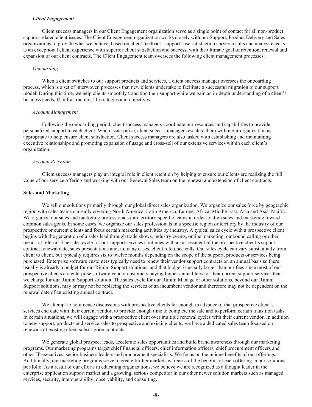 Client Engagement Client success managers in our Client Engagement organization serve as a single point of contact for all non-product support-related client issues. The Client Engagement organization works closely with our Support, Product Delivery and Sales organizations to provide what we believe, based on client feedback, support case satisfaction survey results and analyst checks, is an exceptional client experience with superior client satisfaction and success, with the ultimate goal of retention, renewal and expansion of our client contracts. The Client Engagement team oversees the following client management processes: Onboarding When a client switches to our support products and services, a client success manager oversees the onboarding process, which is a set of interwoven processes that new clients undertake to facilitate a successful migration to our support model. During this time, we help clients smoothly transition their support while we gain an in-depth understanding of a client’s business needs, IT infrastructure, IT strategies and objectives. Account Management Following the onboarding period, client success managers coordinate our resources and capabilities to provide personalized support to each client. When issues arise, client success managers escalate them within our organization as appropriate to help ensure client satisfaction. Client success managers are also tasked with establishing and maintaining executive relationships and promoting expansion of usage and cross-sell of our extensive services within each client’s organization. Account Retention Client success managers play an integral role in client retention by helping to ensure our clients are realizing the full value of our service offering and working with our Renewal Sales team on the renewal and extension of client contracts. Sales and Marketing We sell our solutions primarily through our global direct sales organization. We organize our sales force by geographic region with sales teams currently covering North America, Latin America, Europe, Africa, Middle East, Asia and Asia-Pacific. We organize our sales and marketing professionals into territory-specific teams in order to align sales and marketing toward common sales goals. In some cases, we organize our sales professionals in a specific region or territory by the industry of our prospective or current clients and focus certain marketing activities by industry. A typical sales cycle with a prospective client begins with the generation of a sales lead through trade shows, industry events, online marketing, outbound calling or other means of referral. The sales cycle for our support services continues with an assessment of the prospective client’s support contract renewal date, sales presentations and, in many cases, client reference calls. Our sales cycle can vary substantially from client to client, but typically requires six to twelve months depending on the scope of the support, products or services being purchased. Enterprise software customers typically need to renew their vendor support contracts on an annual basis so there usually is already a budget for our Rimini Support solutions, and that budget is usually larger than our fees since most of our prospective clients are enterprise software vendor customers paying higher annual fees for their current support services than we charge for our Rimini Support solution. The sales cycle for our Rimini Manage or other solutions, beyond our Rimini Support solutions, may or may not be replacing the services of an incumbent vendor and therefore may not be dependent on the renewal date of an existing annual contract. We attempt to commence discussions with prospective clients far enough in advance of that prospective client’s services end date with their current vendor, to provide enough time to complete the sale and to perform certain transition tasks. In certain situations, we will engage with a prospective client over multiple renewal cycles with their current vendor. In addition to new support, products and service sales to prospective and existing clients, we have a dedicated sales team focused on renewals of existing client subscription contracts. We generate global prospect leads, accelerate sales opportunities and build brand awareness through our marketing programs. Our marketing programs target chief financial officers, chief information officers, chief procurement officers and other IT executives, senior business leaders and procurement specialists. We focus on the unique benefits of our offerings. Additionally, our marketing programs serve to create further market awareness of the benefits of each offering in our solutions portfolio. As a result of our efforts in educating organizations, we believe we are recognized as a thought leader in the enterprise application support market and a growing, serious competitor in our other newer solution markets such as managed services, security, interoperability, observability, and consulting. -8-