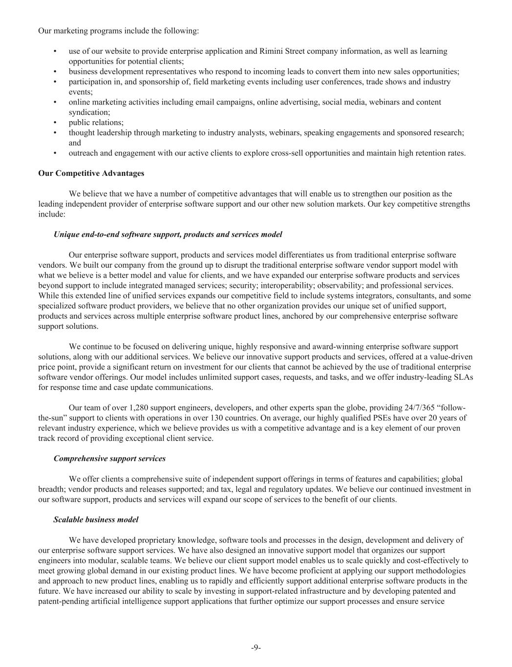 Our marketing programs include the following: • use of our website to provide enterprise application and Rimini Street company information, as well as learning opportunities for potential clients; • business development representatives who respond to incoming leads to convert them into new sales opportunities; • participation in, and sponsorship of, field marketing events including user conferences, trade shows and industry events; • online marketing activities including email campaigns, online advertising, social media, webinars and content syndication; • public relations; • thought leadership through marketing to industry analysts, webinars, speaking engagements and sponsored research; and • outreach and engagement with our active clients to explore cross-sell opportunities and maintain high retention rates. Our Competitive Advantages We believe that we have a number of competitive advantages that will enable us to strengthen our position as the leading independent provider of enterprise software support and our other new solution markets. Our key competitive strengths include: Unique end-to-end software support, products and services model Our enterprise software support, products and services model differentiates us from traditional enterprise software vendors. We built our company from the ground up to disrupt the traditional enterprise software vendor support model with what we believe is a better model and value for clients, and we have expanded our enterprise software products and services beyond support to include integrated managed services; security; interoperability; observability; and professional services. While this extended line of unified services expands our competitive field to include systems integrators, consultants, and some specialized software product providers, we believe that no other organization provides our unique set of unified support, products and services across multiple enterprise software product lines, anchored by our comprehensive enterprise software support solutions. We continue to be focused on delivering unique, highly responsive and award-winning enterprise software support solutions, along with our additional services. We believe our innovative support products and services, offered at a value-driven price point, provide a significant return on investment for our clients that cannot be achieved by the use of traditional enterprise software vendor offerings. Our model includes unlimited support cases, requests, and tasks, and we offer industry-leading SLAs for response time and case update communications. Our team of over 1,280 support engineers, developers, and other experts span the globe, providing 24/7/365 “follow- the-sun” support to clients with operations in over 130 countries. On average, our highly qualified PSEs have over 20 years of relevant industry experience, which we believe provides us with a competitive advantage and is a key element of our proven track record of providing exceptional client service. Comprehensive support services We offer clients a comprehensive suite of independent support offerings in terms of features and capabilities; global breadth; vendor products and releases supported; and tax, legal and regulatory updates. We believe our continued investment in our software support, products and services will expand our scope of services to the benefit of our clients. Scalable business model We have developed proprietary knowledge, software tools and processes in the design, development and delivery of our enterprise software support services. We have also designed an innovative support model that organizes our support engineers into modular, scalable teams. We believe our client support model enables us to scale quickly and cost-effectively to meet growing global demand in our existing product lines. We have become proficient at applying our support methodologies and approach to new product lines, enabling us to rapidly and efficiently support additional enterprise software products in the future. We have increased our ability to scale by investing in support-related infrastructure and by developing patented and patent-pending artificial intelligence support applications that further optimize our support processes and ensure service -9-