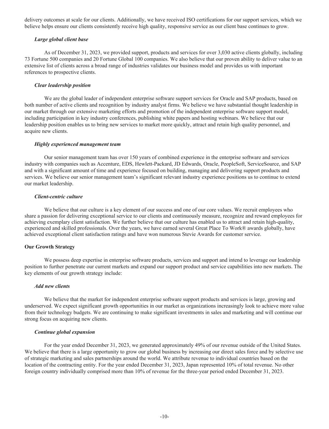 delivery outcomes at scale for our clients. Additionally, we have received ISO certifications for our support services, which we believe helps ensure our clients consistently receive high quality, responsive service as our client base continues to grow. Large global client base As of December 31, 2023, we provided support, products and services for over 3,030 active clients globally, including 73 Fortune 500 companies and 20 Fortune Global 100 companies. We also believe that our proven ability to deliver value to an extensive list of clients across a broad range of industries validates our business model and provides us with important references to prospective clients. Clear leadership position We are the global leader of independent enterprise software support services for Oracle and SAP products, based on both number of active clients and recognition by industry analyst firms. We believe we have substantial thought leadership in our market through our extensive marketing efforts and promotion of the independent enterprise software support model, including participation in key industry conferences, publishing white papers and hosting webinars. We believe that our leadership position enables us to bring new services to market more quickly, attract and retain high quality personnel, and acquire new clients. Highly experienced management team Our senior management team has over 150 years of combined experience in the enterprise software and services industry with companies such as Accenture, EDS, Hewlett-Packard, JD Edwards, Oracle, PeopleSoft, ServiceSource, and SAP and with a significant amount of time and experience focused on building, managing and delivering support products and services. We believe our senior management team’s significant relevant industry experience positions us to continue to extend our market leadership. Client-centric culture We believe that our culture is a key element of our success and one of our core values. We recruit employees who share a passion for delivering exceptional service to our clients and continuously measure, recognize and reward employees for achieving exemplary client satisfaction. We further believe that our culture has enabled us to attract and retain high-quality, experienced and skilled professionals. Over the years, we have earned several Great Place To Work® awards globally, have achieved exceptional client satisfaction ratings and have won numerous Stevie Awards for customer service. Our Growth Strategy We possess deep expertise in enterprise software products, services and support and intend to leverage our leadership position to further penetrate our current markets and expand our support product and service capabilities into new markets. The key elements of our growth strategy include: Add new clients We believe that the market for independent enterprise software support products and services is large, growing and underserved. We expect significant growth opportunities in our market as organizations increasingly look to achieve more value from their technology budgets. We are continuing to make significant investments in sales and marketing and will continue our strong focus on acquiring new clients. Continue global expansion For the year ended December 31, 2023, we generated approximately 49% of our revenue outside of the United States. We believe that there is a large opportunity to grow our global business by increasing our direct sales force and by selective use of strategic marketing and sales partnerships around the world. We attribute revenue to individual countries based on the location of the contracting entity. For the year ended December 31, 2023, Japan represented 10% of total revenue. No other foreign country individually comprised more than 10% of revenue for the three-year period ended December 31, 2023. -10-