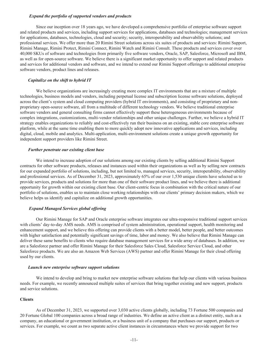 Expand the portfolio of supported vendors and products Since our inception over 18 years ago, we have developed a comprehensive portfolio of enterprise software support and related products and services, including support services for applications, databases and technologies; management services for applications, databases, technologies, cloud and security; security, interoperability and observability solutions; and professional services. We offer more than 20 Rimini Street solutions across six suites of products and services: Rimini Support, Rimini Manage, Rimini Protect, Rimini Connect, Rimini Watch and Rimini Consult. These products and services cover over 40,000 SKUs of software and technologies from primarily five software vendors, Oracle, SAP, Salesforce, Microsoft and IBM, as well as for open-source software. We believe there is a significant market opportunity to offer support and related products and services for additional vendors and software, and we intend to extend our Rimini Support offerings to additional enterprise software vendors, product lines and releases. Capitalize on the shift to hybrid IT We believe organizations are increasingly creating more complex IT environments that are a mixture of multiple technologies, business models and vendors, including perpetual license and subscription license software solutions, deployed across the client’s system and cloud computing providers (hybrid IT environments), and consisting of proprietary and non- proprietary open-source software, all from a multitude of different technology vendors. We believe traditional enterprise software vendors and general consulting firms cannot effectively support these heterogeneous environments because of complex integrations, customizations, multi-vendor relationships and other unique challenges. Further, we believe a hybrid IT strategy enables organizations to reliably and cost-effectively run their business on an existing, stable core enterprise software platform, while at the same time enabling them to more quickly adopt new innovative applications and services, including digital, cloud, mobile and analytics. Multi-application, multi-environment solutions create a unique growth opportunity for independent support providers like Rimini Street. Further penetrate our existing client base We intend to increase adoption of our solutions among our existing clients by selling additional Rimini Support contracts for other software products, releases and instances used within their organizations as well as by selling new contracts for our expanded portfolio of solutions, including, but not limited to, managed services, security, interoperability, observability and professional services. As of December 31, 2023, approximately 65% of our over 1,530 unique clients have selected us to provide services, products and solutions for more than one of their software product lines, and we believe there is additional opportunity for growth within our existing client base. Our client-centric focus in combination with the critical nature of our portfolio of solutions, enables us to maintain close working relationships with our clients’ primary decision makers, which we believe helps us identify and capitalize on additional growth opportunities. Expand Managed Services global offering Our Rimini Manage for SAP and Oracle enterprise software integrates our ultra-responsive traditional support services with clients’ day-to-day AMS needs. AMS is comprised of system administration, operational support, health monitoring and enhancement support, and we believe this offering can provide clients with a better model, better people, and better outcomes with higher satisfaction and potentially significant savings of time, labor and money. We also believe that Rimini Manage can deliver these same benefits to clients who require database management services for a wide array of databases. In addition, we are a Salesforce partner and offer Rimini Manage for their Salesforce Sales Cloud, Salesforce Service Cloud, and other Salesforce products. We are also an Amazon Web Services (AWS) partner and offer Rimini Manage for their cloud offering used by our clients. Launch new enterprise software support solutions We intend to develop and bring to market new enterprise software solutions that help our clients with various business needs. For example, we recently announced multiple suites of services that bring together existing and new support, products and service solutions. Clients As of December 31, 2023, we supported over 3,030 active clients globally, including 73 Fortune 500 companies and 20 Fortune Global 100 companies across a broad range of industries. We define an active client as a distinct entity, such as a company, an educational or government institution, or a business unit of a company that purchases our support, products or services. For example, we count as two separate active client instances in circumstances where we provide support for two -11-