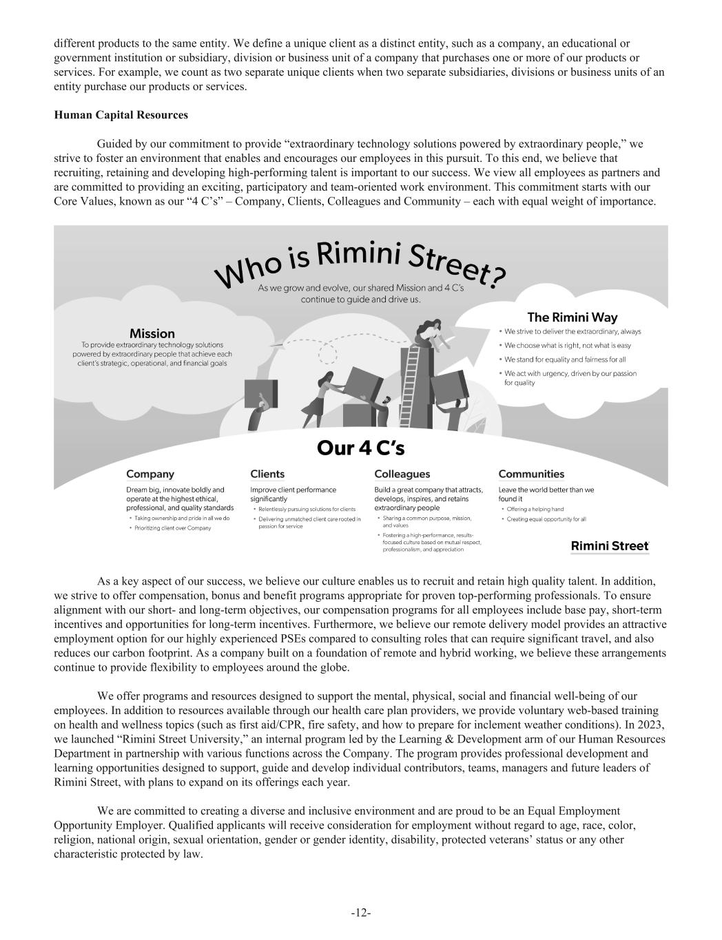 different products to the same entity. We define a unique client as a distinct entity, such as a company, an educational or government institution or subsidiary, division or business unit of a company that purchases one or more of our products or services. For example, we count as two separate unique clients when two separate subsidiaries, divisions or business units of an entity purchase our products or services. Human Capital Resources Guided by our commitment to provide “extraordinary technology solutions powered by extraordinary people,” we strive to foster an environment that enables and encourages our employees in this pursuit. To this end, we believe that recruiting, retaining and developing high-performing talent is important to our success. We view all employees as partners and are committed to providing an exciting, participatory and team-oriented work environment. This commitment starts with our Core Values, known as our “4 C’s” – Company, Clients, Colleagues and Community – each with equal weight of importance. As a key aspect of our success, we believe our culture enables us to recruit and retain high quality talent. In addition, we strive to offer compensation, bonus and benefit programs appropriate for proven top-performing professionals. To ensure alignment with our short- and long-term objectives, our compensation programs for all employees include base pay, short-term incentives and opportunities for long-term incentives. Furthermore, we believe our remote delivery model provides an attractive employment option for our highly experienced PSEs compared to consulting roles that can require significant travel, and also reduces our carbon footprint. As a company built on a foundation of remote and hybrid working, we believe these arrangements continue to provide flexibility to employees around the globe. We offer programs and resources designed to support the mental, physical, social and financial well-being of our employees. In addition to resources available through our health care plan providers, we provide voluntary web-based training on health and wellness topics (such as first aid/CPR, fire safety, and how to prepare for inclement weather conditions). In 2023, we launched “Rimini Street University,” an internal program led by the Learning & Development arm of our Human Resources Department in partnership with various functions across the Company. The program provides professional development and learning opportunities designed to support, guide and develop individual contributors, teams, managers and future leaders of Rimini Street, with plans to expand on its offerings each year. We are committed to creating a diverse and inclusive environment and are proud to be an Equal Employment Opportunity Employer. Qualified applicants will receive consideration for employment without regard to age, race, color, religion, national origin, sexual orientation, gender or gender identity, disability, protected veterans’ status or any other characteristic protected by law. -12-