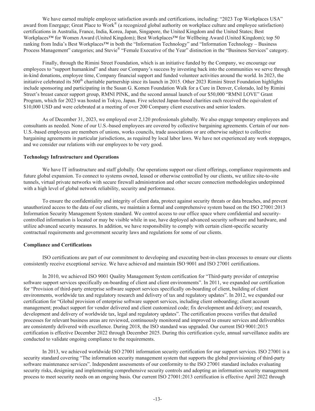 We have earned multiple employee satisfaction awards and certifications, including: “2023 Top Workplaces USA” award from Energage; Great Place to Work® (a recognized global authority on workplace culture and employee satisfaction) certifications in Australia, France, India, Korea, Japan, Singapore, the United Kingdom and the United States; Best Workplaces™ for Women Award (United Kingdom); Best Workplaces™ for Wellbeing Award (United Kingdom); top 50 ranking from India’s Best Workplaces™ in both the “Information Technology” and “Information Technology – Business Process Management” categories; and Stevie® “Female Executive of the Year” distinction in the “Business Services” category. Finally, through the Rimini Street Foundation, which is an initiative funded by the Company, we encourage our employees to “support humankind” and share our Company’s success by investing back into the communities we serve through in-kind donations, employee time, Company financial support and funded volunteer activities around the world. In 2023, the initiative celebrated its 500th charitable partnership since its launch in 2015. Other 2023 Rimini Street Foundation highlights include sponsoring and participating in the Susan G. Komen Foundation Walk for a Cure in Denver, Colorado, led by Rimini Street’s breast cancer support group, RMNI PINK, and the second annual launch of our $50,000 “RMNI LOVE” Grant Program, which for 2023 was hosted in Tokyo, Japan. Five selected Japan-based charities each received the equivalent of $10,000 USD and were celebrated at a meeting of over 200 Company client executives and senior leaders. As of December 31, 2023, we employed over 2,120 professionals globally. We also engage temporary employees and consultants as needed. None of our U.S.-based employees are covered by collective bargaining agreements. Certain of our non- U.S.-based employees are members of unions, works councils, trade associations or are otherwise subject to collective bargaining agreements in particular jurisdictions, as required by local labor laws. We have not experienced any work stoppages, and we consider our relations with our employees to be very good. Technology Infrastructure and Operations We have IT infrastructure and staff globally. Our operations support our client offerings, compliance requirements and future global expansion. To connect to systems owned, leased or otherwise controlled by our clients, we utilize site-to-site tunnels, virtual private networks with secure firewall administration and other secure connection methodologies underpinned with a high level of global network reliability, security and performance. To ensure the confidentiality and integrity of client data, protect against security threats or data breaches, and prevent unauthorized access to the data of our clients, we maintain a formal and comprehensive system based on the ISO 27001:2013 Information Security Management System standard. We control access to our office space where confidential and security- controlled information is located or may be visible while in use, have deployed advanced security software and hardware, and utilize advanced security measures. In addition, we have responsibility to comply with certain client-specific security contractual requirements and government security laws and regulations for some of our clients. Compliance and Certifications ISO certifications are part of our commitment to developing and executing best-in-class processes to ensure our clients consistently receive exceptional service. We have achieved and maintain ISO 9001 and ISO 27001 certifications. In 2010, we achieved ISO 9001 Quality Management System certification for “Third-party provider of enterprise software support services specifically on-boarding of client and client environments”. In 2011, we expanded our certification for “Provision of third-party enterprise software support services specifically on-boarding of client, building of client environments, worldwide tax and regulatory research and delivery of tax and regulatory updates”. In 2012, we expanded our certification for “Global provision of enterprise software support services, including client onboarding; client account management; product support for vendor delivered and client customized code; fix development and delivery; and research, development and delivery of worldwide tax, legal and regulatory updates”. The certification process verifies that detailed processes for relevant business areas are reviewed, continuously monitored and improved to ensure services and deliverables are consistently delivered with excellence. During 2018, the ISO standard was upgraded. Our current ISO 9001:2015 certification is effective December 2022 through December 2025. During this certification cycle, annual surveillance audits are conducted to validate ongoing compliance to the requirements. In 2013, we achieved worldwide ISO 27001 information security certification for our support services. ISO 27001 is a security standard covering “The information security management system that supports the global provisioning of third-party software maintenance services”. Independent assessments of our conformity to the ISO 27001 standard includes evaluating security risks, designing and implementing comprehensive security controls and adopting an information security management process to meet security needs on an ongoing basis. Our current ISO 27001:2013 certification is effective April 2022 through -13-