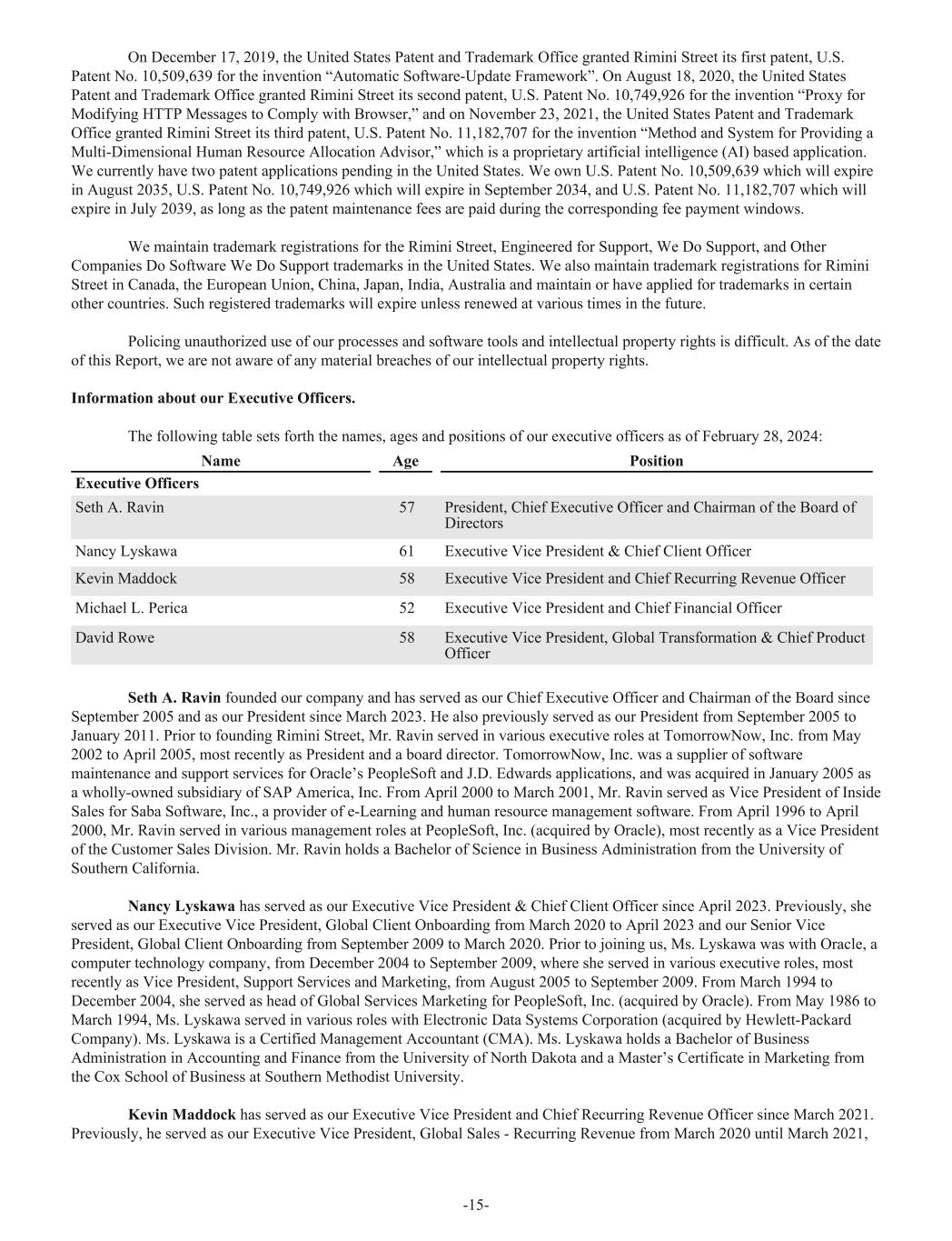 On December 17, 2019, the United States Patent and Trademark Office granted Rimini Street its first patent, U.S. Patent No. 10,509,639 for the invention “Automatic Software-Update Framework”. On August 18, 2020, the United States Patent and Trademark Office granted Rimini Street its second patent, U.S. Patent No. 10,749,926 for the invention “Proxy for Modifying HTTP Messages to Comply with Browser,” and on November 23, 2021, the United States Patent and Trademark Office granted Rimini Street its third patent, U.S. Patent No. 11,182,707 for the invention “Method and System for Providing a Multi-Dimensional Human Resource Allocation Advisor,” which is a proprietary artificial intelligence (AI) based application. We currently have two patent applications pending in the United States. We own U.S. Patent No. 10,509,639 which will expire in August 2035, U.S. Patent No. 10,749,926 which will expire in September 2034, and U.S. Patent No. 11,182,707 which will expire in July 2039, as long as the patent maintenance fees are paid during the corresponding fee payment windows. We maintain trademark registrations for the Rimini Street, Engineered for Support, We Do Support, and Other Companies Do Software We Do Support trademarks in the United States. We also maintain trademark registrations for Rimini Street in Canada, the European Union, China, Japan, India, Australia and maintain or have applied for trademarks in certain other countries. Such registered trademarks will expire unless renewed at various times in the future. Policing unauthorized use of our processes and software tools and intellectual property rights is difficult. As of the date of this Report, we are not aware of any material breaches of our intellectual property rights. Information about our Executive Officers. The following table sets forth the names, ages and positions of our executive officers as of February 28, 2024: Name Age Position Executive Officers Seth A. Ravin 57 President, Chief Executive Officer and Chairman of the Board of Directors Nancy Lyskawa 61 Executive Vice President & Chief Client Officer Kevin Maddock 58 Executive Vice President and Chief Recurring Revenue Officer Michael L. Perica 52 Executive Vice President and Chief Financial Officer David Rowe 58 Executive Vice President, Global Transformation & Chief Product Officer Seth A. Ravin founded our company and has served as our Chief Executive Officer and Chairman of the Board since September 2005 and as our President since March 2023. He also previously served as our President from September 2005 to January 2011. Prior to founding Rimini Street, Mr. Ravin served in various executive roles at TomorrowNow, Inc. from May 2002 to April 2005, most recently as President and a board director. TomorrowNow, Inc. was a supplier of software maintenance and support services for Oracle’s PeopleSoft and J.D. Edwards applications, and was acquired in January 2005 as a wholly-owned subsidiary of SAP America, Inc. From April 2000 to March 2001, Mr. Ravin served as Vice President of Inside Sales for Saba Software, Inc., a provider of e-Learning and human resource management software. From April 1996 to April 2000, Mr. Ravin served in various management roles at PeopleSoft, Inc. (acquired by Oracle), most recently as a Vice President of the Customer Sales Division. Mr. Ravin holds a Bachelor of Science in Business Administration from the University of Southern California. Nancy Lyskawa has served as our Executive Vice President & Chief Client Officer since April 2023. Previously, she served as our Executive Vice President, Global Client Onboarding from March 2020 to April 2023 and our Senior Vice President, Global Client Onboarding from September 2009 to March 2020. Prior to joining us, Ms. Lyskawa was with Oracle, a computer technology company, from December 2004 to September 2009, where she served in various executive roles, most recently as Vice President, Support Services and Marketing, from August 2005 to September 2009. From March 1994 to December 2004, she served as head of Global Services Marketing for PeopleSoft, Inc. (acquired by Oracle). From May 1986 to March 1994, Ms. Lyskawa served in various roles with Electronic Data Systems Corporation (acquired by Hewlett-Packard Company). Ms. Lyskawa is a Certified Management Accountant (CMA). Ms. Lyskawa holds a Bachelor of Business Administration in Accounting and Finance from the University of North Dakota and a Master’s Certificate in Marketing from the Cox School of Business at Southern Methodist University. Kevin Maddock has served as our Executive Vice President and Chief Recurring Revenue Officer since March 2021. Previously, he served as our Executive Vice President, Global Sales - Recurring Revenue from March 2020 until March 2021, -15-