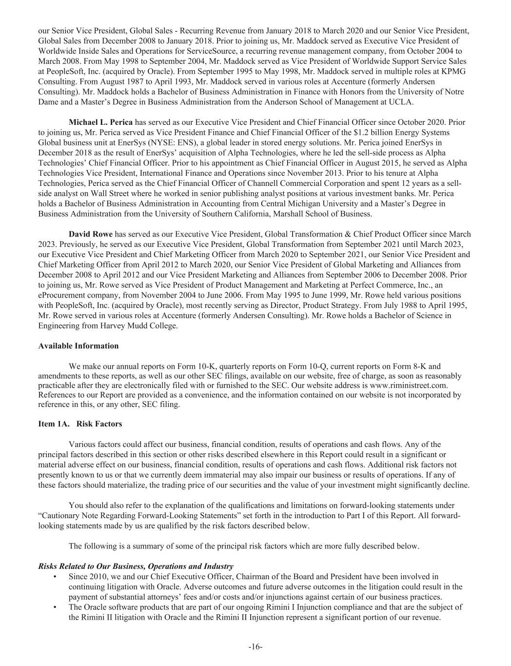 our Senior Vice President, Global Sales - Recurring Revenue from January 2018 to March 2020 and our Senior Vice President, Global Sales from December 2008 to January 2018. Prior to joining us, Mr. Maddock served as Executive Vice President of Worldwide Inside Sales and Operations for ServiceSource, a recurring revenue management company, from October 2004 to March 2008. From May 1998 to September 2004, Mr. Maddock served as Vice President of Worldwide Support Service Sales at PeopleSoft, Inc. (acquired by Oracle). From September 1995 to May 1998, Mr. Maddock served in multiple roles at KPMG Consulting. From August 1987 to April 1993, Mr. Maddock served in various roles at Accenture (formerly Andersen Consulting). Mr. Maddock holds a Bachelor of Business Administration in Finance with Honors from the University of Notre Dame and a Master’s Degree in Business Administration from the Anderson School of Management at UCLA. Michael L. Perica has served as our Executive Vice President and Chief Financial Officer since October 2020. Prior to joining us, Mr. Perica served as Vice President Finance and Chief Financial Officer of the $1.2 billion Energy Systems Global business unit at EnerSys (NYSE: ENS), a global leader in stored energy solutions. Mr. Perica joined EnerSys in December 2018 as the result of EnerSys’ acquisition of Alpha Technologies, where he led the sell-side process as Alpha Technologies’ Chief Financial Officer. Prior to his appointment as Chief Financial Officer in August 2015, he served as Alpha Technologies Vice President, International Finance and Operations since November 2013. Prior to his tenure at Alpha Technologies, Perica served as the Chief Financial Officer of Channell Commercial Corporation and spent 12 years as a sell- side analyst on Wall Street where he worked in senior publishing analyst positions at various investment banks. Mr. Perica holds a Bachelor of Business Administration in Accounting from Central Michigan University and a Master’s Degree in Business Administration from the University of Southern California, Marshall School of Business. David Rowe has served as our Executive Vice President, Global Transformation & Chief Product Officer since March 2023. Previously, he served as our Executive Vice President, Global Transformation from September 2021 until March 2023, our Executive Vice President and Chief Marketing Officer from March 2020 to September 2021, our Senior Vice President and Chief Marketing Officer from April 2012 to March 2020, our Senior Vice President of Global Marketing and Alliances from December 2008 to April 2012 and our Vice President Marketing and Alliances from September 2006 to December 2008. Prior to joining us, Mr. Rowe served as Vice President of Product Management and Marketing at Perfect Commerce, Inc., an eProcurement company, from November 2004 to June 2006. From May 1995 to June 1999, Mr. Rowe held various positions with PeopleSoft, Inc. (acquired by Oracle), most recently serving as Director, Product Strategy. From July 1988 to April 1995, Mr. Rowe served in various roles at Accenture (formerly Andersen Consulting). Mr. Rowe holds a Bachelor of Science in Engineering from Harvey Mudd College. Available Information We make our annual reports on Form 10-K, quarterly reports on Form 10-Q, current reports on Form 8-K and amendments to these reports, as well as our other SEC filings, available on our website, free of charge, as soon as reasonably practicable after they are electronically filed with or furnished to the SEC. Our website address is www.riministreet.com. References to our Report are provided as a convenience, and the information contained on our website is not incorporated by reference in this, or any other, SEC filing. Item 1A. Risk Factors Various factors could affect our business, financial condition, results of operations and cash flows. Any of the principal factors described in this section or other risks described elsewhere in this Report could result in a significant or material adverse effect on our business, financial condition, results of operations and cash flows. Additional risk factors not presently known to us or that we currently deem immaterial may also impair our business or results of operations. If any of these factors should materialize, the trading price of our securities and the value of your investment might significantly decline. You should also refer to the explanation of the qualifications and limitations on forward-looking statements under “Cautionary Note Regarding Forward-Looking Statements” set forth in the introduction to Part I of this Report. All forward- looking statements made by us are qualified by the risk factors described below. The following is a summary of some of the principal risk factors which are more fully described below. Risks Related to Our Business, Operations and Industry • Since 2010, we and our Chief Executive Officer, Chairman of the Board and President have been involved in continuing litigation with Oracle. Adverse outcomes and future adverse outcomes in the litigation could result in the payment of substantial attorneys’ fees and/or costs and/or injunctions against certain of our business practices. • The Oracle software products that are part of our ongoing Rimini I Injunction compliance and that are the subject of the Rimini II litigation with Oracle and the Rimini II Injunction represent a significant portion of our revenue. -16-