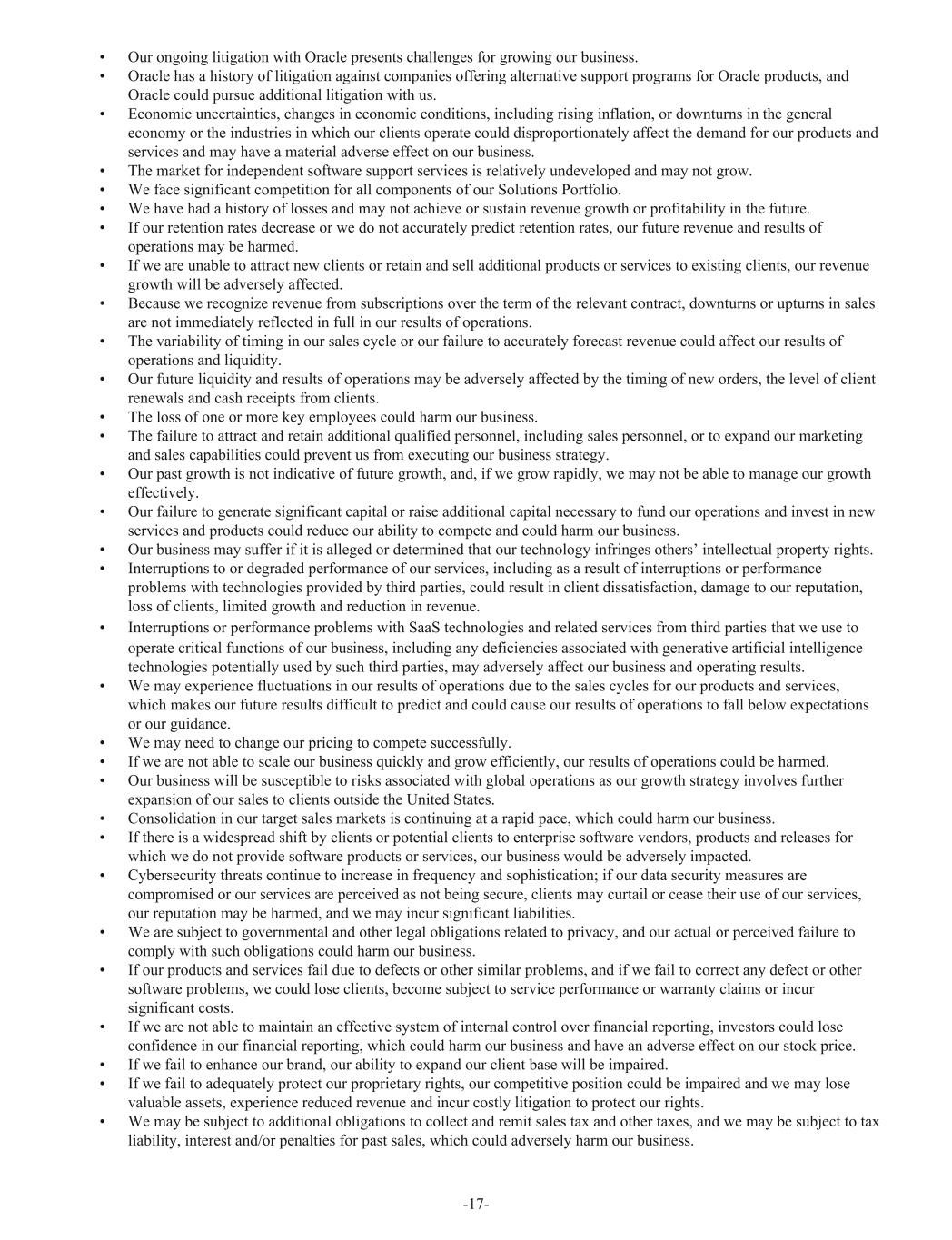 • Our ongoing litigation with Oracle presents challenges for growing our business. • Oracle has a history of litigation against companies offering alternative support programs for Oracle products, and Oracle could pursue additional litigation with us. • Economic uncertainties, changes in economic conditions, including rising inflation, or downturns in the general economy or the industries in which our clients operate could disproportionately affect the demand for our products and services and may have a material adverse effect on our business. • The market for independent software support services is relatively undeveloped and may not grow. • We face significant competition for all components of our Solutions Portfolio. • We have had a history of losses and may not achieve or sustain revenue growth or profitability in the future. • If our retention rates decrease or we do not accurately predict retention rates, our future revenue and results of operations may be harmed. • If we are unable to attract new clients or retain and sell additional products or services to existing clients, our revenue growth will be adversely affected. • Because we recognize revenue from subscriptions over the term of the relevant contract, downturns or upturns in sales are not immediately reflected in full in our results of operations. • The variability of timing in our sales cycle or our failure to accurately forecast revenue could affect our results of operations and liquidity. • Our future liquidity and results of operations may be adversely affected by the timing of new orders, the level of client renewals and cash receipts from clients. • The loss of one or more key employees could harm our business. • The failure to attract and retain additional qualified personnel, including sales personnel, or to expand our marketing and sales capabilities could prevent us from executing our business strategy. • Our past growth is not indicative of future growth, and, if we grow rapidly, we may not be able to manage our growth effectively. • Our failure to generate significant capital or raise additional capital necessary to fund our operations and invest in new services and products could reduce our ability to compete and could harm our business. • Our business may suffer if it is alleged or determined that our technology infringes others’ intellectual property rights. • Interruptions to or degraded performance of our services, including as a result of interruptions or performance problems with technologies provided by third parties, could result in client dissatisfaction, damage to our reputation, loss of clients, limited growth and reduction in revenue. • Interruptions or performance problems with SaaS technologies and related services from third parties that we use to operate critical functions of our business, including any deficiencies associated with generative artificial intelligence technologies potentially used by such third parties, may adversely affect our business and operating results. • We may experience fluctuations in our results of operations due to the sales cycles for our products and services, which makes our future results difficult to predict and could cause our results of operations to fall below expectations or our guidance. • We may need to change our pricing to compete successfully. • If we are not able to scale our business quickly and grow efficiently, our results of operations could be harmed. • Our business will be susceptible to risks associated with global operations as our growth strategy involves further expansion of our sales to clients outside the United States. • Consolidation in our target sales markets is continuing at a rapid pace, which could harm our business. • If there is a widespread shift by clients or potential clients to enterprise software vendors, products and releases for which we do not provide software products or services, our business would be adversely impacted. • Cybersecurity threats continue to increase in frequency and sophistication; if our data security measures are compromised or our services are perceived as not being secure, clients may curtail or cease their use of our services, our reputation may be harmed, and we may incur significant liabilities. • We are subject to governmental and other legal obligations related to privacy, and our actual or perceived failure to comply with such obligations could harm our business. • If our products and services fail due to defects or other similar problems, and if we fail to correct any defect or other software problems, we could lose clients, become subject to service performance or warranty claims or incur significant costs. • If we are not able to maintain an effective system of internal control over financial reporting, investors could lose confidence in our financial reporting, which could harm our business and have an adverse effect on our stock price. • If we fail to enhance our brand, our ability to expand our client base will be impaired. • If we fail to adequately protect our proprietary rights, our competitive position could be impaired and we may lose valuable assets, experience reduced revenue and incur costly litigation to protect our rights. • We may be subject to additional obligations to collect and remit sales tax and other taxes, and we may be subject to tax liability, interest and/or penalties for past sales, which could adversely harm our business. -17-