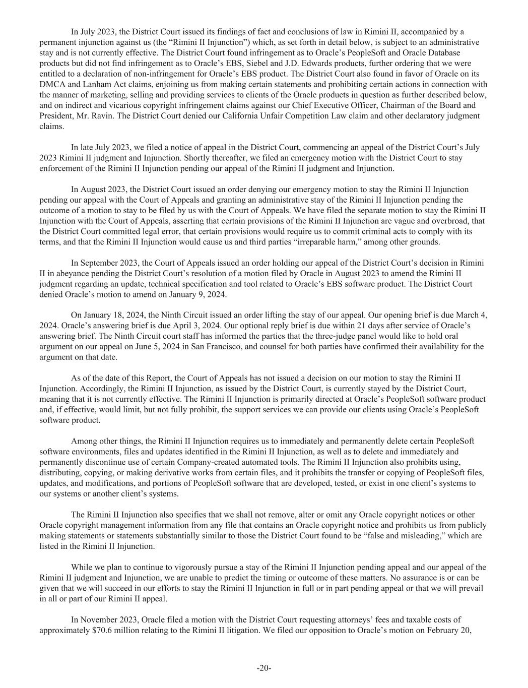 In July 2023, the District Court issued its findings of fact and conclusions of law in Rimini II, accompanied by a permanent injunction against us (the “Rimini II Injunction”) which, as set forth in detail below, is subject to an administrative stay and is not currently effective. The District Court found infringement as to Oracle’s PeopleSoft and Oracle Database products but did not find infringement as to Oracle’s EBS, Siebel and J.D. Edwards products, further ordering that we were entitled to a declaration of non-infringement for Oracle’s EBS product. The District Court also found in favor of Oracle on its DMCA and Lanham Act claims, enjoining us from making certain statements and prohibiting certain actions in connection with the manner of marketing, selling and providing services to clients of the Oracle products in question as further described below, and on indirect and vicarious copyright infringement claims against our Chief Executive Officer, Chairman of the Board and President, Mr. Ravin. The District Court denied our California Unfair Competition Law claim and other declaratory judgment claims. In late July 2023, we filed a notice of appeal in the District Court, commencing an appeal of the District Court’s July 2023 Rimini II judgment and Injunction. Shortly thereafter, we filed an emergency motion with the District Court to stay enforcement of the Rimini II Injunction pending our appeal of the Rimini II judgment and Injunction. In August 2023, the District Court issued an order denying our emergency motion to stay the Rimini II Injunction pending our appeal with the Court of Appeals and granting an administrative stay of the Rimini II Injunction pending the outcome of a motion to stay to be filed by us with the Court of Appeals. We have filed the separate motion to stay the Rimini II Injunction with the Court of Appeals, asserting that certain provisions of the Rimini II Injunction are vague and overbroad, that the District Court committed legal error, that certain provisions would require us to commit criminal acts to comply with its terms, and that the Rimini II Injunction would cause us and third parties “irreparable harm,” among other grounds. In September 2023, the Court of Appeals issued an order holding our appeal of the District Court’s decision in Rimini II in abeyance pending the District Court’s resolution of a motion filed by Oracle in August 2023 to amend the Rimini II judgment regarding an update, technical specification and tool related to Oracle’s EBS software product. The District Court denied Oracle’s motion to amend on January 9, 2024. On January 18, 2024, the Ninth Circuit issued an order lifting the stay of our appeal. Our opening brief is due March 4, 2024. Oracle’s answering brief is due April 3, 2024. Our optional reply brief is due within 21 days after service of Oracle’s answering brief. The Ninth Circuit court staff has informed the parties that the three-judge panel would like to hold oral argument on our appeal on June 5, 2024 in San Francisco, and counsel for both parties have confirmed their availability for the argument on that date. As of the date of this Report, the Court of Appeals has not issued a decision on our motion to stay the Rimini II Injunction. Accordingly, the Rimini II Injunction, as issued by the District Court, is currently stayed by the District Court, meaning that it is not currently effective. The Rimini II Injunction is primarily directed at Oracle’s PeopleSoft software product and, if effective, would limit, but not fully prohibit, the support services we can provide our clients using Oracle’s PeopleSoft software product. Among other things, the Rimini II Injunction requires us to immediately and permanently delete certain PeopleSoft software environments, files and updates identified in the Rimini II Injunction, as well as to delete and immediately and permanently discontinue use of certain Company-created automated tools. The Rimini II Injunction also prohibits using, distributing, copying, or making derivative works from certain files, and it prohibits the transfer or copying of PeopleSoft files, updates, and modifications, and portions of PeopleSoft software that are developed, tested, or exist in one client’s systems to our systems or another client’s systems. The Rimini II Injunction also specifies that we shall not remove, alter or omit any Oracle copyright notices or other Oracle copyright management information from any file that contains an Oracle copyright notice and prohibits us from publicly making statements or statements substantially similar to those the District Court found to be “false and misleading,” which are listed in the Rimini II Injunction. While we plan to continue to vigorously pursue a stay of the Rimini II Injunction pending appeal and our appeal of the Rimini II judgment and Injunction, we are unable to predict the timing or outcome of these matters. No assurance is or can be given that we will succeed in our efforts to stay the Rimini II Injunction in full or in part pending appeal or that we will prevail in all or part of our Rimini II appeal. In November 2023, Oracle filed a motion with the District Court requesting attorneys’ fees and taxable costs of approximately $70.6 million relating to the Rimini II litigation. We filed our opposition to Oracle’s motion on February 20, -20-