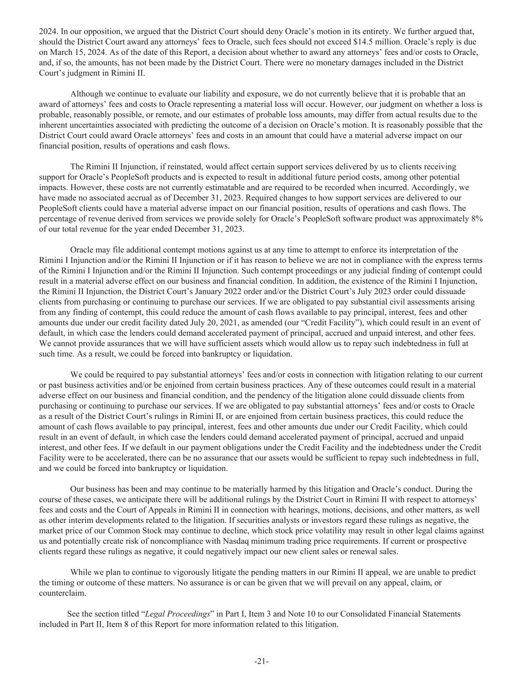 2024. In our opposition, we argued that the District Court should deny Oracle’s motion in its entirety. We further argued that, should the District Court award any attorneys’ fees to Oracle, such fees should not exceed $14.5 million. Oracle’s reply is due on March 15, 2024. As of the date of this Report, a decision about whether to award any attorneys’ fees and/or costs to Oracle, and, if so, the amounts, has not been made by the District Court. There were no monetary damages included in the District Court’s judgment in Rimini II. Although we continue to evaluate our liability and exposure, we do not currently believe that it is probable that an award of attorneys’ fees and costs to Oracle representing a material loss will occur. However, our judgment on whether a loss is probable, reasonably possible, or remote, and our estimates of probable loss amounts, may differ from actual results due to the inherent uncertainties associated with predicting the outcome of a decision on Oracle’s motion. It is reasonably possible that the District Court could award Oracle attorneys’ fees and costs in an amount that could have a material adverse impact on our financial position, results of operations and cash flows. The Rimini II Injunction, if reinstated, would affect certain support services delivered by us to clients receiving support for Oracle’s PeopleSoft products and is expected to result in additional future period costs, among other potential impacts. However, these costs are not currently estimatable and are required to be recorded when incurred. Accordingly, we have made no associated accrual as of December 31, 2023. Required changes to how support services are delivered to our PeopleSoft clients could have a material adverse impact on our financial position, results of operations and cash flows. The percentage of revenue derived from services we provide solely for Oracle’s PeopleSoft software product was approximately 8% of our total revenue for the year ended December 31, 2023. Oracle may file additional contempt motions against us at any time to attempt to enforce its interpretation of the Rimini I Injunction and/or the Rimini II Injunction or if it has reason to believe we are not in compliance with the express terms of the Rimini I Injunction and/or the Rimini II Injunction. Such contempt proceedings or any judicial finding of contempt could result in a material adverse effect on our business and financial condition. In addition, the existence of the Rimini I Injunction, the Rimini II Injunction, the District Court’s January 2022 order and/or the District Court’s July 2023 order could dissuade clients from purchasing or continuing to purchase our services. If we are obligated to pay substantial civil assessments arising from any finding of contempt, this could reduce the amount of cash flows available to pay principal, interest, fees and other amounts due under our credit facility dated July 20, 2021, as amended (our “Credit Facility”), which could result in an event of default, in which case the lenders could demand accelerated payment of principal, accrued and unpaid interest, and other fees. We cannot provide assurances that we will have sufficient assets which would allow us to repay such indebtedness in full at such time. As a result, we could be forced into bankruptcy or liquidation. We could be required to pay substantial attorneys’ fees and/or costs in connection with litigation relating to our current or past business activities and/or be enjoined from certain business practices. Any of these outcomes could result in a material adverse effect on our business and financial condition, and the pendency of the litigation alone could dissuade clients from purchasing or continuing to purchase our services. If we are obligated to pay substantial attorneys’ fees and/or costs to Oracle as a result of the District Court’s rulings in Rimini II, or are enjoined from certain business practices, this could reduce the amount of cash flows available to pay principal, interest, fees and other amounts due under our Credit Facility, which could result in an event of default, in which case the lenders could demand accelerated payment of principal, accrued and unpaid interest, and other fees. If we default in our payment obligations under the Credit Facility and the indebtedness under the Credit Facility were to be accelerated, there can be no assurance that our assets would be sufficient to repay such indebtedness in full, and we could be forced into bankruptcy or liquidation. Our business has been and may continue to be materially harmed by this litigation and Oracle’s conduct. During the course of these cases, we anticipate there will be additional rulings by the District Court in Rimini II with respect to attorneys’ fees and costs and the Court of Appeals in Rimini II in connection with hearings, motions, decisions, and other matters, as well as other interim developments related to the litigation. If securities analysts or investors regard these rulings as negative, the market price of our Common Stock may continue to decline, which stock price volatility may result in other legal claims against us and potentially create risk of noncompliance with Nasdaq minimum trading price requirements. If current or prospective clients regard these rulings as negative, it could negatively impact our new client sales or renewal sales. While we plan to continue to vigorously litigate the pending matters in our Rimini II appeal, we are unable to predict the timing or outcome of these matters. No assurance is or can be given that we will prevail on any appeal, claim, or counterclaim. See the section titled “Legal Proceedings” in Part I, Item 3 and Note 10 to our Consolidated Financial Statements included in Part II, Item 8 of this Report for more information related to this litigation. -21-