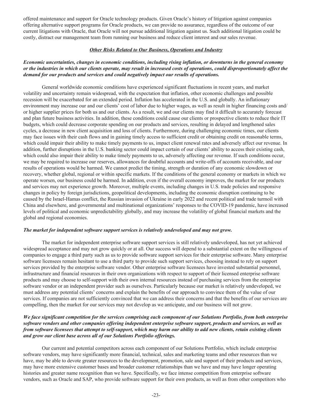 offered maintenance and support for Oracle technology products. Given Oracle’s history of litigation against companies offering alternative support programs for Oracle products, we can provide no assurance, regardless of the outcome of our current litigations with Oracle, that Oracle will not pursue additional litigation against us. Such additional litigation could be costly, distract our management team from running our business and reduce client interest and our sales revenue. Other Risks Related to Our Business, Operations and Industry Economic uncertainties, changes in economic conditions, including rising inflation, or downturns in the general economy or the industries in which our clients operate, may result in increased costs of operations, could disproportionately affect the demand for our products and services and could negatively impact our results of operations. General worldwide economic conditions have experienced significant fluctuations in recent years, and market volatility and uncertainty remain widespread, with the expectation that inflation, other economic challenges and possible recession will be exacerbated for an extended period. Inflation has accelerated in the U.S. and globally. An inflationary environment may increase our and our clients’ cost of labor due to higher wages, as well as result in higher financing costs and/ or higher supplier prices for both us and our clients. As a result, we and our clients may find it difficult to accurately forecast and plan future business activities. In addition, these conditions could cause our clients or prospective clients to reduce their IT budgets, which could decrease corporate spending on our products and services, resulting in delayed and lengthened sales cycles, a decrease in new client acquisition and loss of clients. Furthermore, during challenging economic times, our clients may face issues with their cash flows and in gaining timely access to sufficient credit or obtaining credit on reasonable terms, which could impair their ability to make timely payments to us, impact client renewal rates and adversely affect our revenue. In addition, further disruptions in the U.S. banking sector could impact certain of our clients’ ability to access their existing cash, which could also impair their ability to make timely payments to us, adversely affecting our revenue. If such conditions occur, we may be required to increase our reserves, allowances for doubtful accounts and write-offs of accounts receivable, and our results of operations would be harmed. We cannot predict the timing, strength or duration of any economic slowdown or recovery, whether global, regional or within specific markets. If the conditions of the general economy or markets in which we operate worsen, our business could be harmed. In addition, even if the overall economy improves, the market for our products and services may not experience growth. Moreover, multiple events, including changes in U.S. trade policies and responsive changes in policy by foreign jurisdictions, geopolitical developments, including the economic disruption continuing to be caused by the Israel-Hamas conflict, the Russian invasion of Ukraine in early 2022 and recent political and trade turmoil with China and elsewhere, and governmental and multinational organizations’ responses to the COVID-19 pandemic, have increased levels of political and economic unpredictability globally, and may increase the volatility of global financial markets and the global and regional economies. The market for independent software support services is relatively undeveloped and may not grow. The market for independent enterprise software support services is still relatively undeveloped, has not yet achieved widespread acceptance and may not grow quickly or at all. Our success will depend to a substantial extent on the willingness of companies to engage a third party such as us to provide software support services for their enterprise software. Many enterprise software licensees remain hesitant to use a third party to provide such support services, choosing instead to rely on support services provided by the enterprise software vendor. Other enterprise software licensees have invested substantial personnel, infrastructure and financial resources in their own organizations with respect to support of their licensed enterprise software products and may choose to self-support with their own internal resources instead of purchasing services from the enterprise software vendor or an independent provider such as ourselves. Particularly because our market is relatively undeveloped, we must address any potential clients’ concerns and explain the benefits of our approach to convince them of the value of our services. If companies are not sufficiently convinced that we can address their concerns and that the benefits of our services are compelling, then the market for our services may not develop as we anticipate, and our business will not grow. We face significant competition for the services comprising each component of our Solutions Portfolio, from both enterprise software vendors and other companies offering independent enterprise software support, products and services, as well as from software licensees that attempt to self-support, which may harm our ability to add new clients, retain existing clients and grow our client base across all of our Solutions Portfolio offerings. Our current and potential competitors across each component of our Solutions Portfolio, which include enterprise software vendors, may have significantly more financial, technical, sales and marketing teams and other resources than we have, may be able to devote greater resources to the development, promotion, sale and support of their products and services, may have more extensive customer bases and broader customer relationships than we have and may have longer operating histories and greater name recognition than we have. Sp