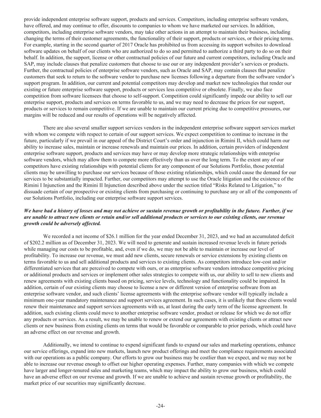 provide independent enterprise software support, products and services. Competitors, including enterprise software vendors, have offered, and may continue to offer, discounts to companies to whom we have marketed our services. In addition, competitors, including enterprise software vendors, may take other actions in an attempt to maintain their business, including changing the terms of their customer agreements, the functionality of their support, products or services, or their pricing terms. For example, starting in the second quarter of 2017 Oracle has prohibited us from accessing its support websites to download software updates on behalf of our clients who are authorized to do so and permitted to authorize a third party to do so on their behalf. In addition, the support, license or other contractual policies of our future and current competitors, including Oracle and SAP, may include clauses that penalize customers that choose to use our or any independent provider’s services or products. Further, the contractual policies of enterprise software vendors, such as Oracle and SAP, may contain clauses that penalize customers that seek to return to the software vendor to purchase new licenses following a departure from the software vendor’s support program. In addition, our current and potential competitors may develop and market new technologies that render our existing or future enterprise software support, products or services less competitive or obsolete. Finally, we also face competition from software licensees that choose to self-support. Competition could significantly impede our ability to sell our enterprise support, products and services on terms favorable to us, and we may need to decrease the prices for our support, products or services to remain competitive. If we are unable to maintain our current pricing due to competitive pressures, our margins will be reduced and our results of operations will be negatively affected. There are also several smaller support services vendors in the independent enterprise software support services market with whom we compete with respect to certain of our support services. We expect competition to continue to increase in the future, particularly if we prevail in our appeal of the District Court’s order and injunction in Rimini II, which could harm our ability to increase sales, maintain or increase renewals and maintain our prices. In addition, certain providers of independent enterprise software support, products and services may have or may develop more strategic relationships with enterprise software vendors, which may allow them to compete more effectively than us over the long term. To the extent any of our competitors have existing relationships with potential clients for any component of our Solutions Portfolio, those potential clients may be unwilling to purchase our services because of those existing relationships, which could cause the demand for our services to be substantially impacted. Further, our competitors may attempt to use the Oracle litigation and the existence of the Rimini I Injunction and the Rimini II Injunction described above under the section titled “Risks Related to Litigation,” to dissuade certain of our prospective or existing clients from purchasing or continuing to purchase any or all of the components of our Solutions Portfolio, including our enterprise software support services. We have had a history of losses and may not achieve or sustain revenue growth or profitability in the future. Further, if we are unable to attract new clients or retain and/or sell additional products or services to our existing clients, our revenue growth could be adversely affected. We recorded a net income of $26.1 million for the year ended December 31, 2023, and we had an accumulated deficit of $202.2 million as of December 31, 2023. We will need to generate and sustain increased revenue levels in future periods while managing our costs to be profitable, and, even if we do, we may not be able to maintain or increase our level of profitability. To increase our revenue, we must add new clients, secure renewals or service extensions by existing clients on terms favorable to us and sell additional products and services to existing clients. As competitors introduce low-cost and/or differentiated services that are perceived to compete with ours, or as enterprise software vendors introduce competitive pricing or additional products and services or implement other sales strategies to compete with us, our ability to sell to new clients and renew agreements with existing clients based on pricing, service levels, technology and functionality could be impaired. In addition, certain of our existing clients may choose to license a new or different version of enterprise software from an enterprise software vendor, and such clients’ license agreements with the enterprise software vendor will typically include a minimum one-year mandatory maintenance and support services agreement. In such cases, it is unlikely that these clients would renew their maintenance and support services agreements with us, at least during the early term of the license agreement. In addition, such existing clients could move to another enterprise software vendor, product or release for which we do not offer any products or services. As a result, we may be unable to renew or extend our agreements with existing clients or attract new clients or new business from existing clients on terms that would be favorable or comparable to prior periods, which could have an adverse effect on our revenue and growth. Additionally, we intend to continue to expend significant funds to expand our sales and marketing operations, enhance our service offerings, expand into new markets, launch new product offerings and meet the compliance requirements associated with our operations as a public company. Our efforts to grow our business may be costlier than we expect, and we may not b